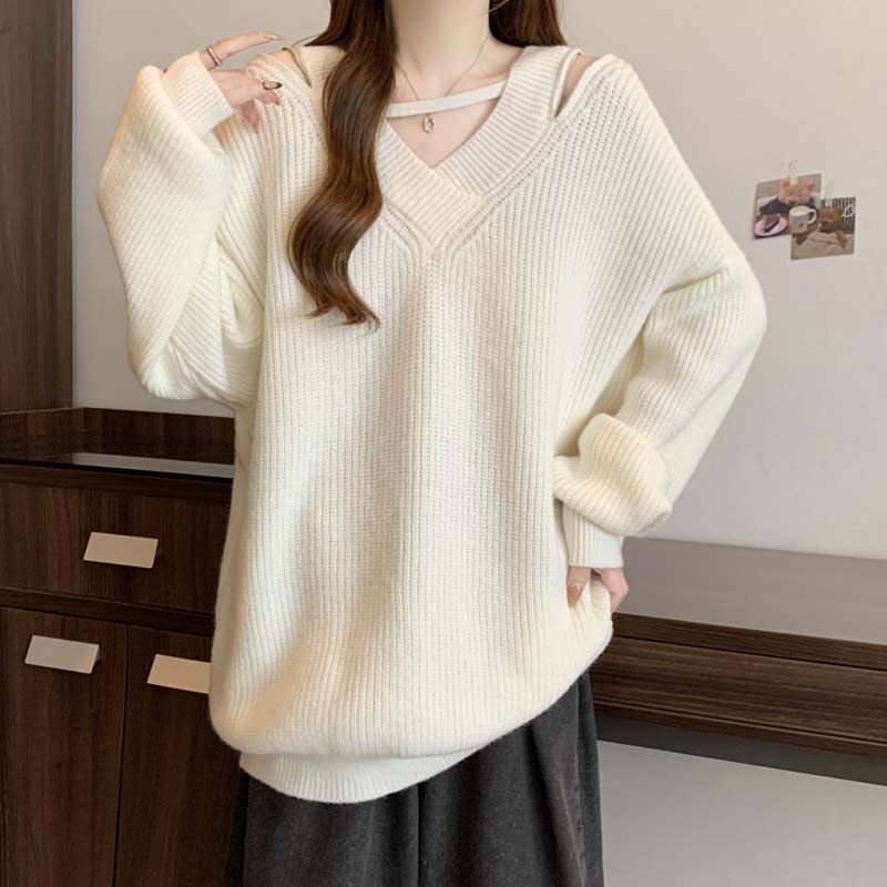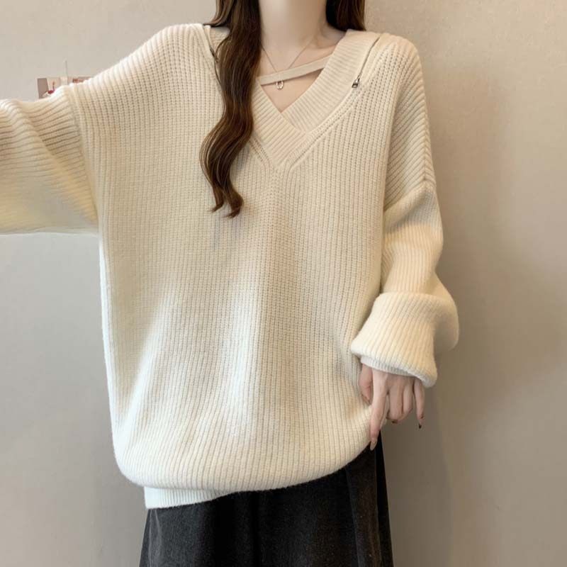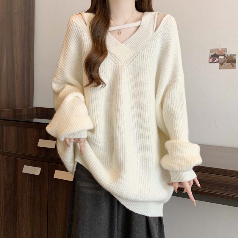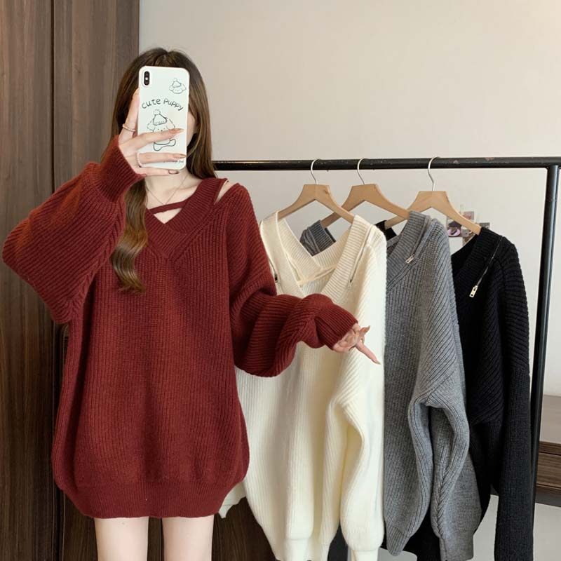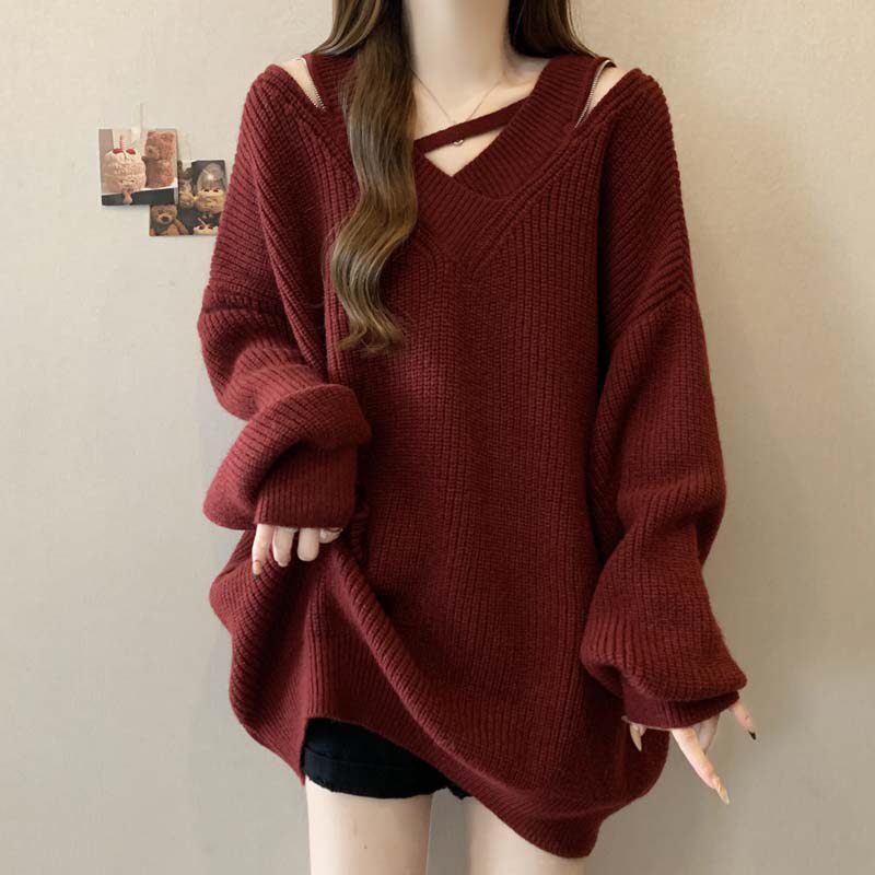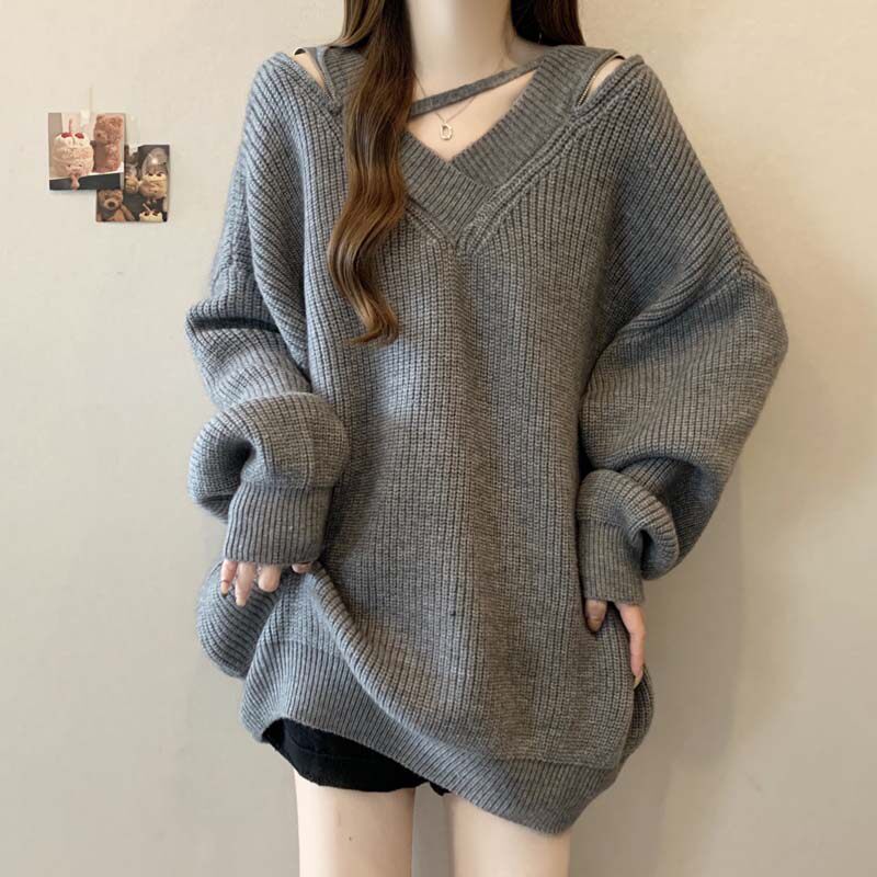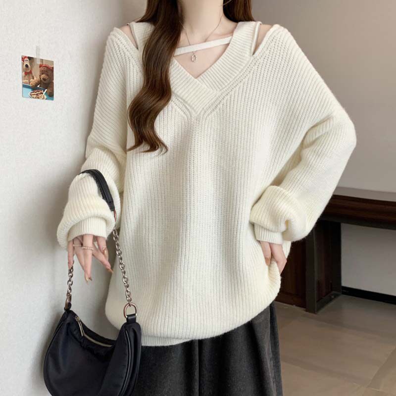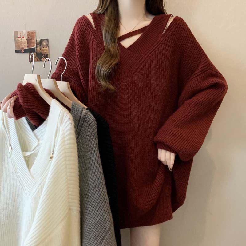 設計感鏤空露肩毛衣女春秋大碼胖mm下裝消失上衣慵懶風V領針織衫