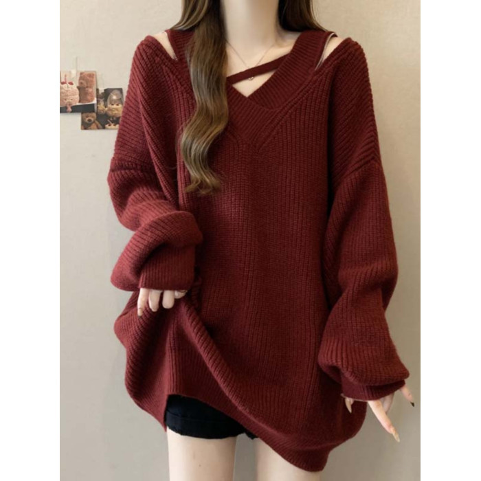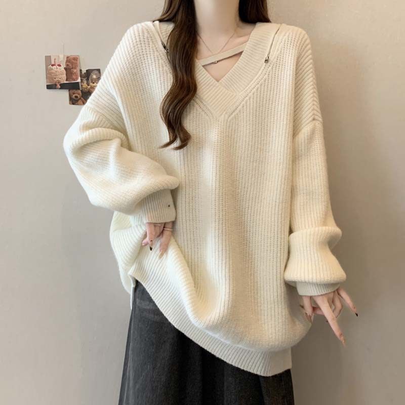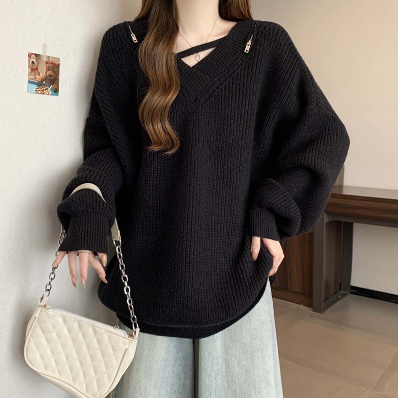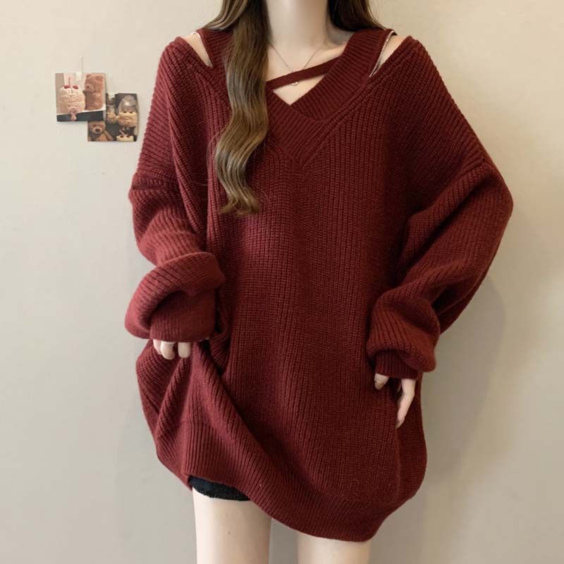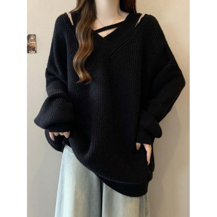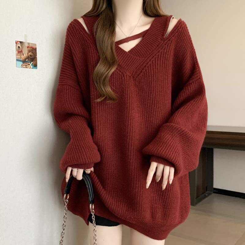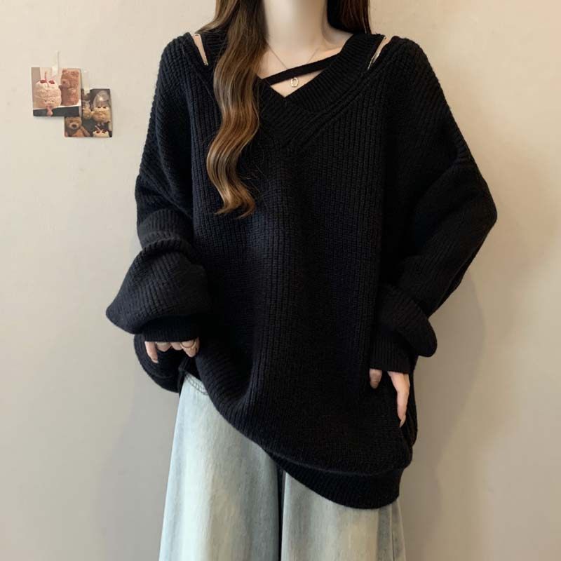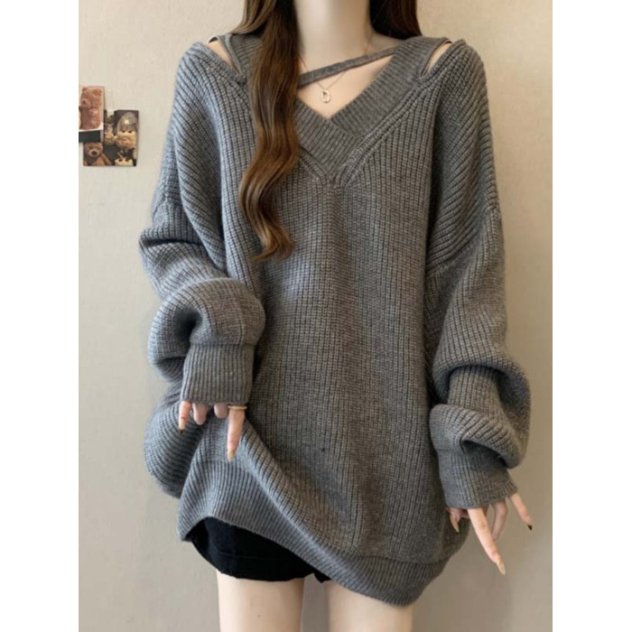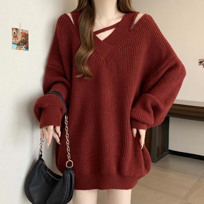 設計感鏤空露肩毛衣女春秋大碼胖mm下裝消失上衣慵懶風V領針織衫