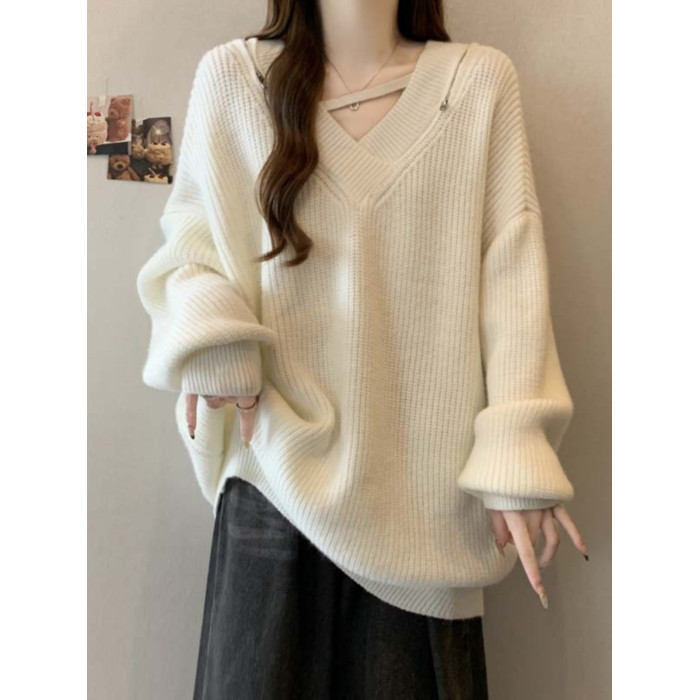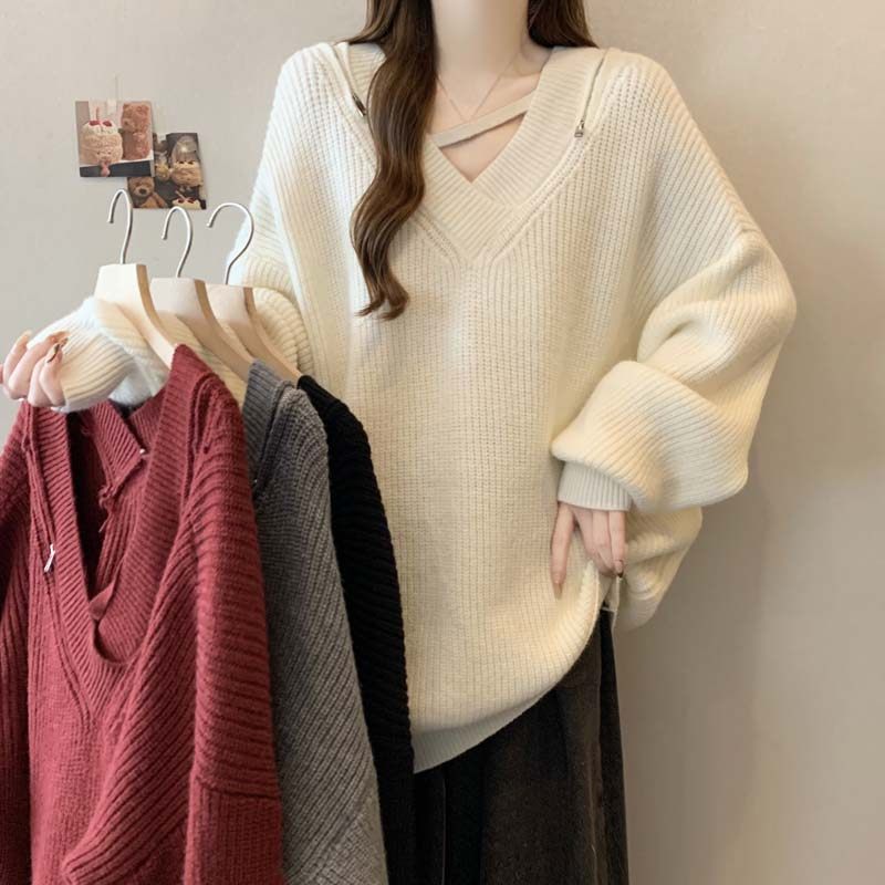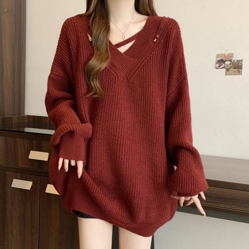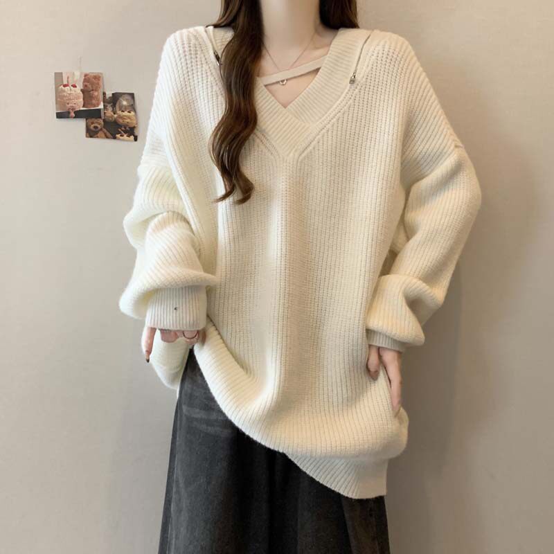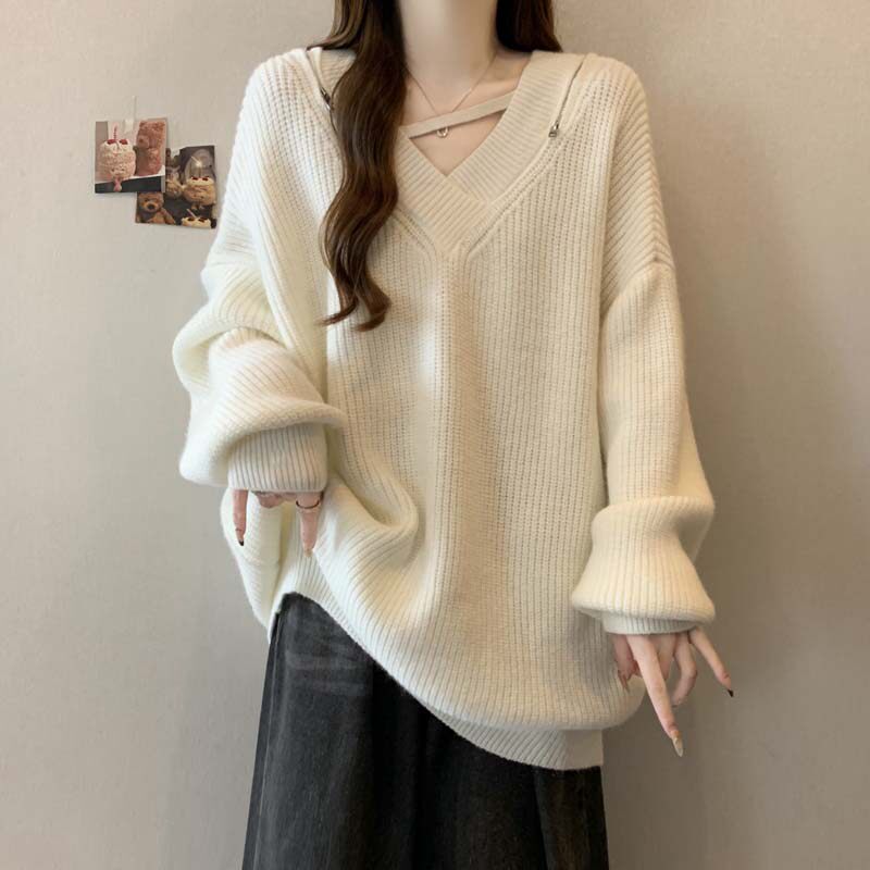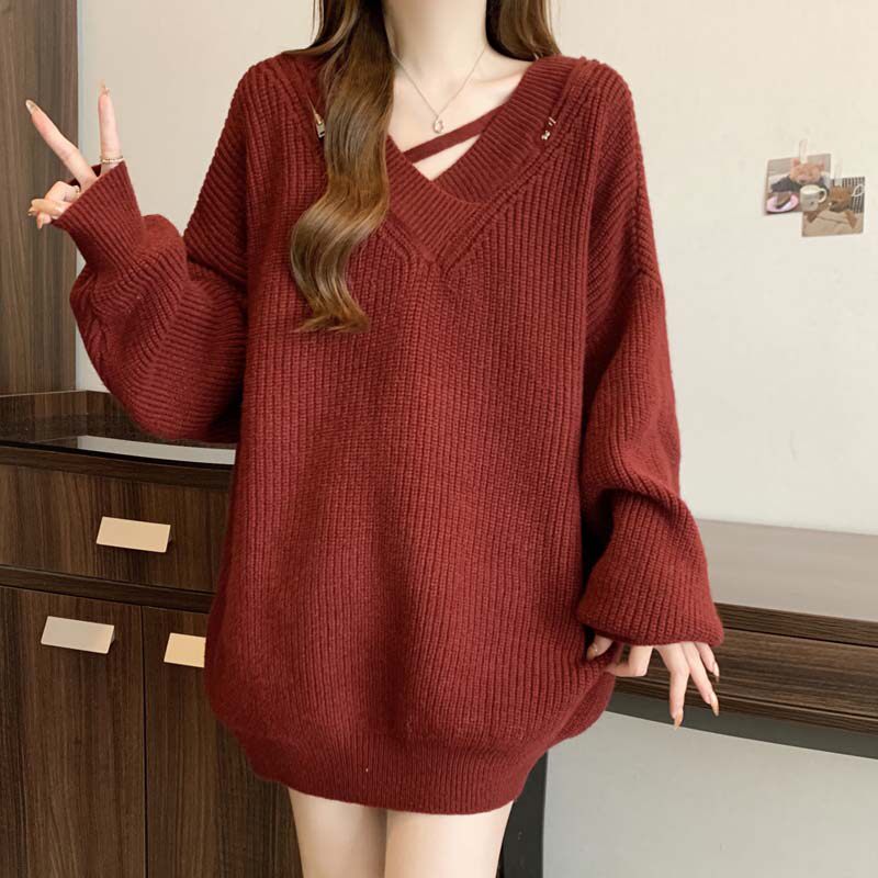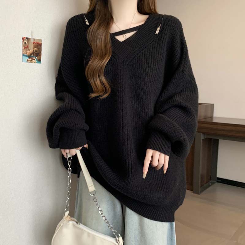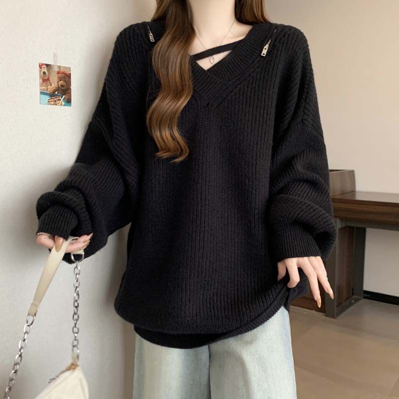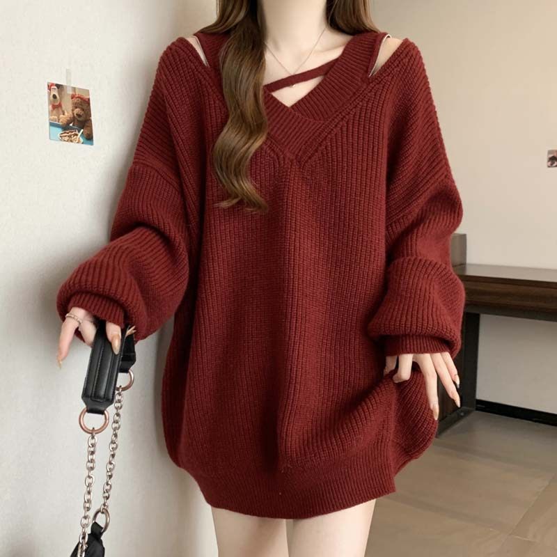 設計感鏤空露肩毛衣女春秋大碼胖mm下裝消失上衣慵懶風V領針織衫
