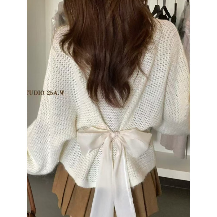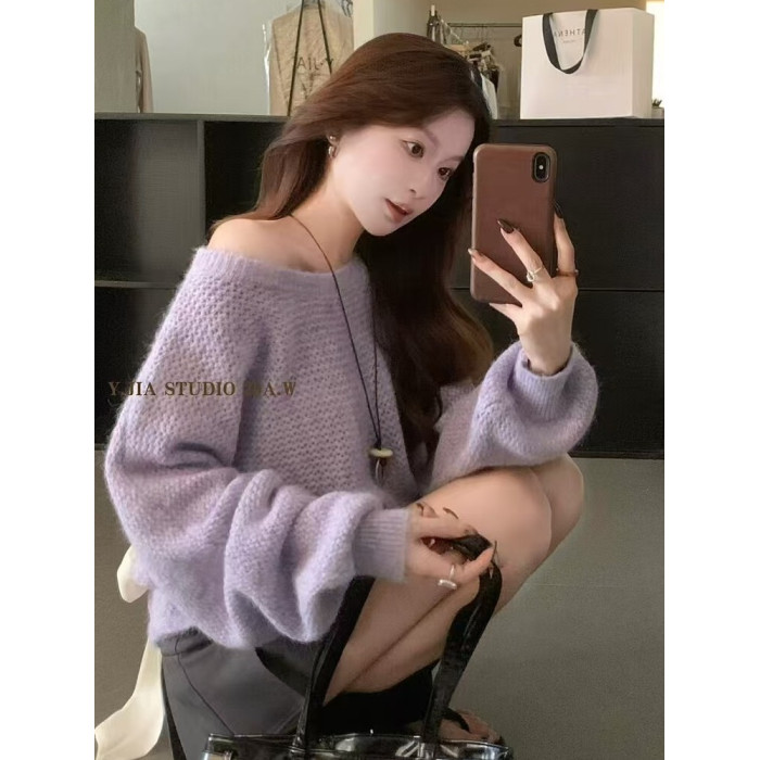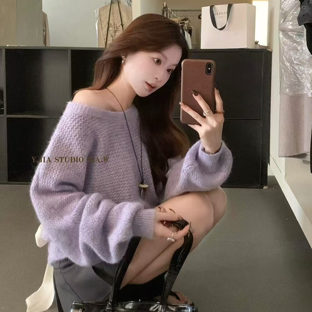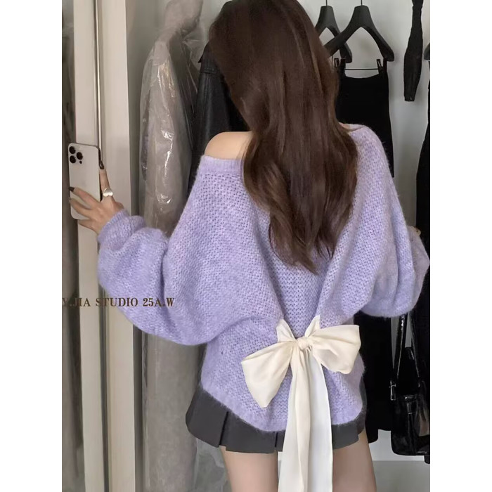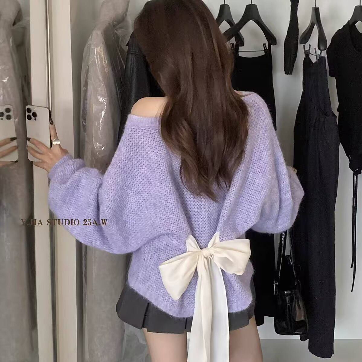 香芋紫斜肩軟糯針織衫女秋冬後背蝴蝶結綁帶毛衣寬松顯瘦慵懶上衣