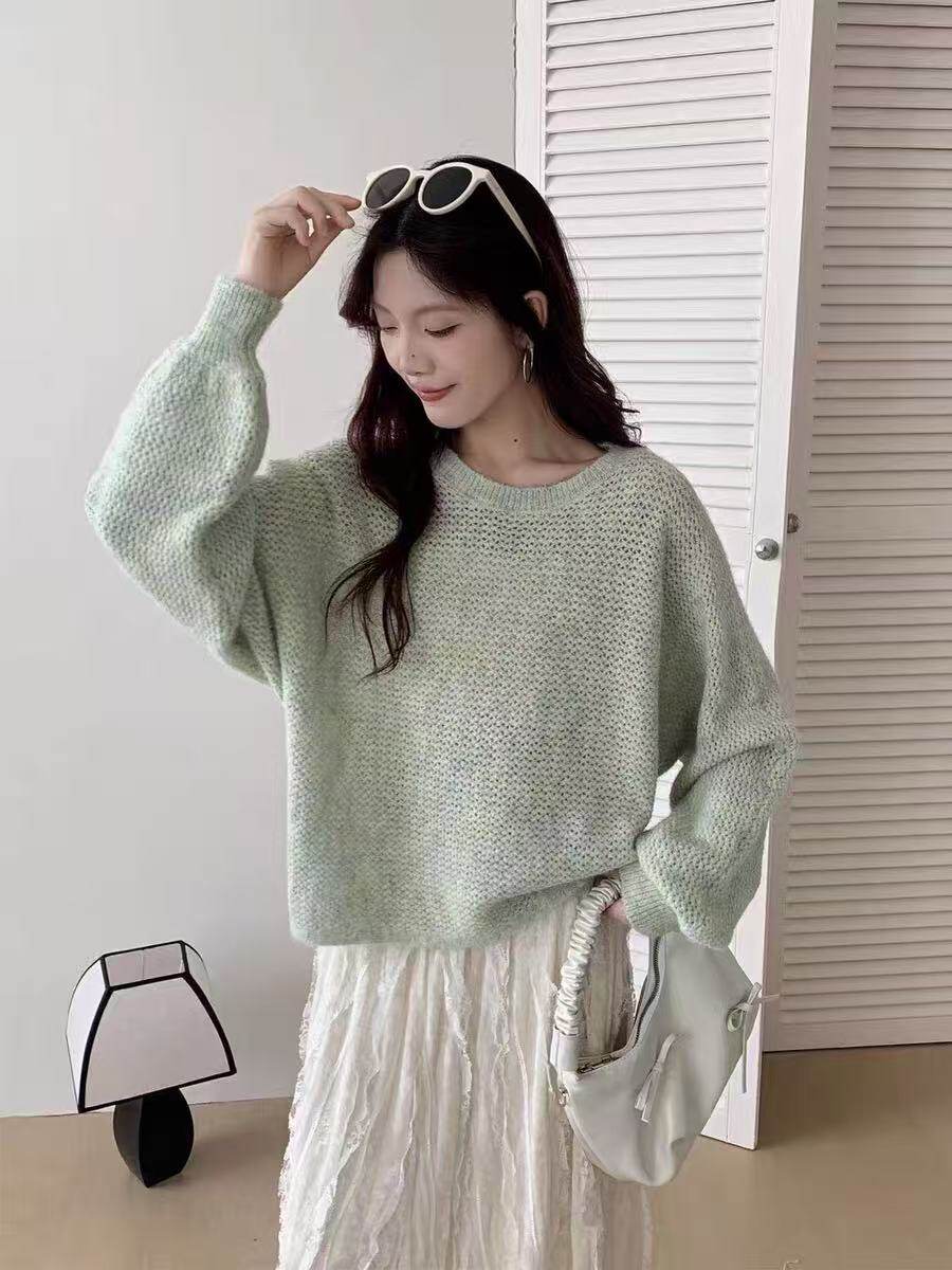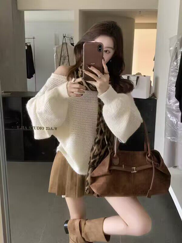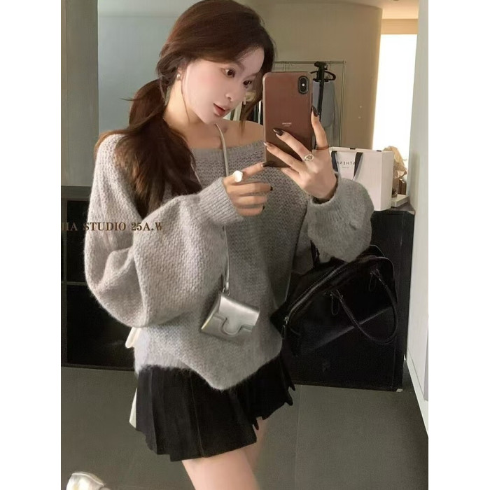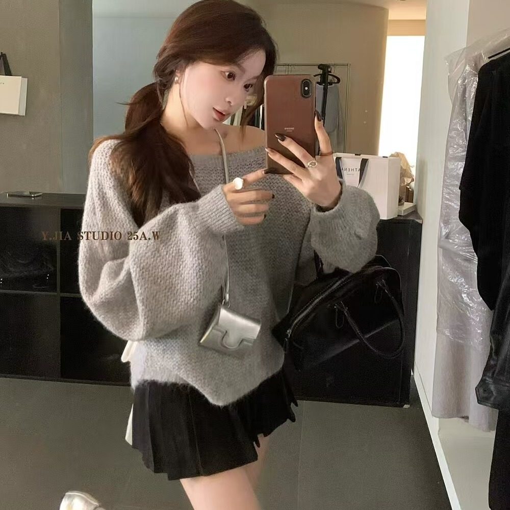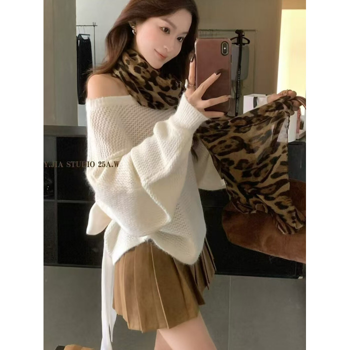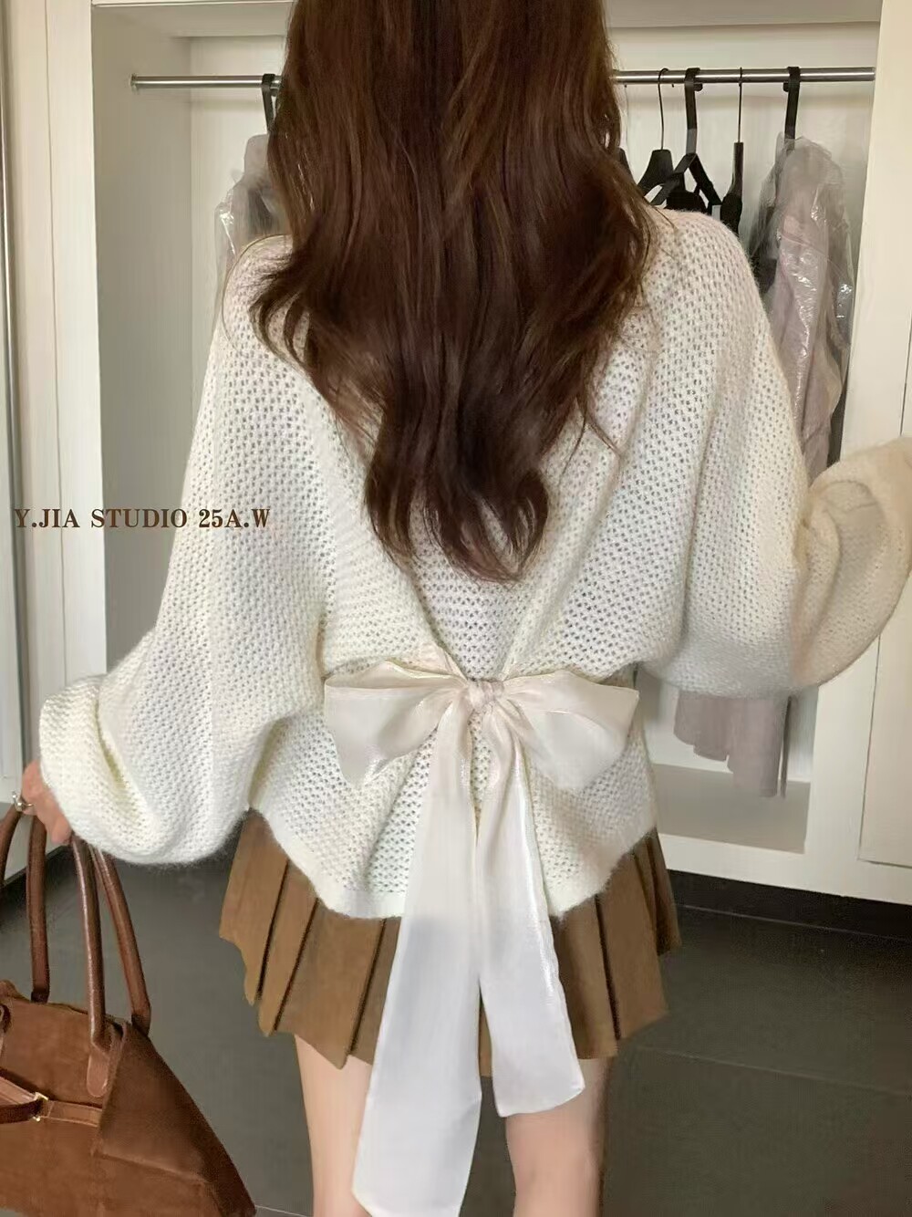 香芋紫斜肩軟糯針織衫女秋冬後背蝴蝶結綁帶毛衣寬松顯瘦慵懶上衣