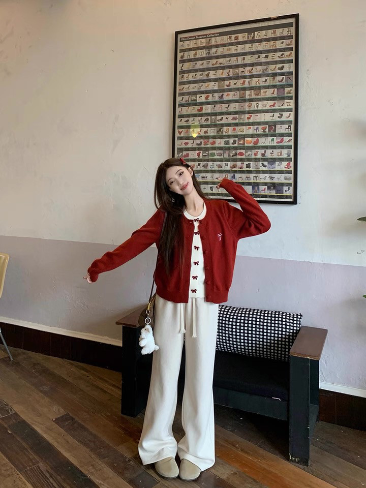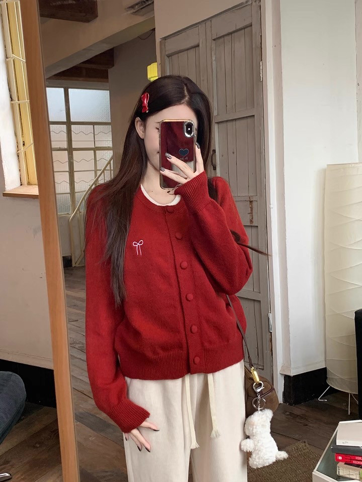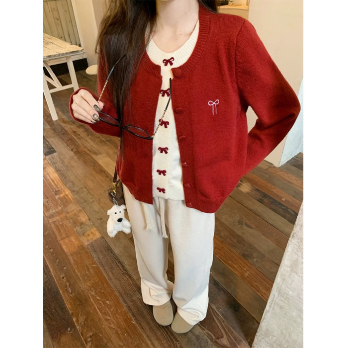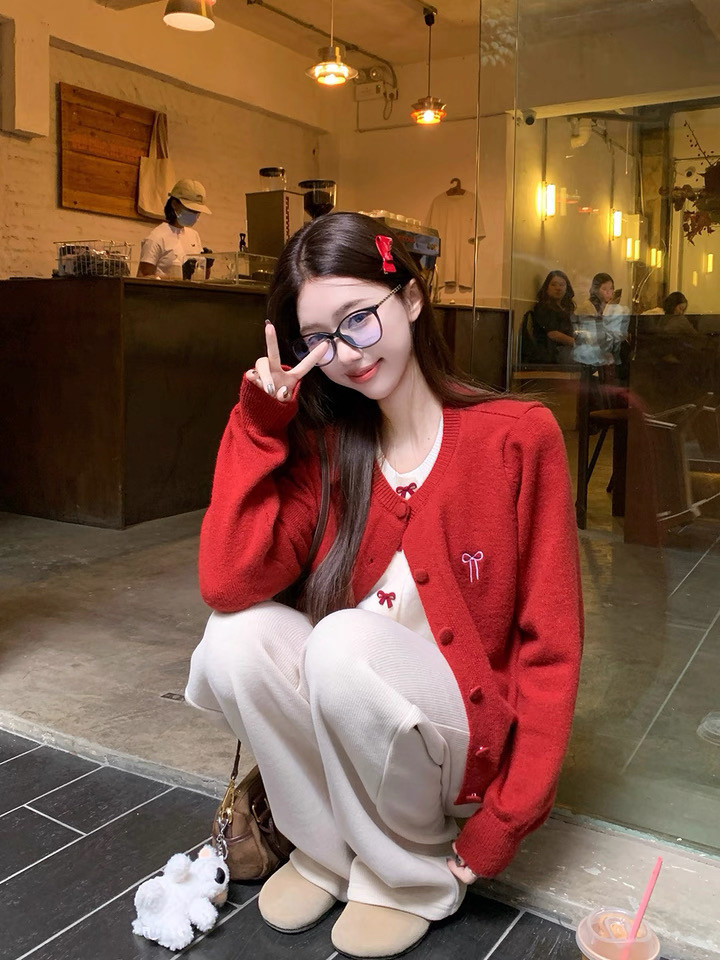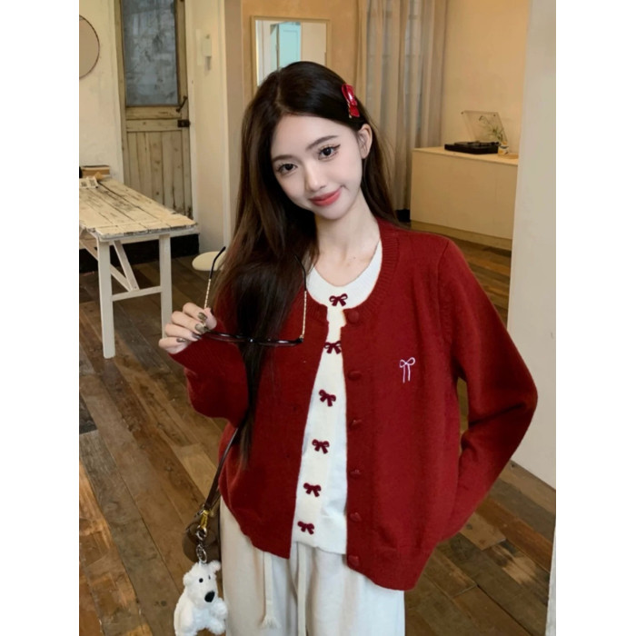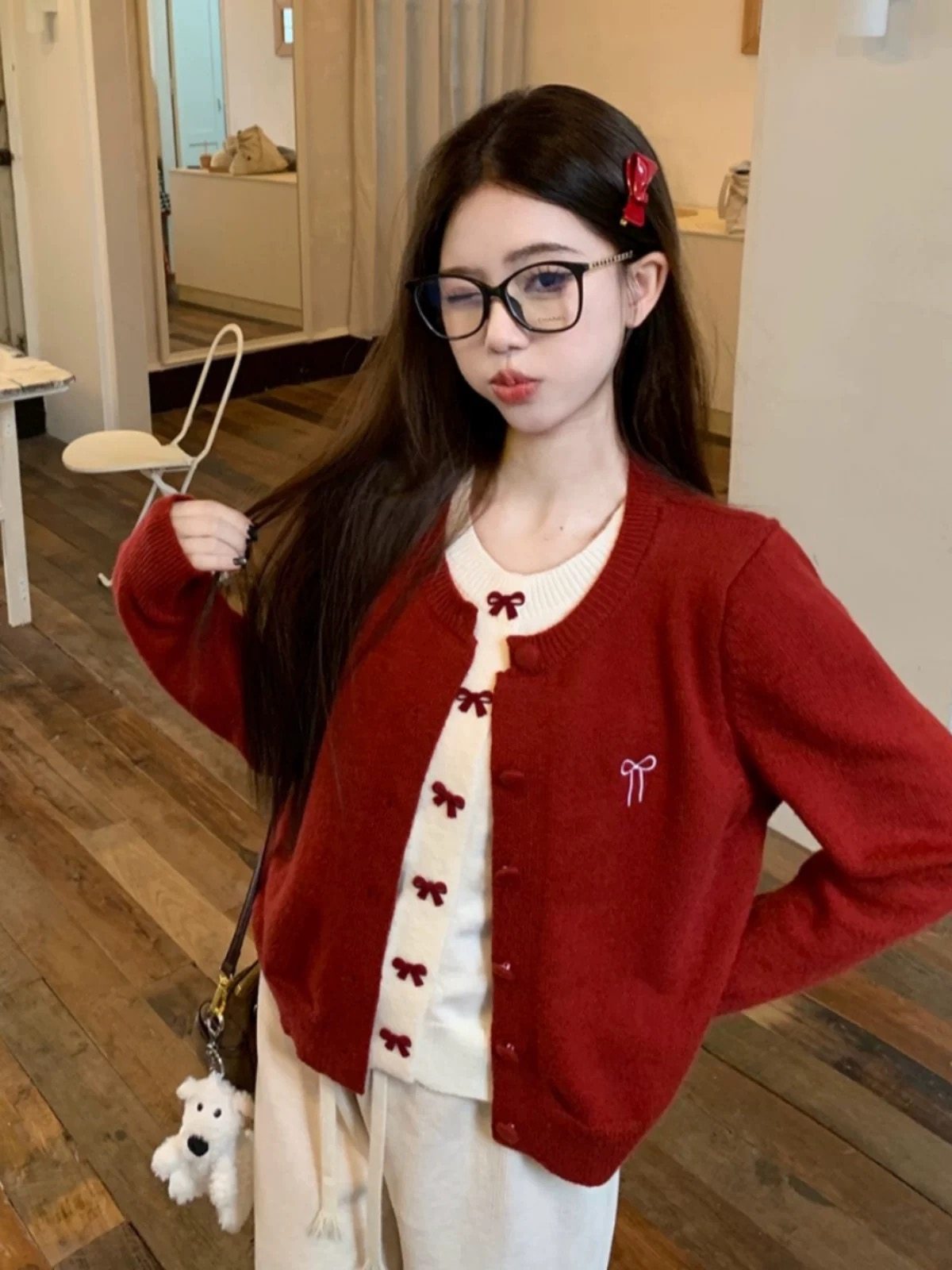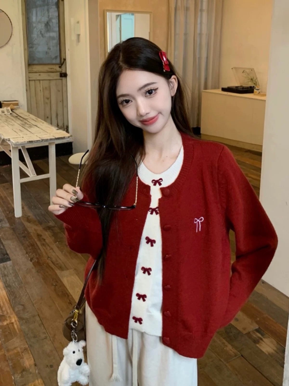 韓系蝴蝶結紅色假兩件開衫毛衣女秋冬2025新款松弛感慵懶風針織衫