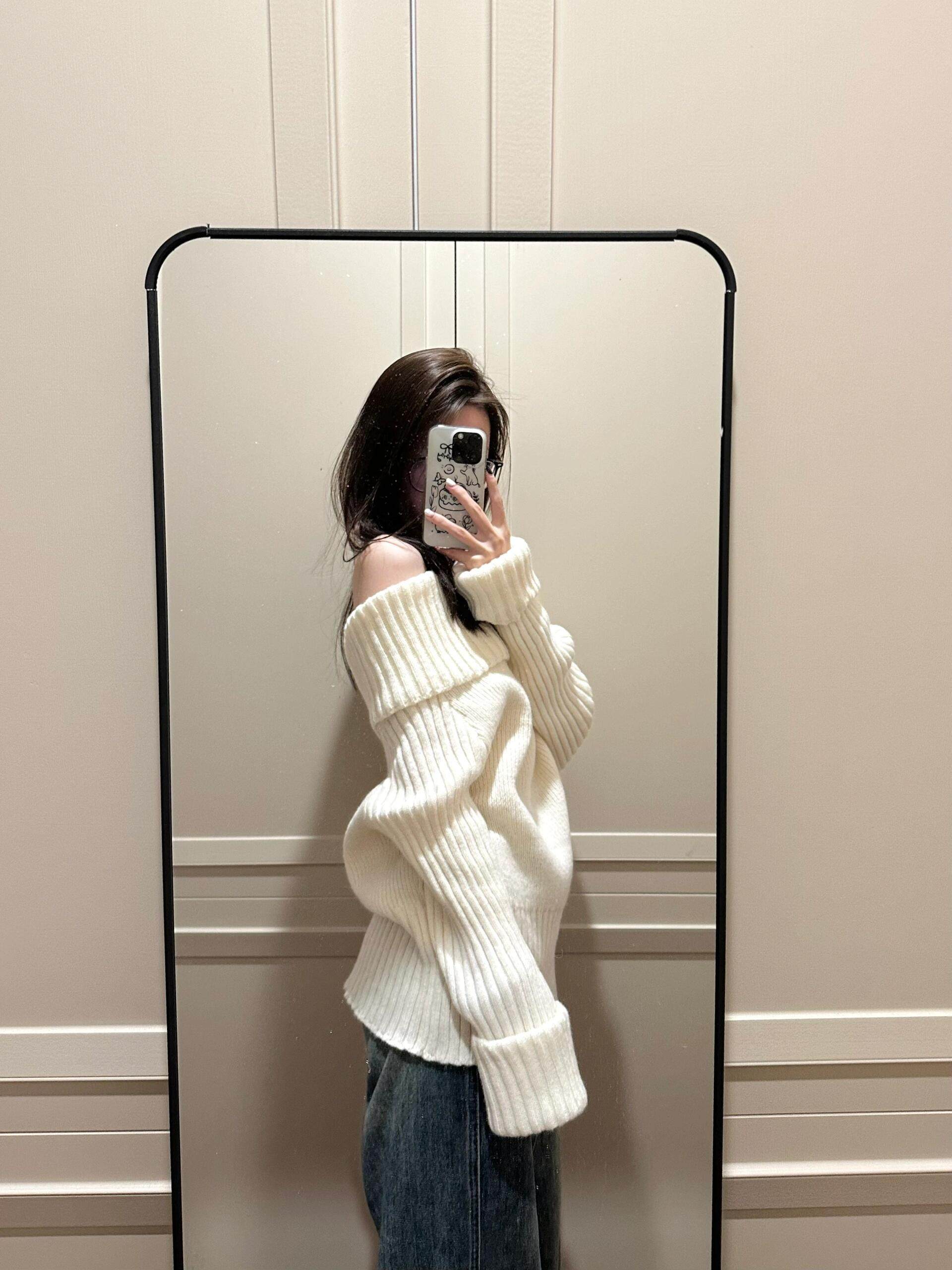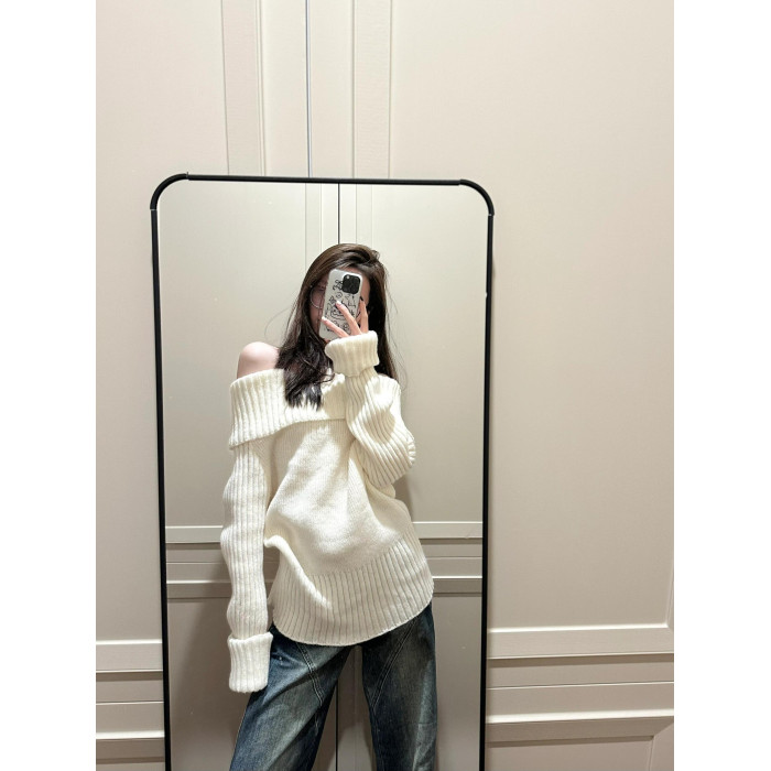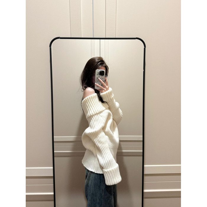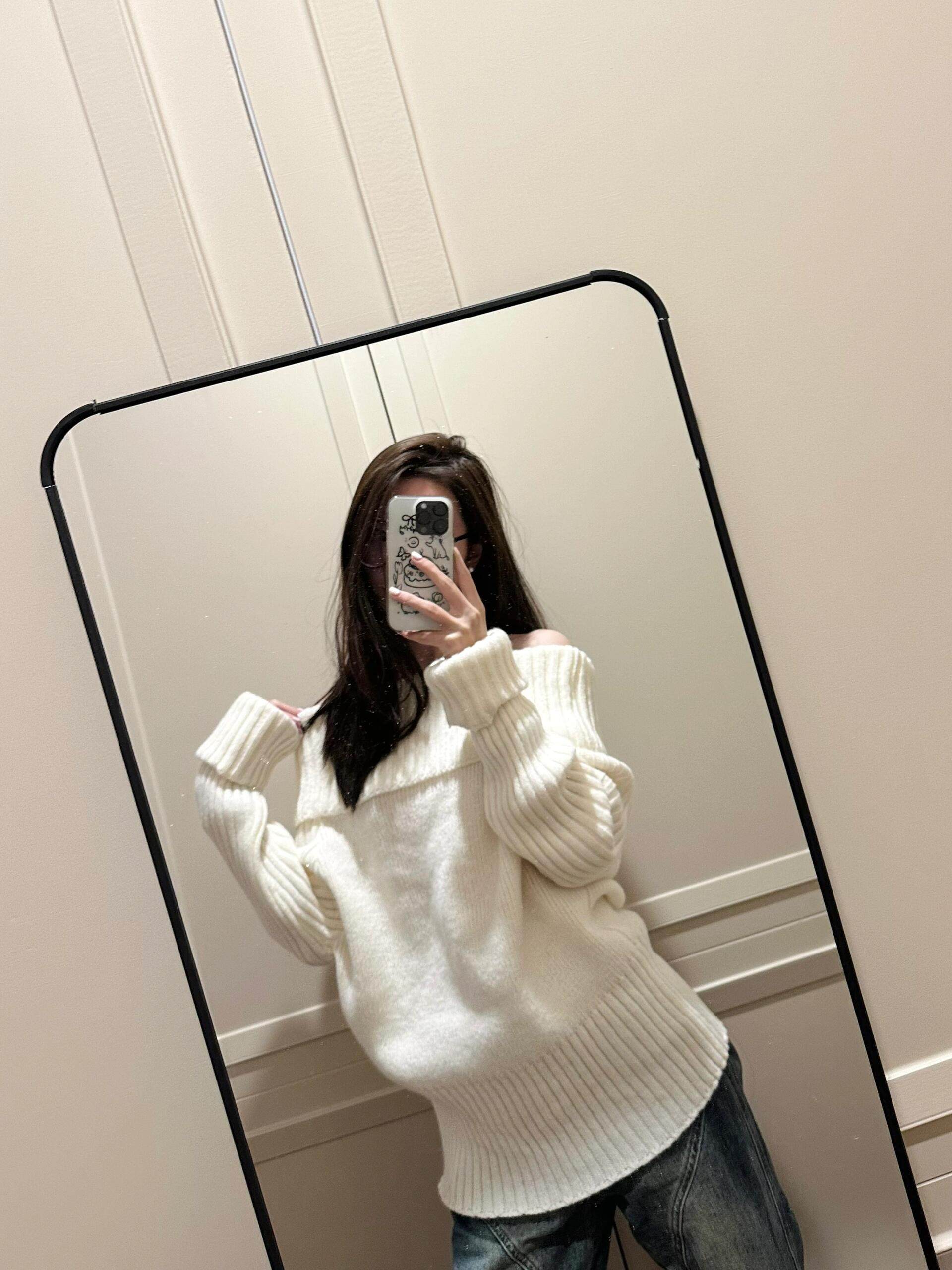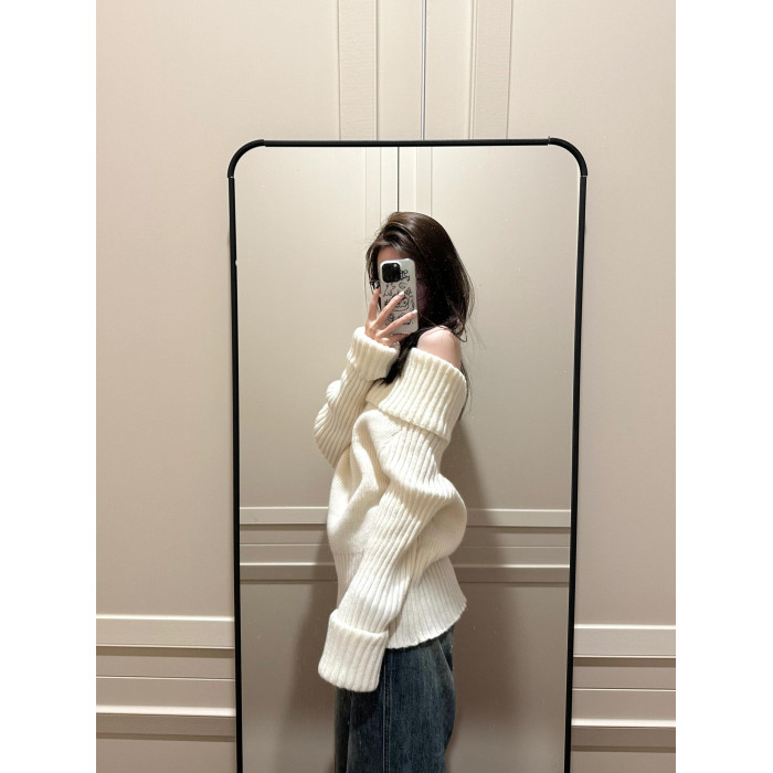 慵懶風白色一字肩毛衣女秋冬季2025新款內搭露肩針織韓系寬松上衣