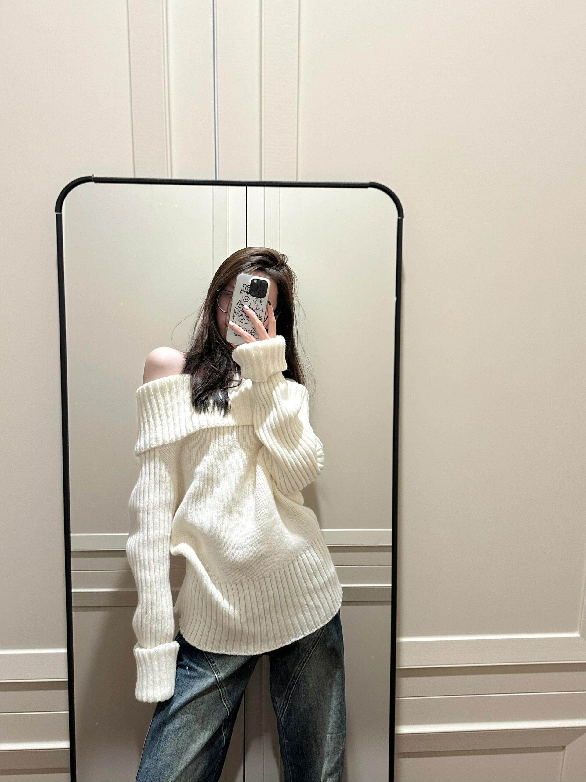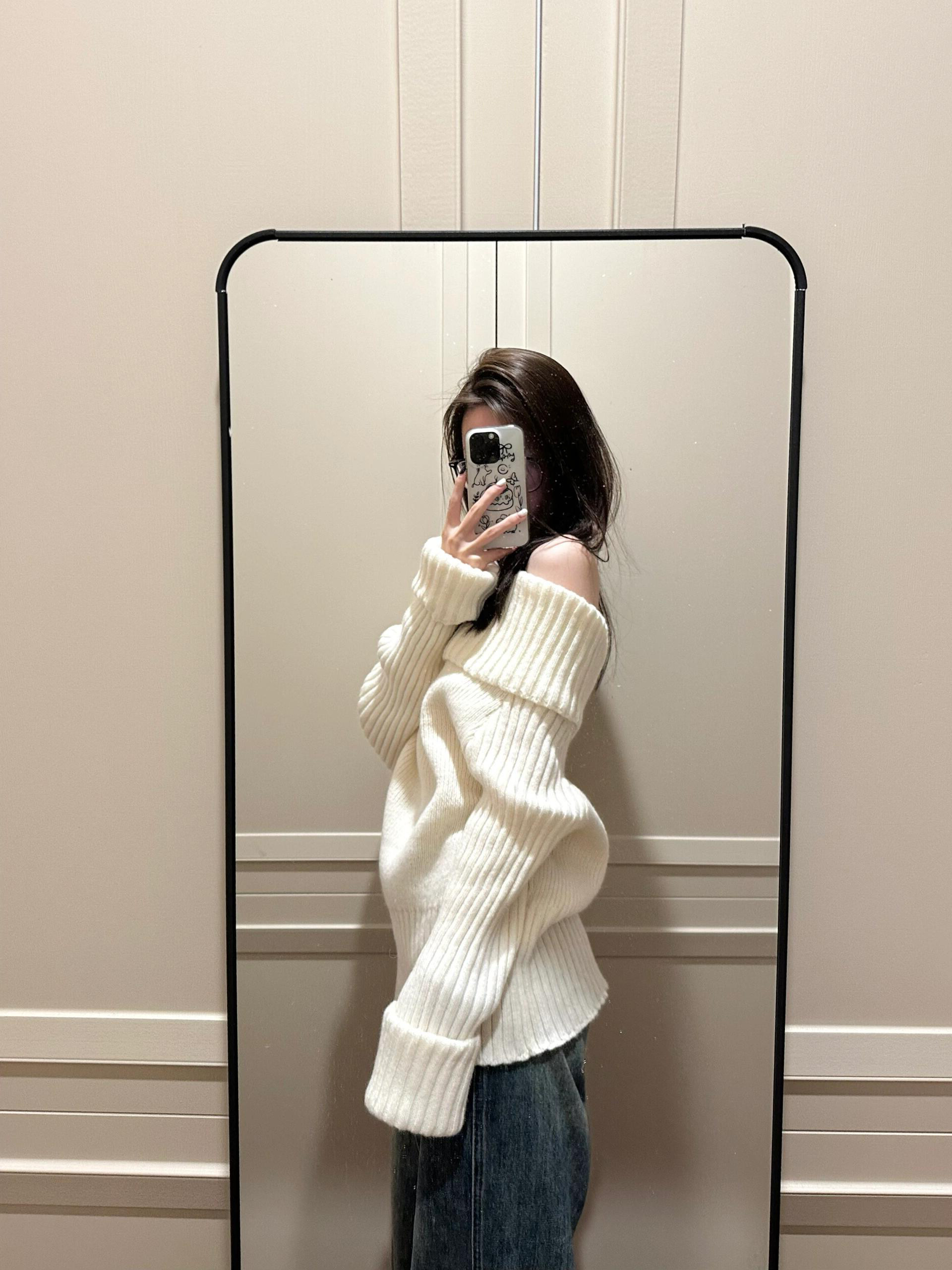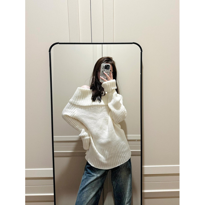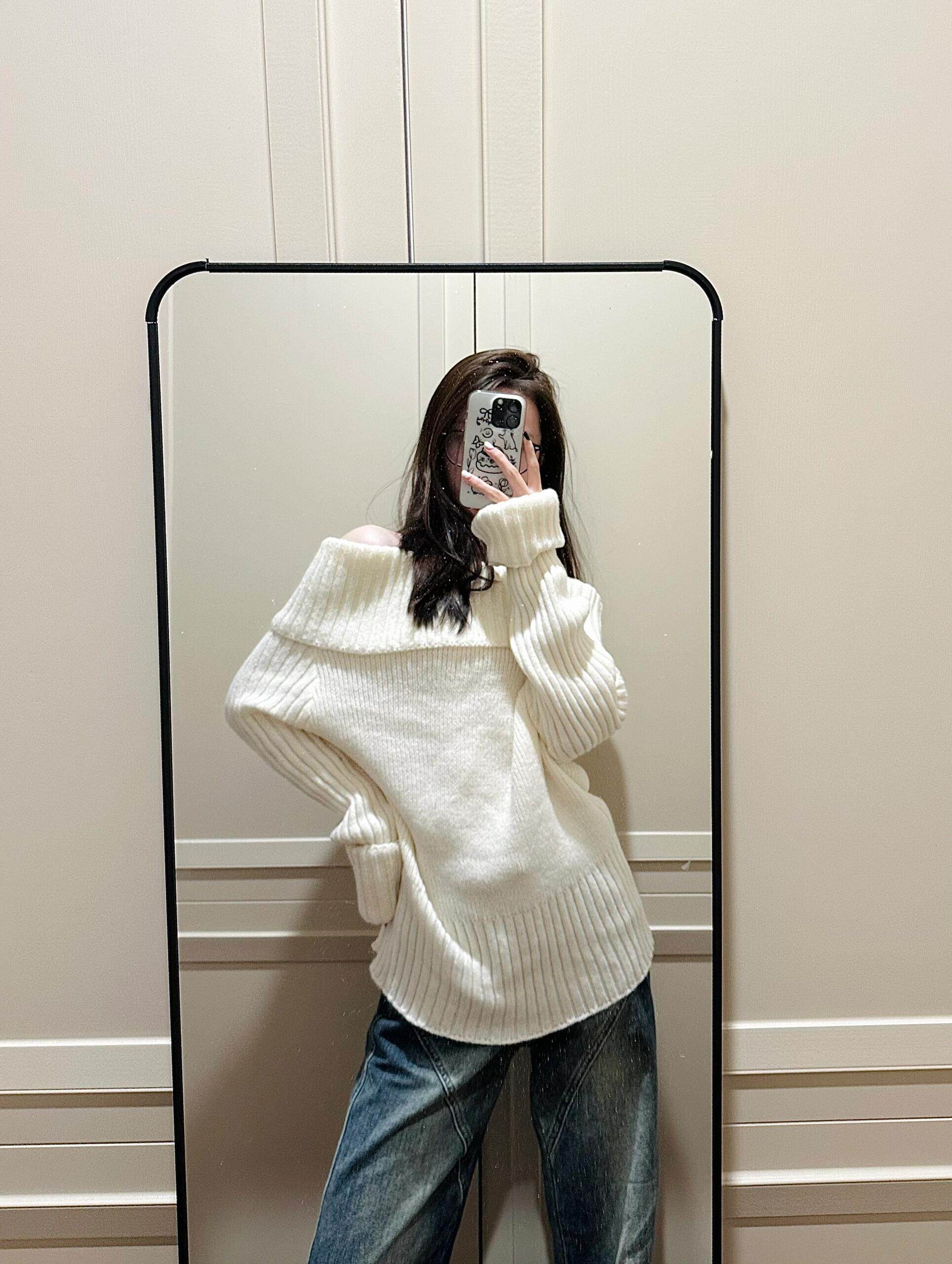 慵懶風白色一字肩毛衣女秋冬季2025新款內搭露肩針織韓系寬松上衣