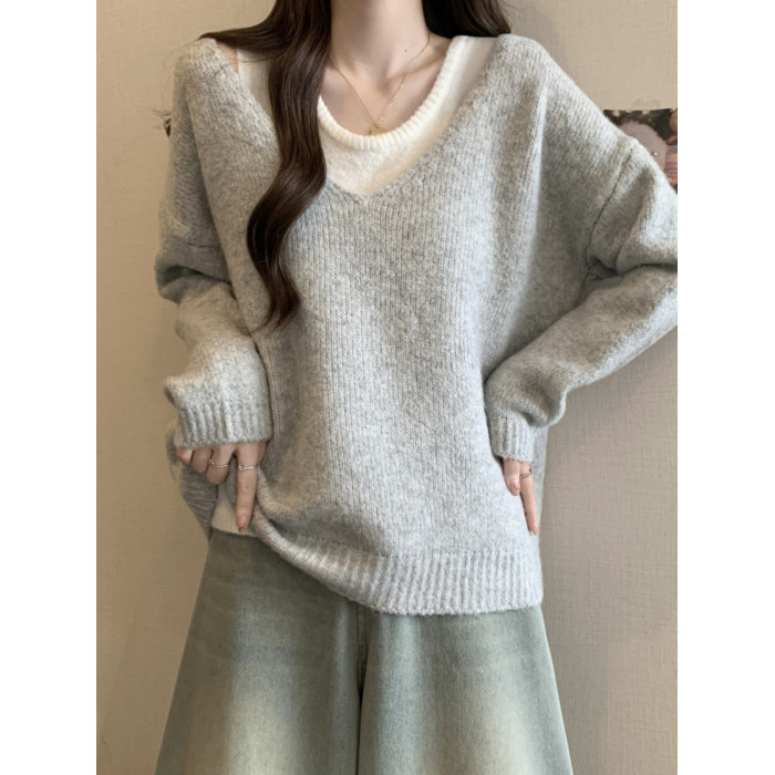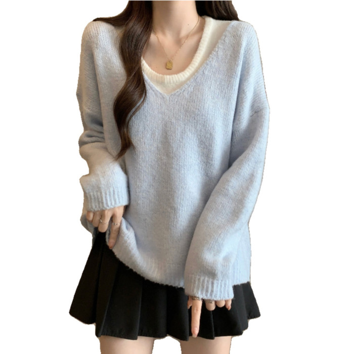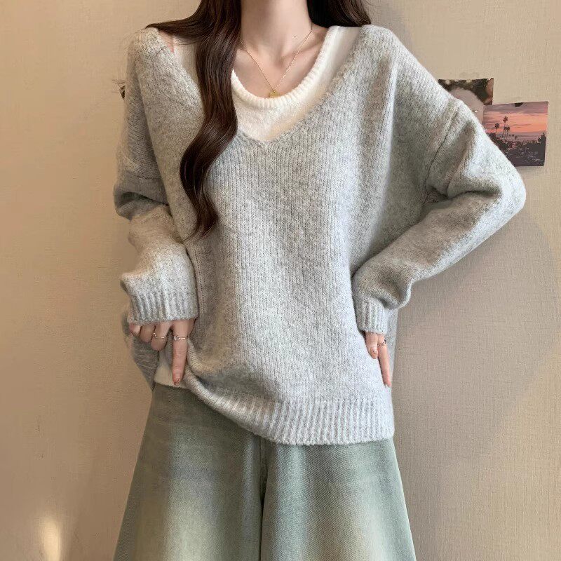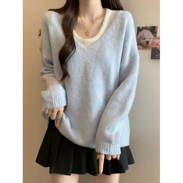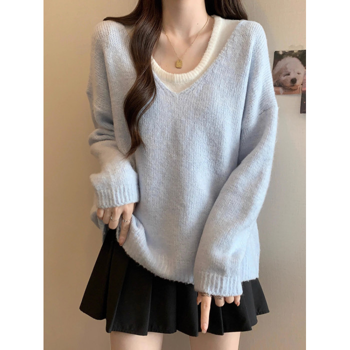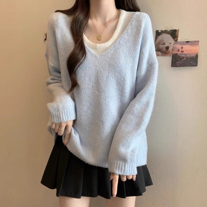 奶呼呼淺藍色V領針織衫軟糯毛衣女2025早秋裝大碼胖mm中長款上衣