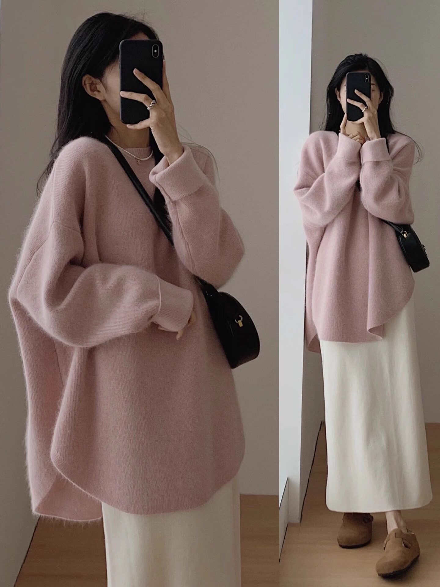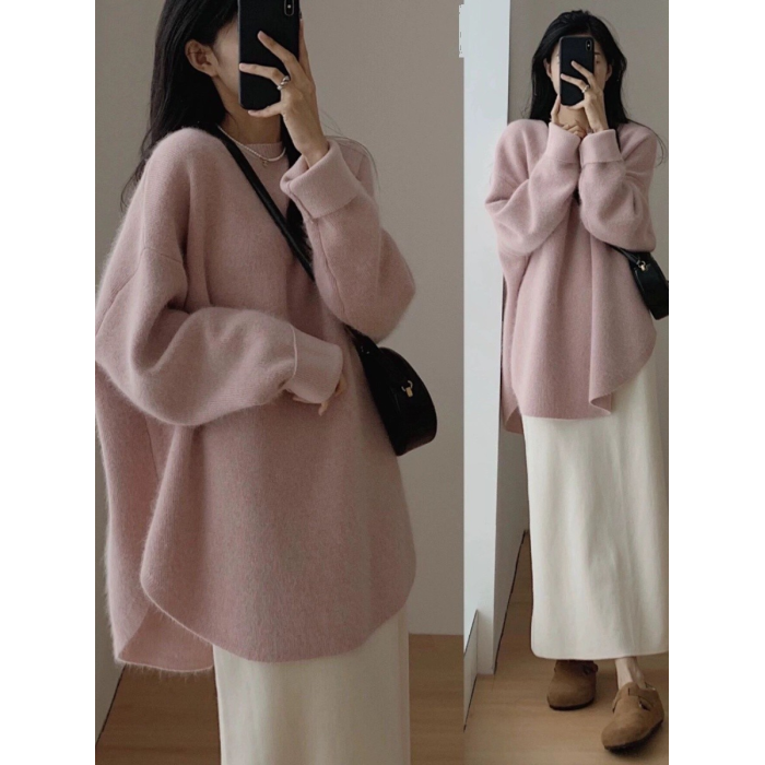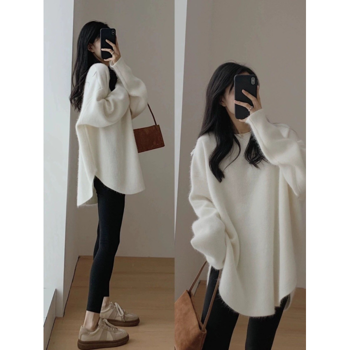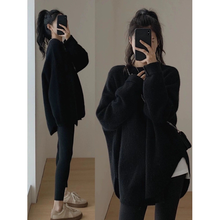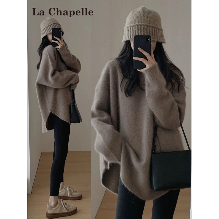 拉夏貝爾浣熊絨毛衣女外穿秋冬加厚日系慵懶上衣中長款開叉針織衫