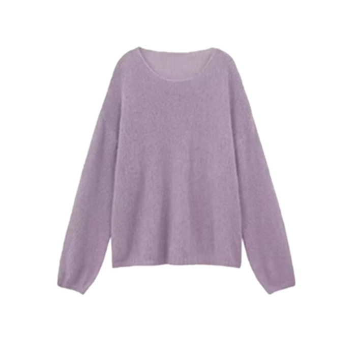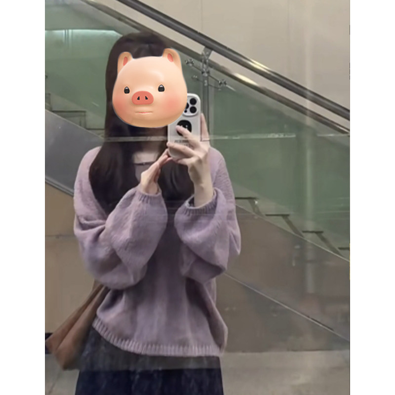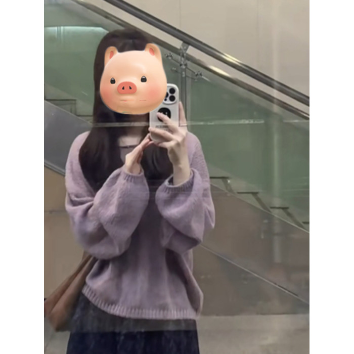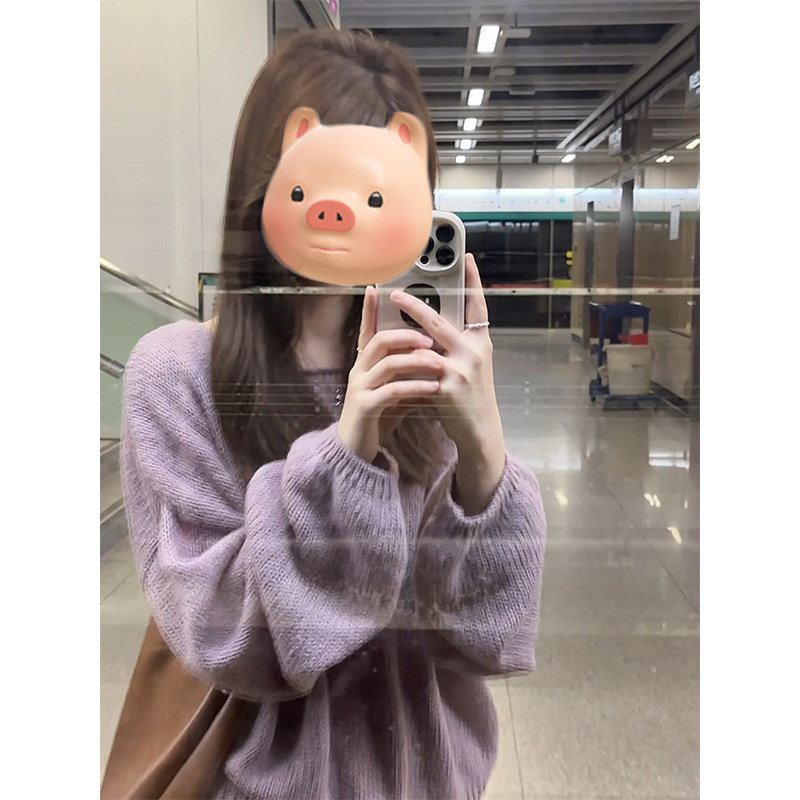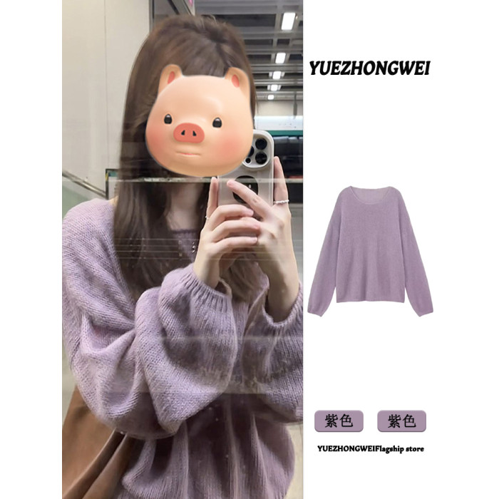 深秋初冬穿搭紫色圓領套頭軟糯毛衣女秋冬季寬松慵懶風針織衫上衣