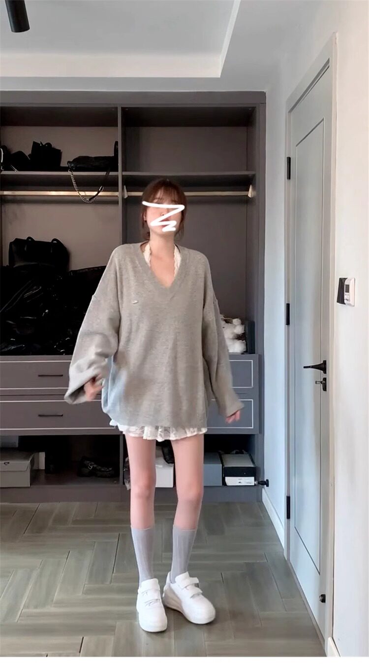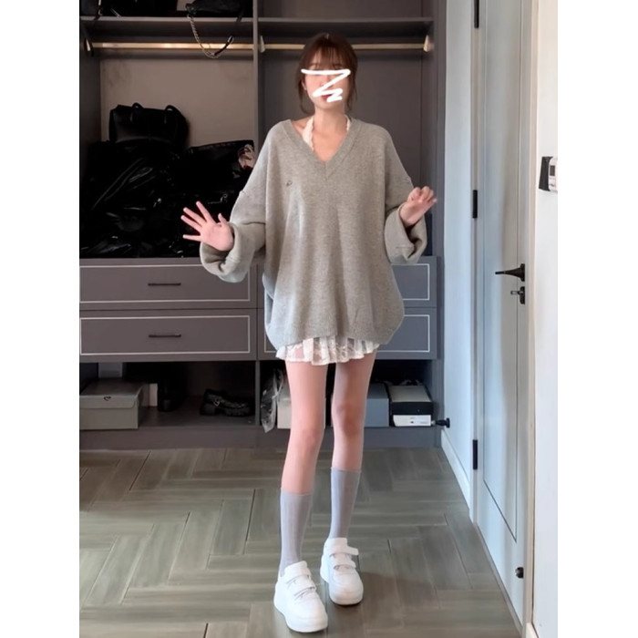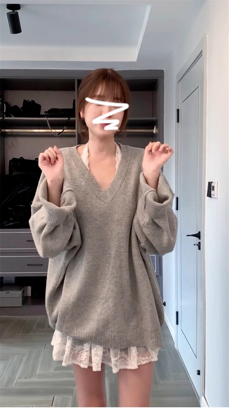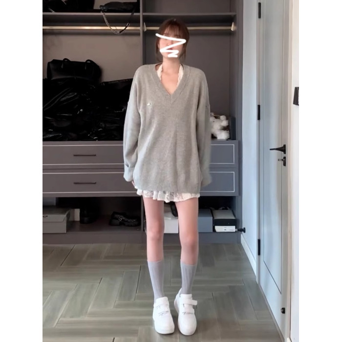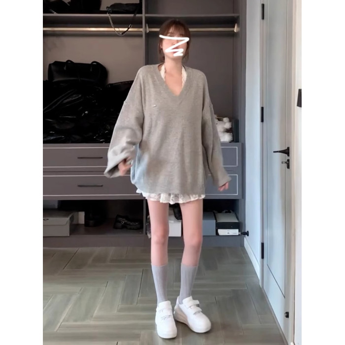 灰色慵懶風V領針織衫毛衣女早秋新款韓系寬松顯瘦高級感長袖上衣