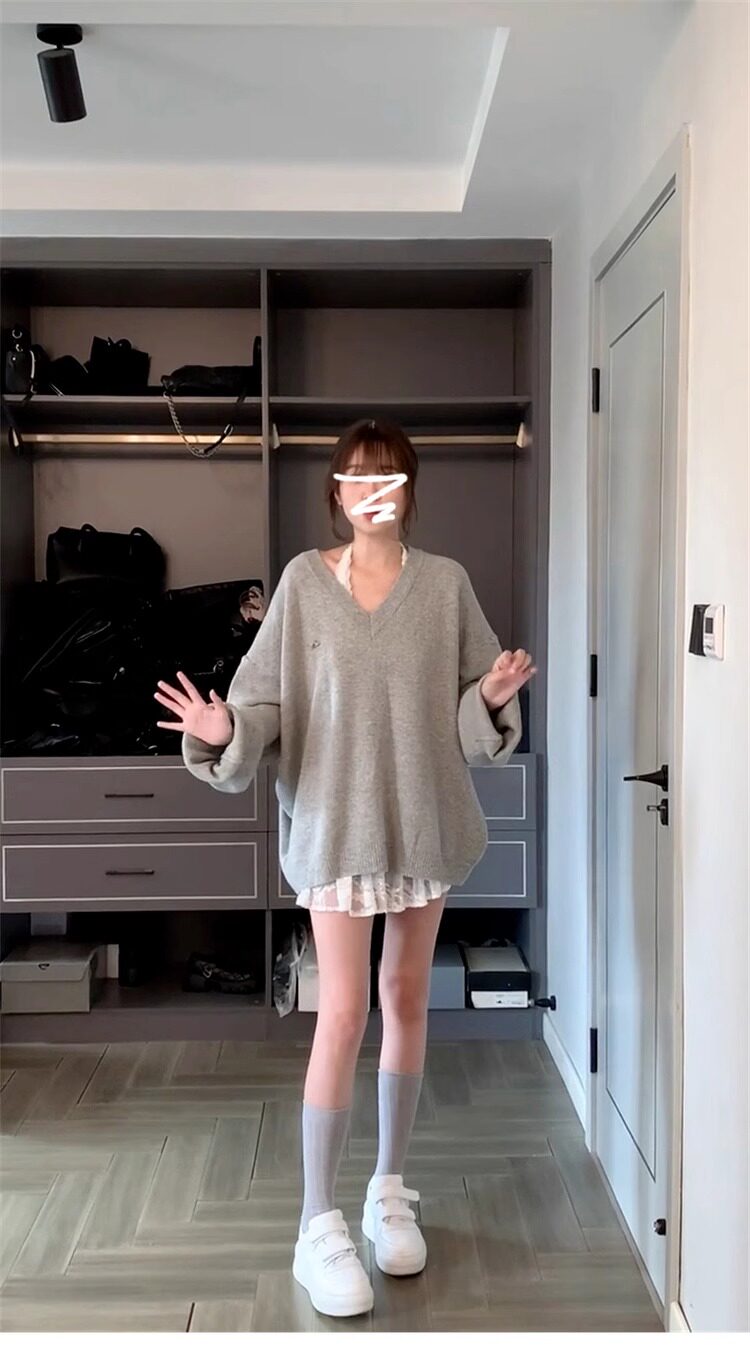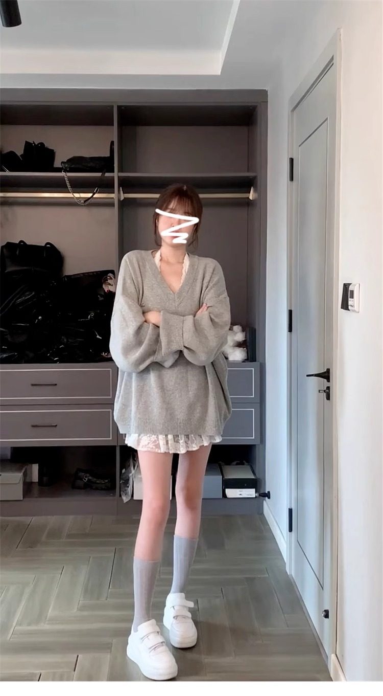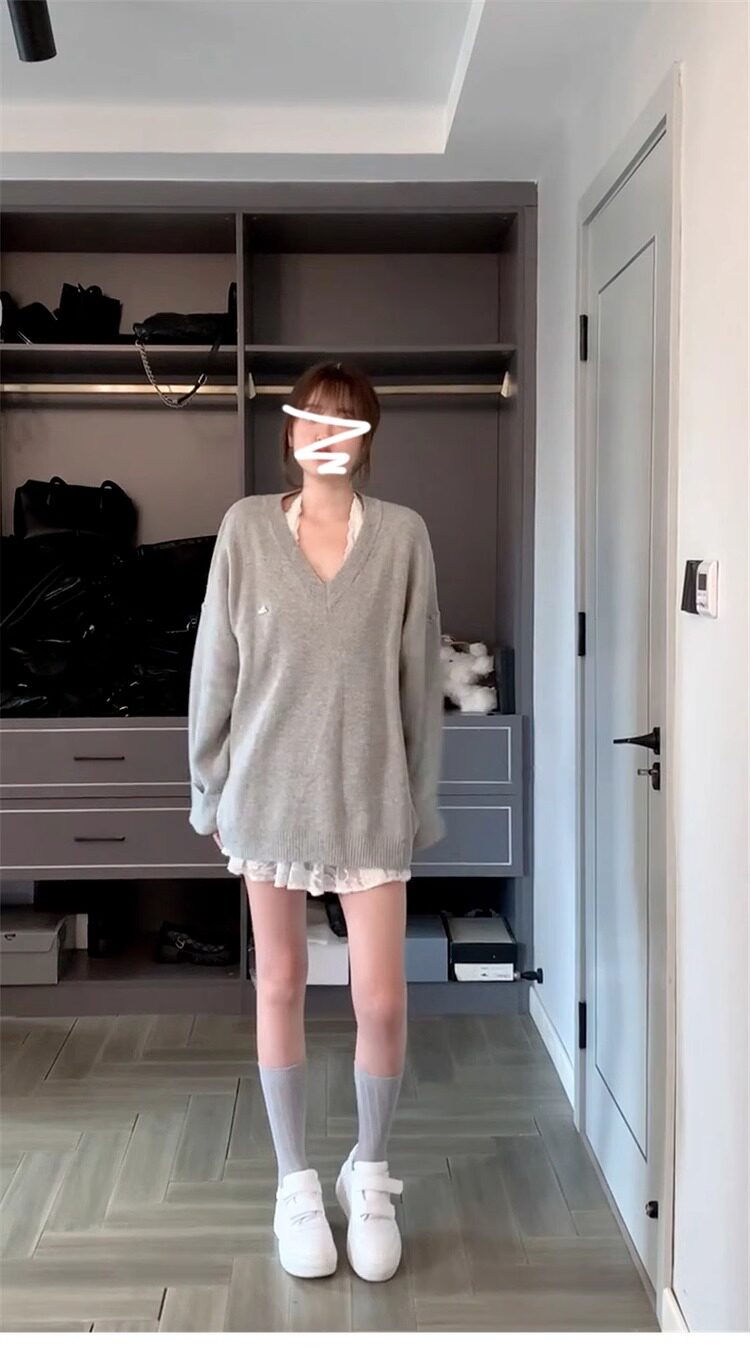 灰色慵懶風V領針織衫毛衣女早秋新款韓系寬松顯瘦高級感長袖上衣