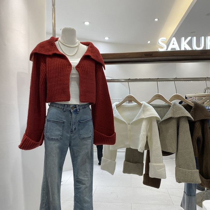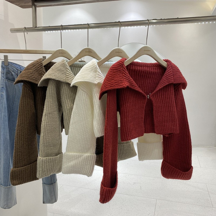 2025年秋季新款韓版時尚設計感翻領拉鍊針織開衫女短款毛衣外套