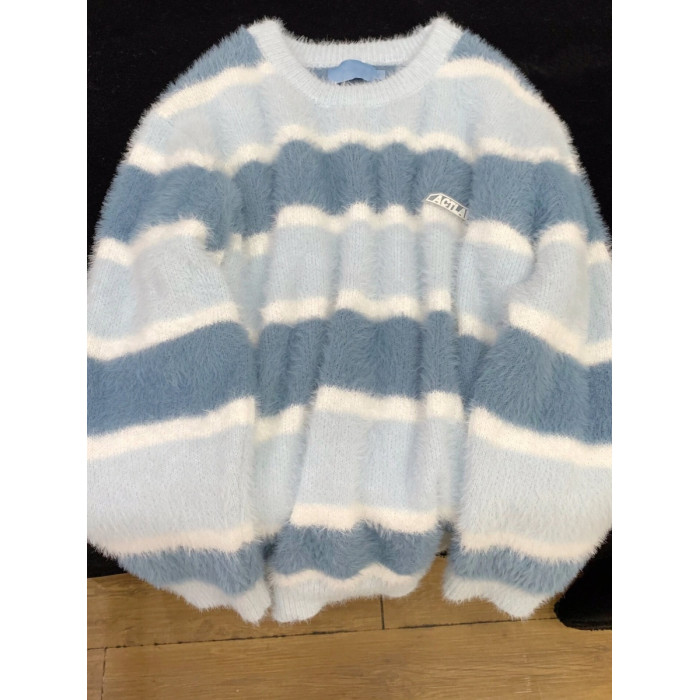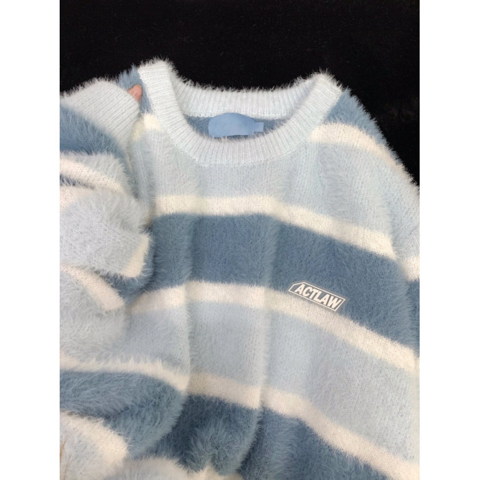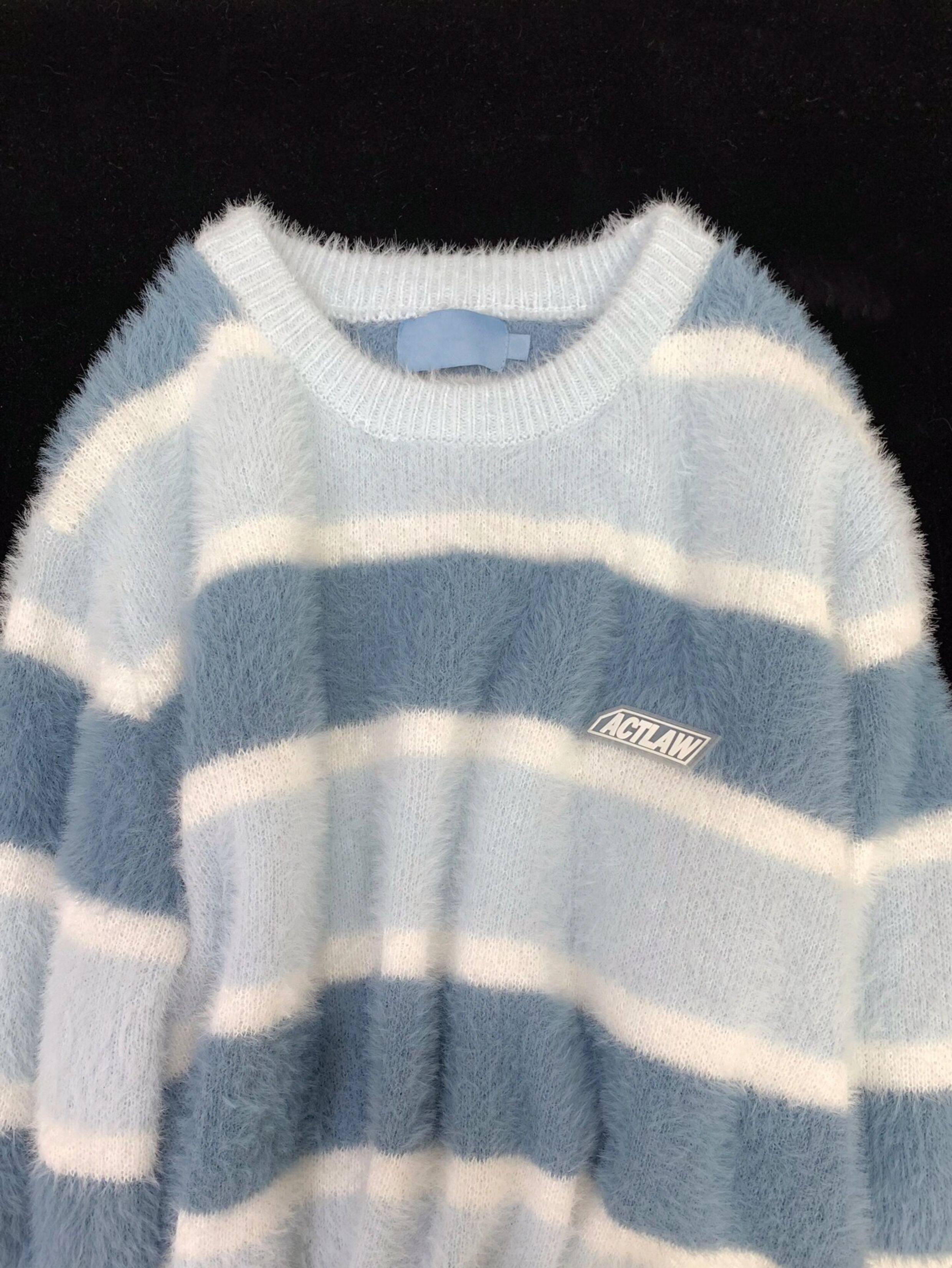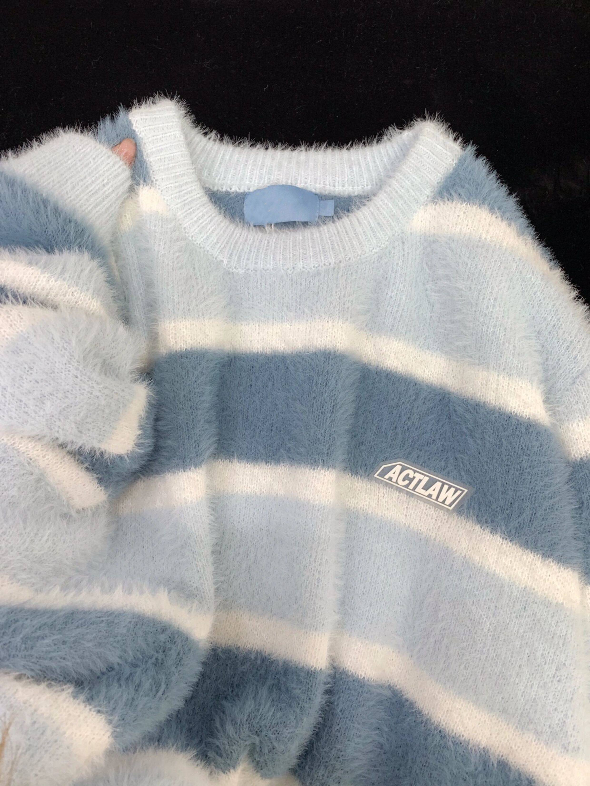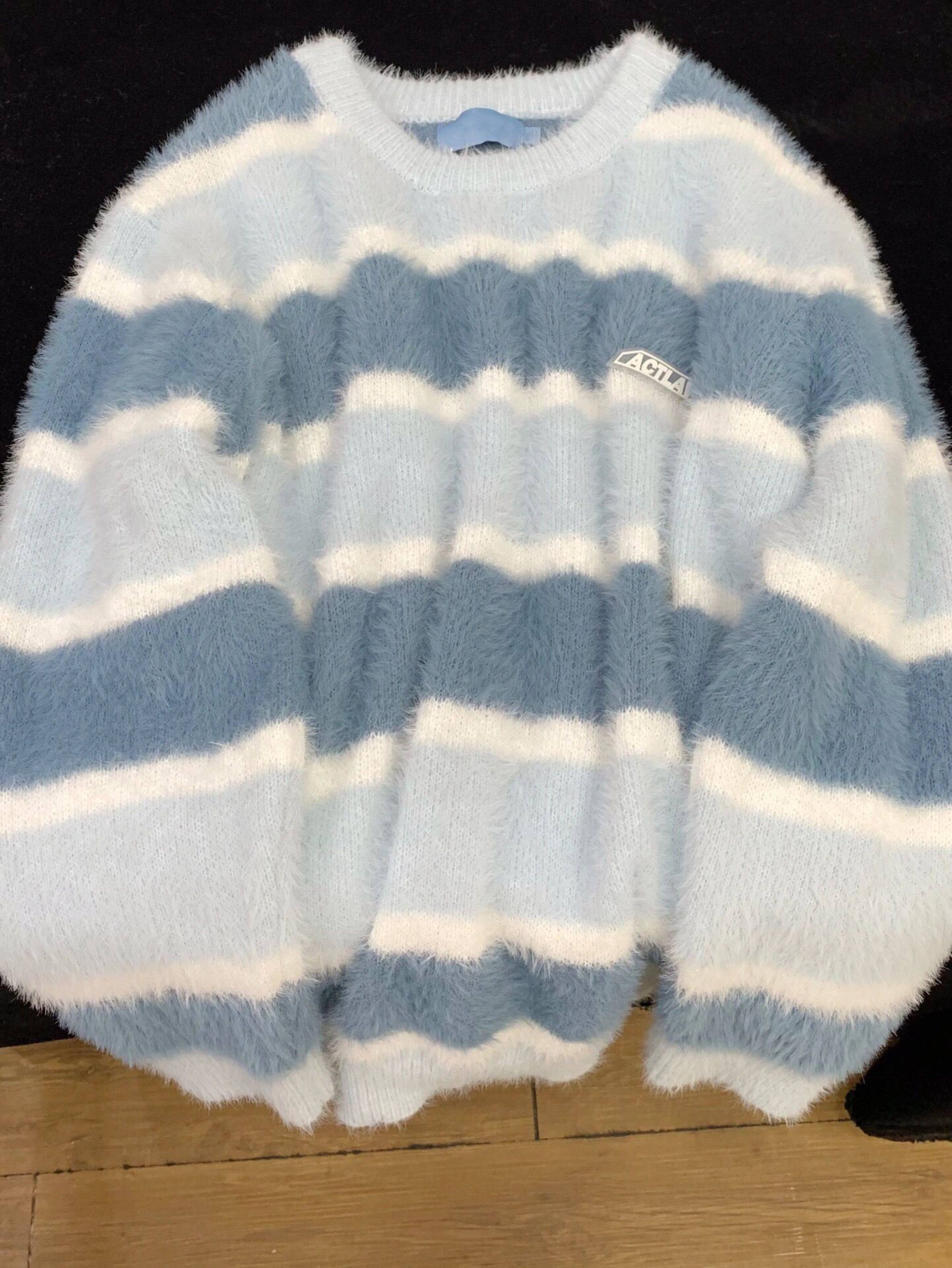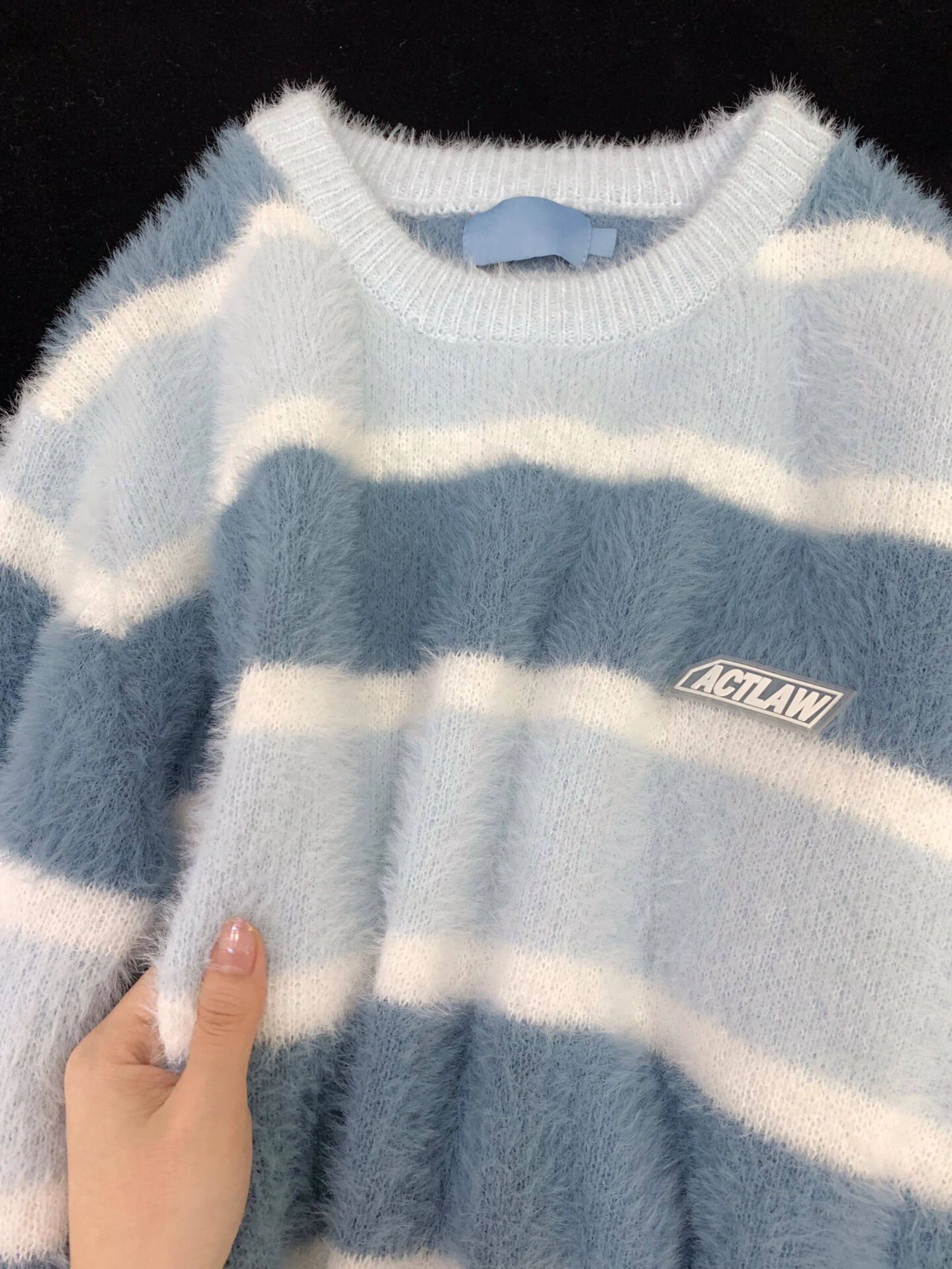 日系學院風撞色條紋馬海毛毛衣女溫柔風小衆軟糯系減齡針織衫上衣