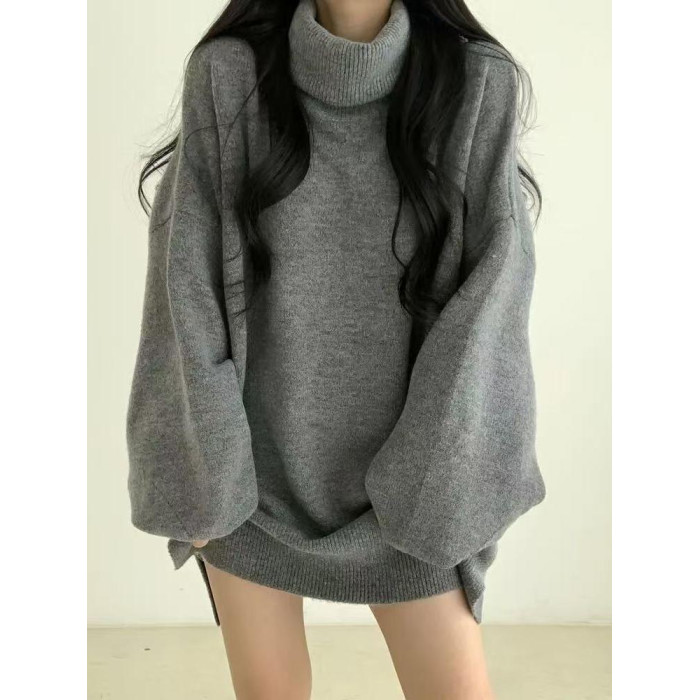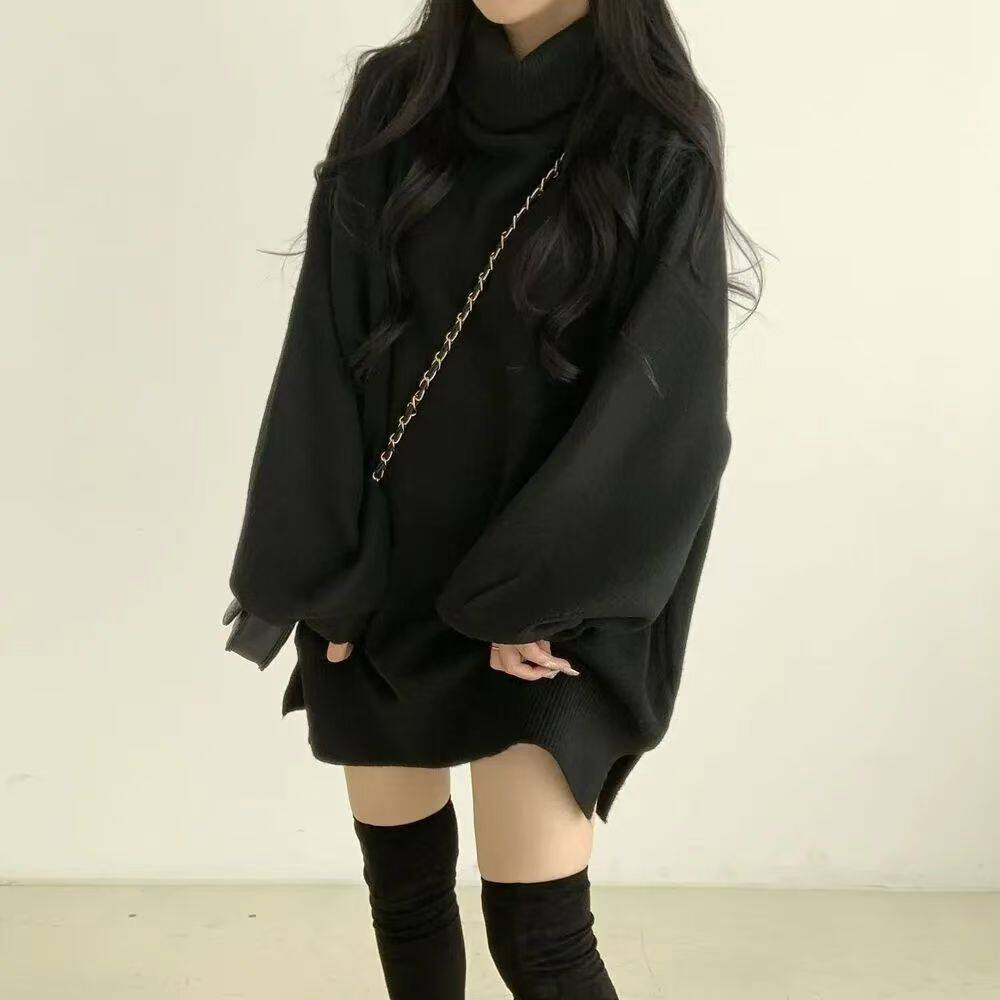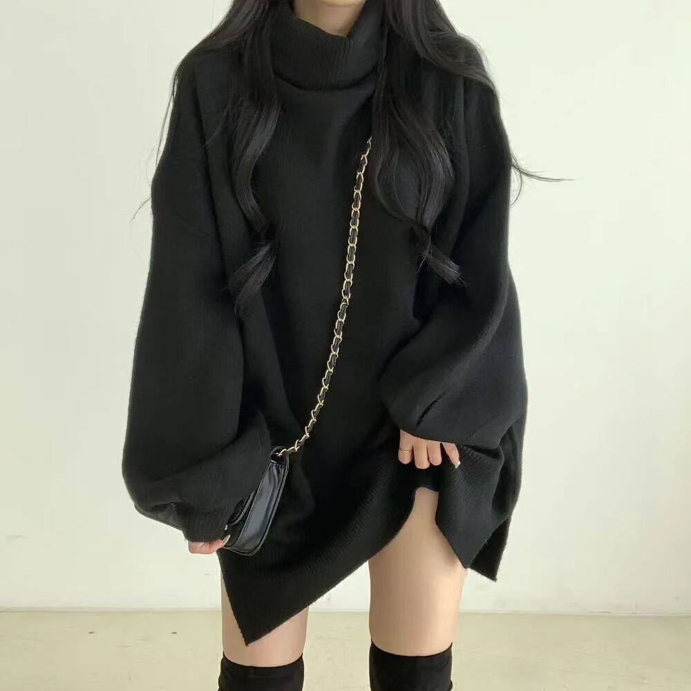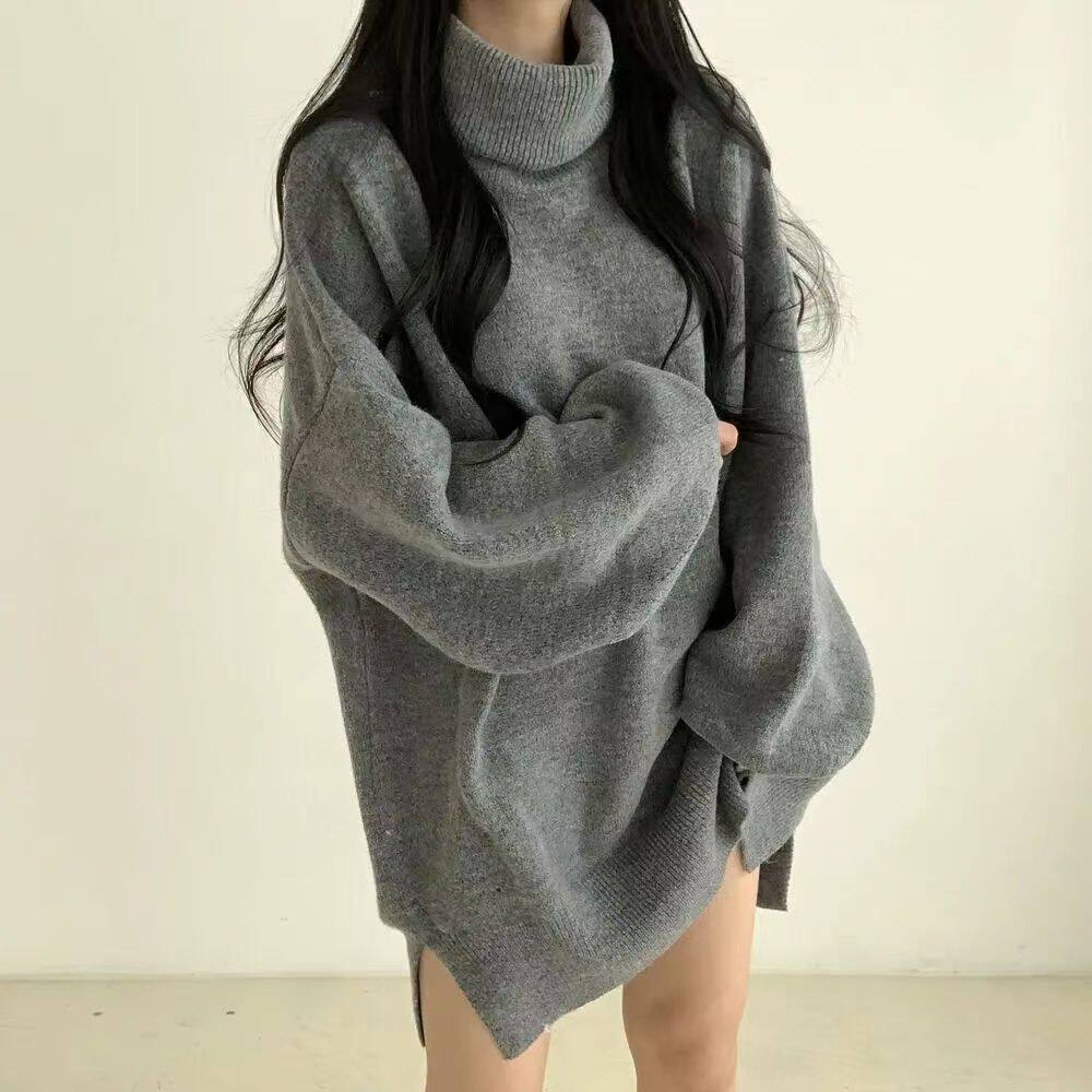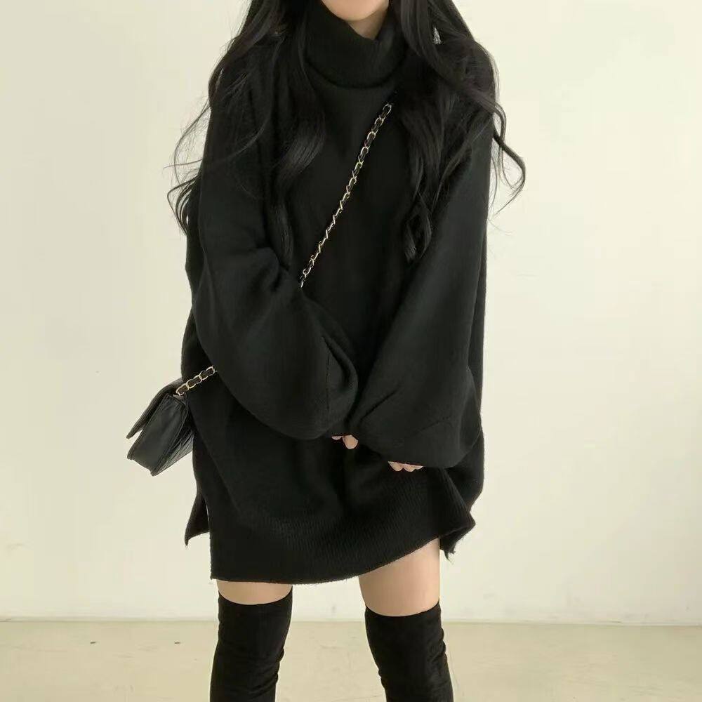 暗黑系高領設計感中長款毛衣女秋冬新款寬松顯瘦開叉上衣保暖外套