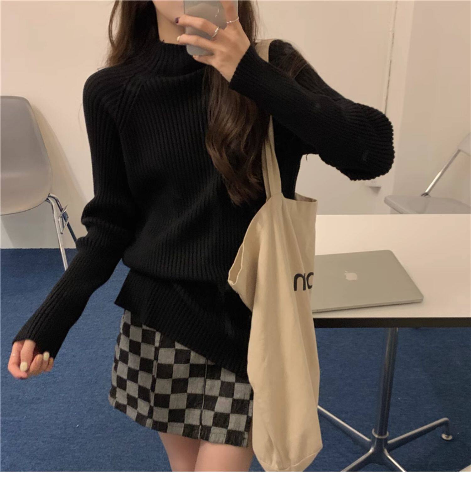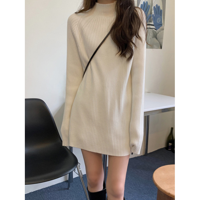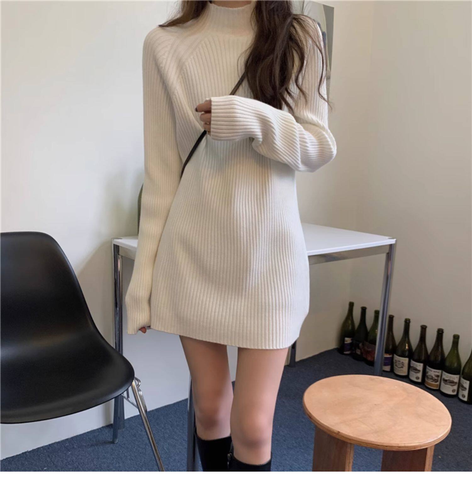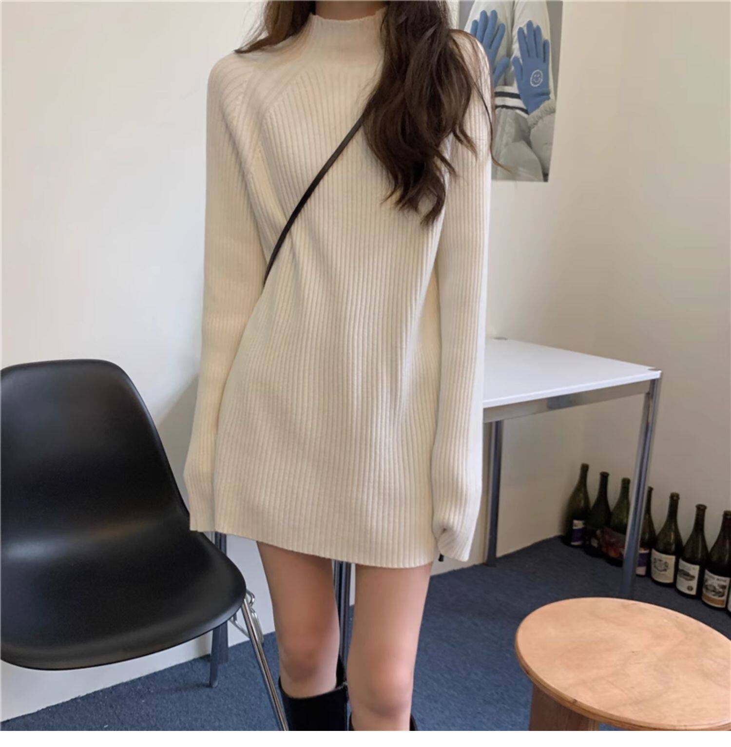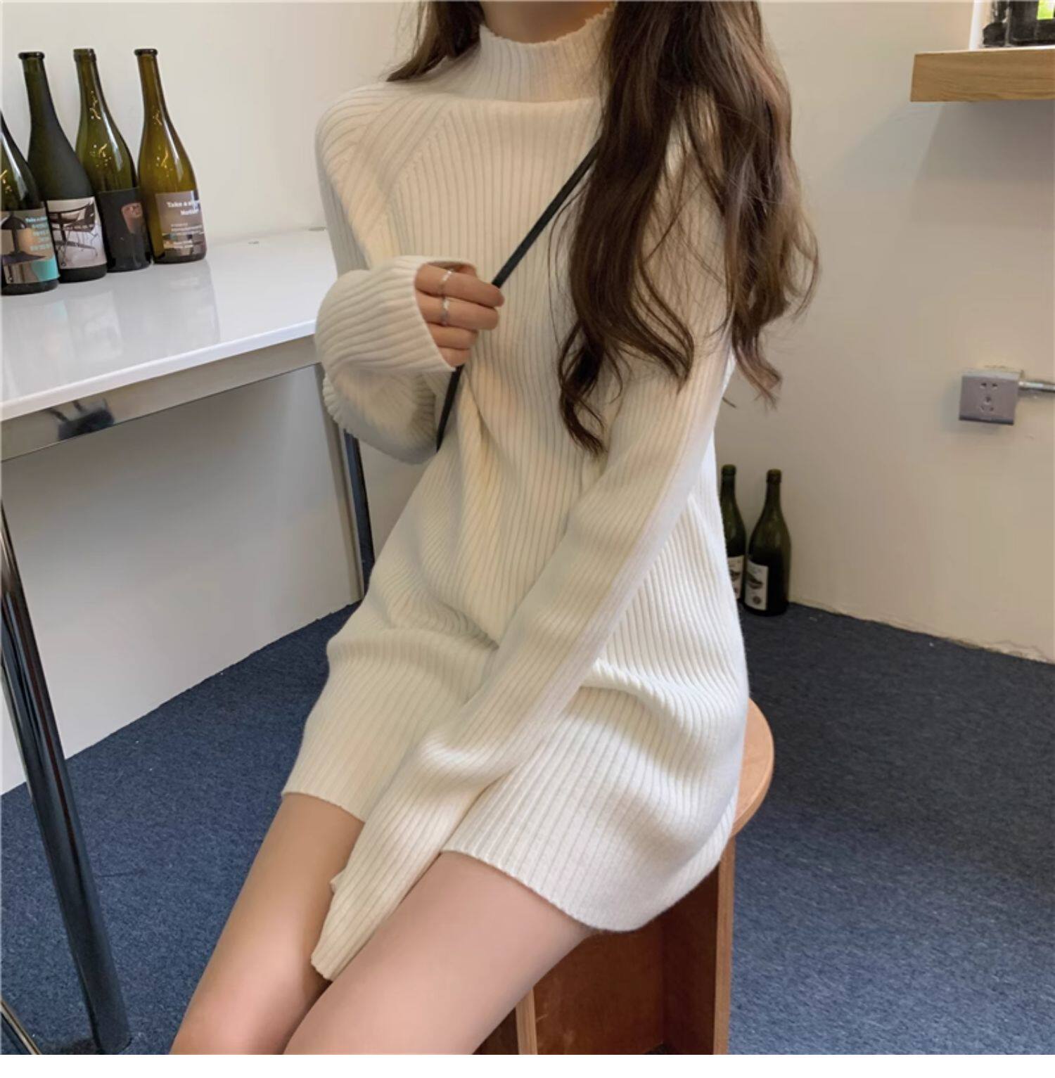 白色中長款半高領針織衫女秋冬小個子配大衣內搭毛衣遮屁股上衣