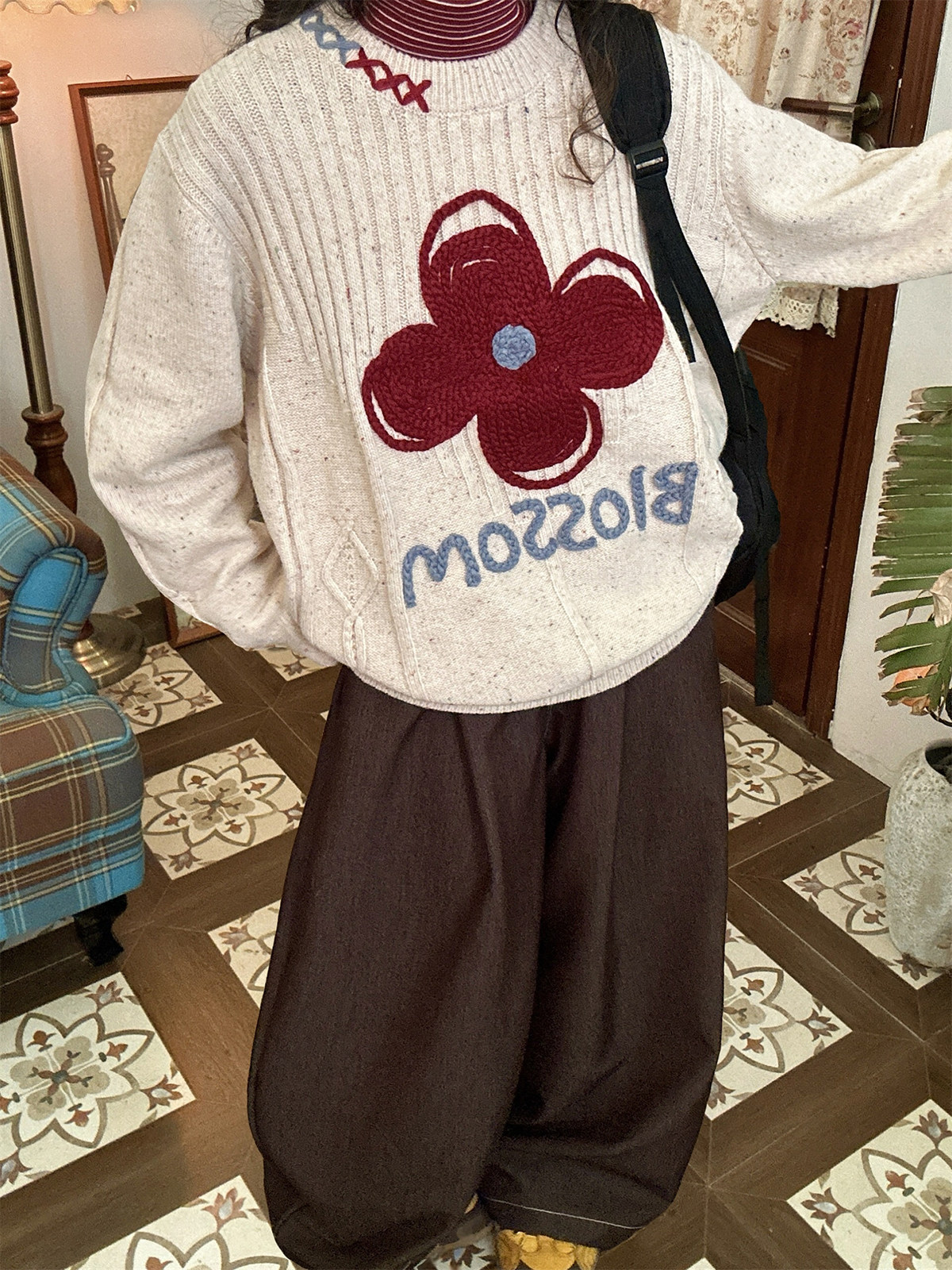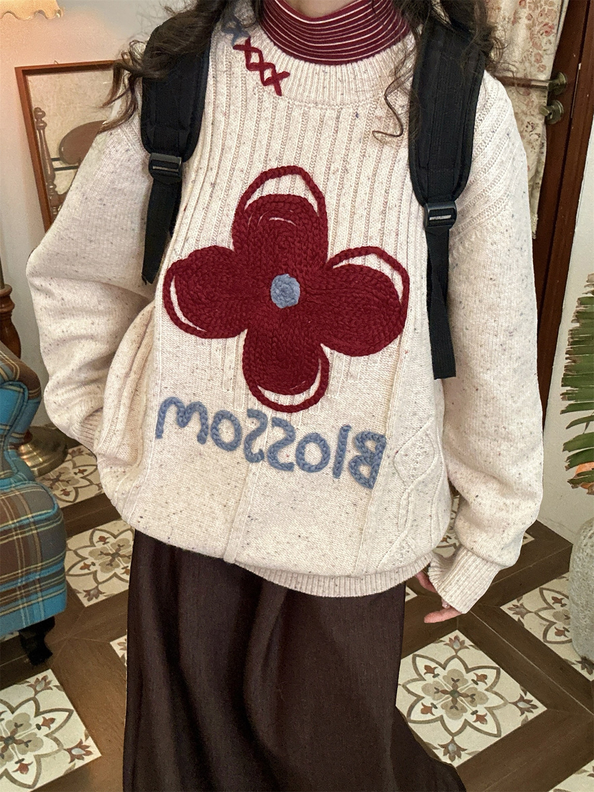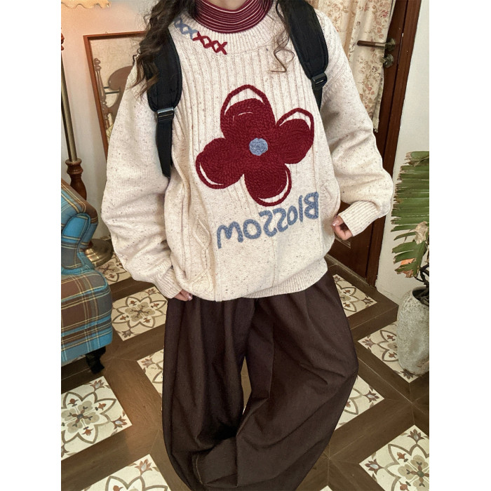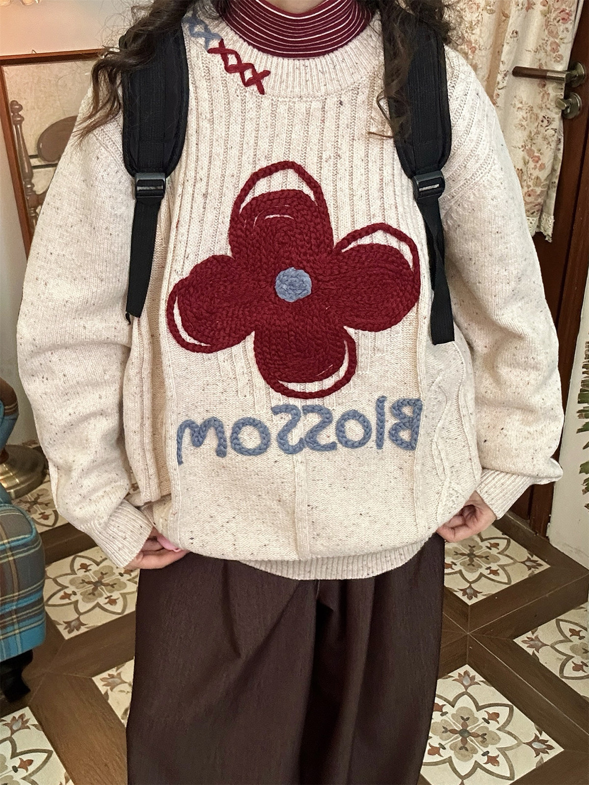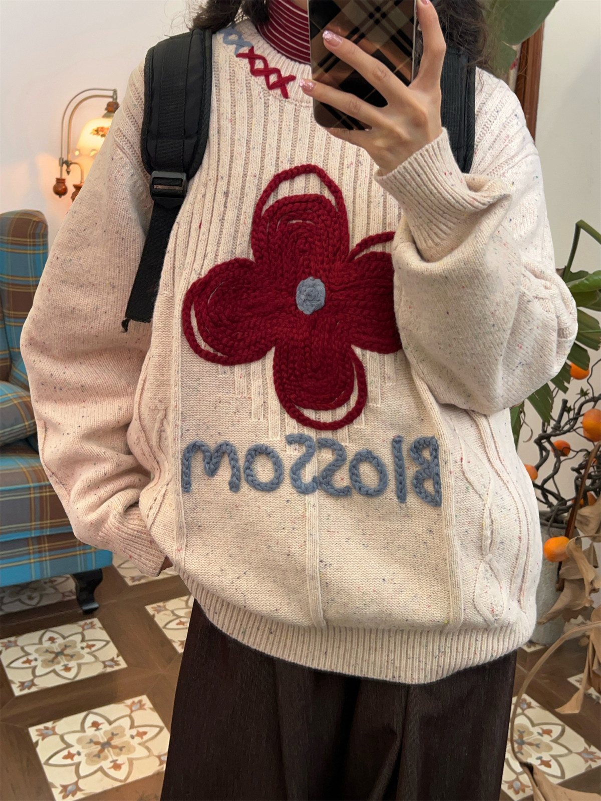 C2自製/秋冬款日系立體鉤織花朵圓領套頭毛衣針織衫男女同款上衣