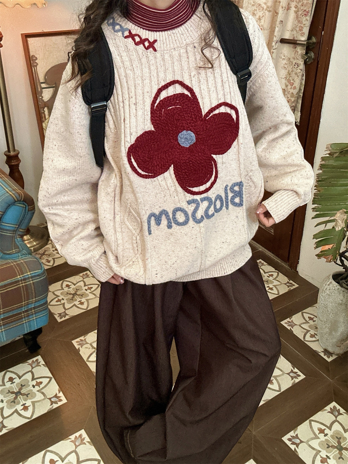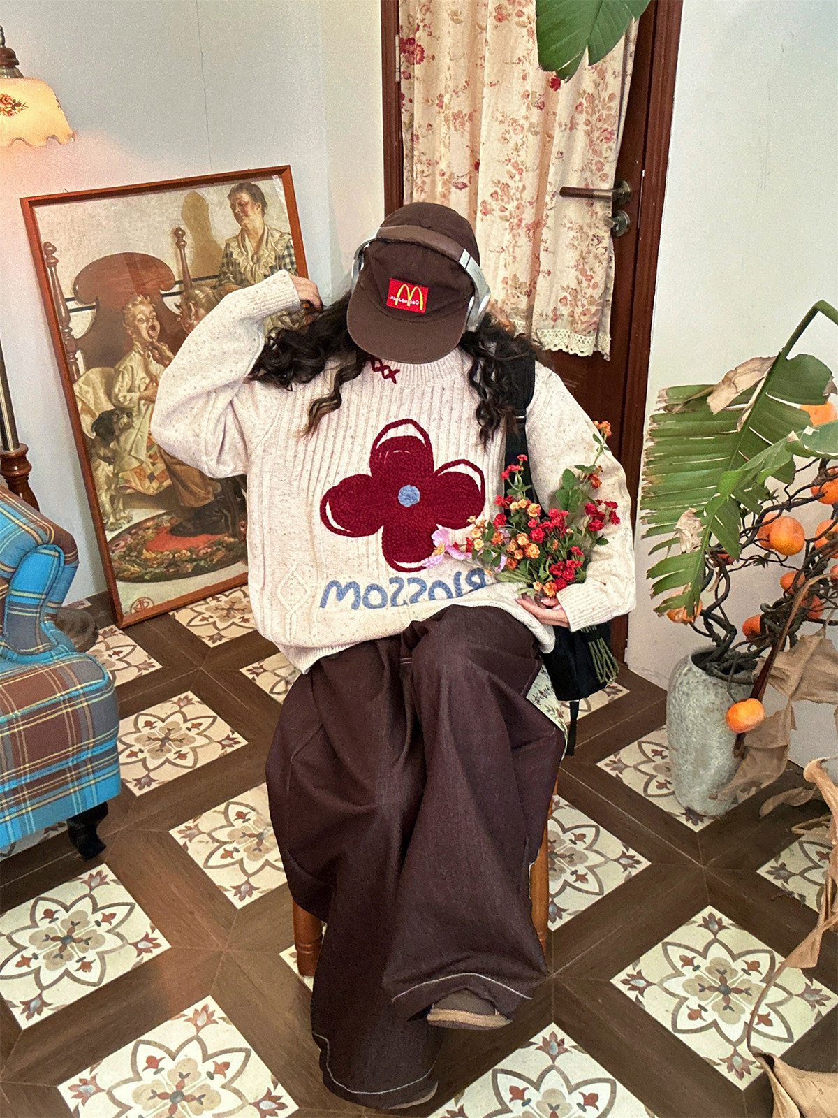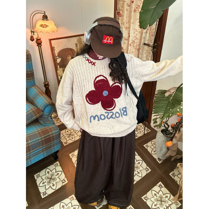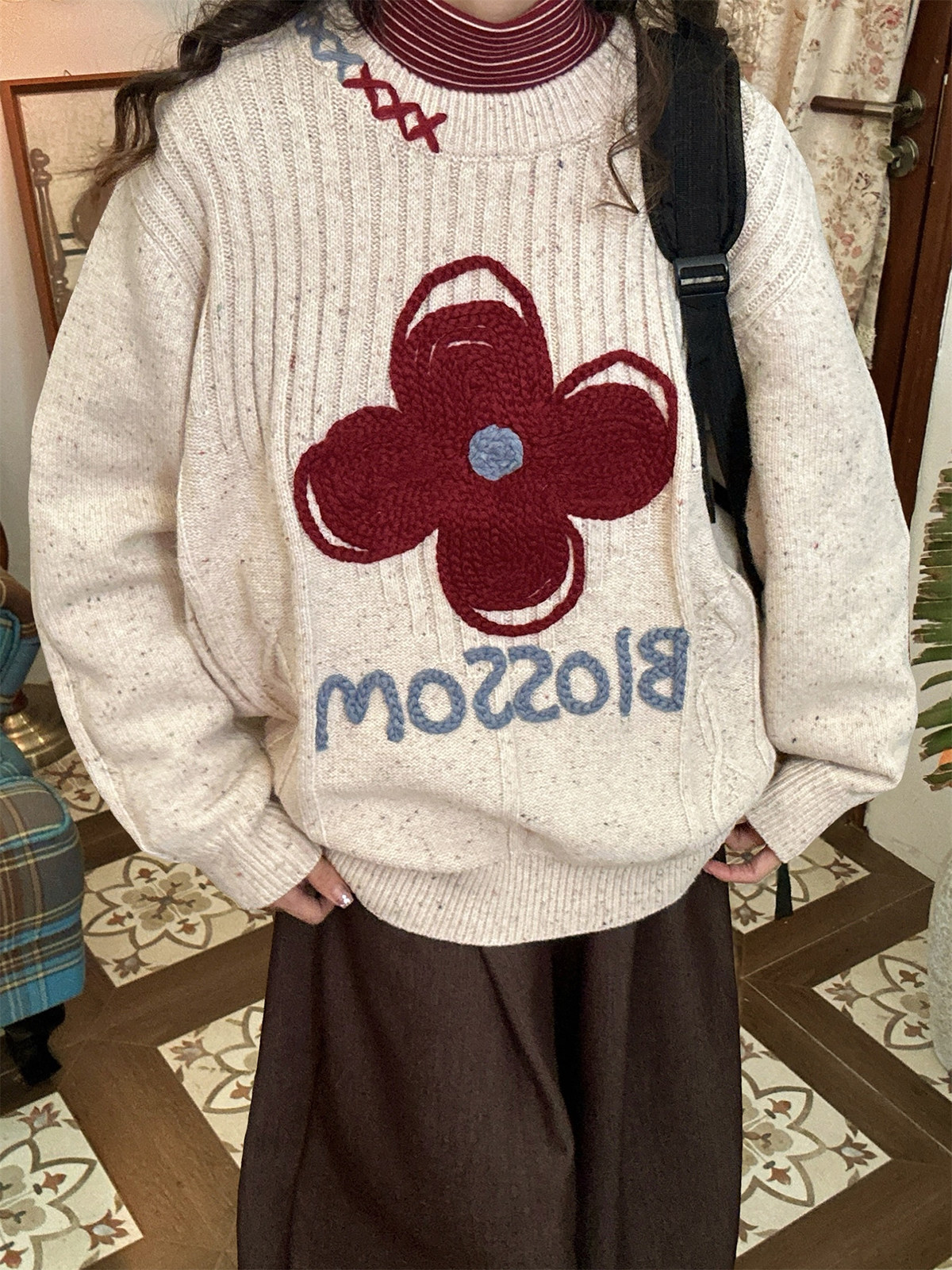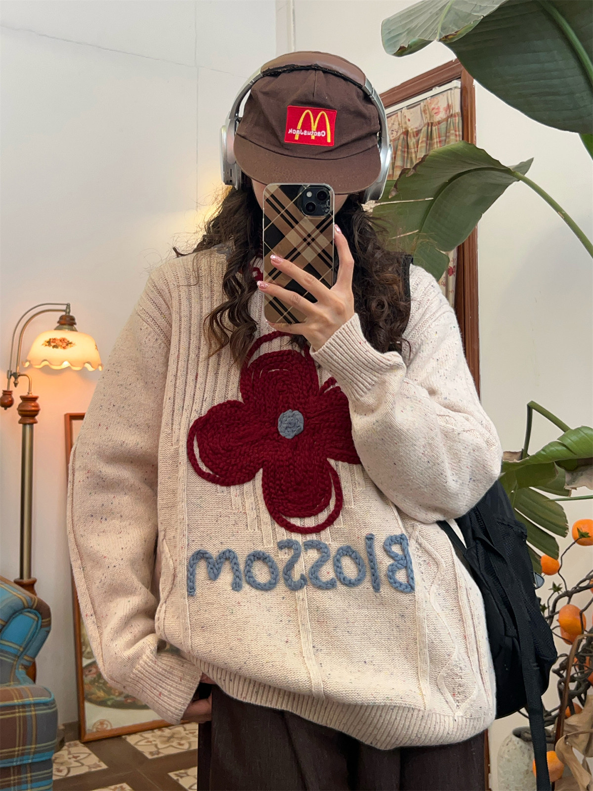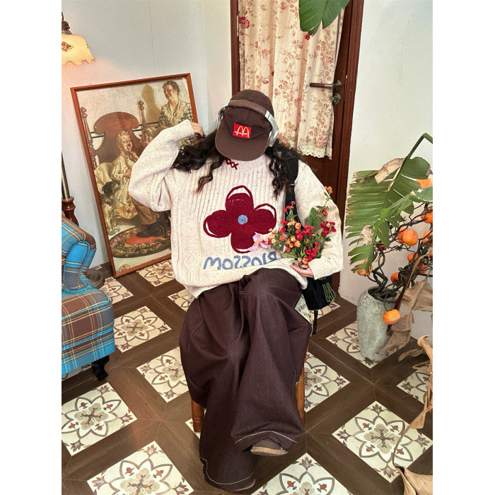 C2自製/秋冬款日系立體鉤織花朵圓領套頭毛衣針織衫男女同款上衣