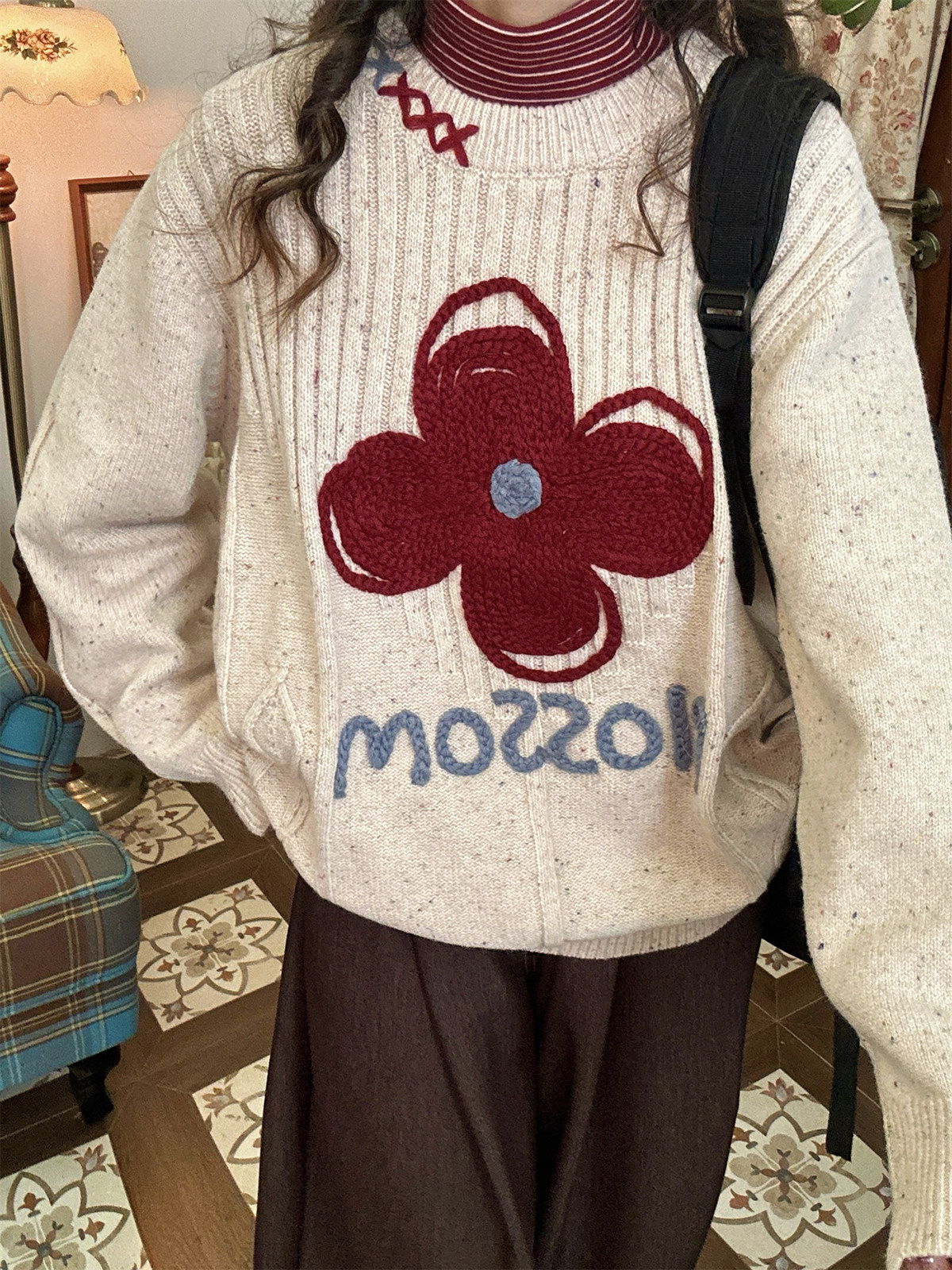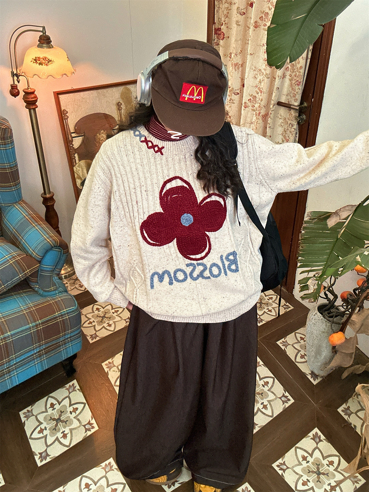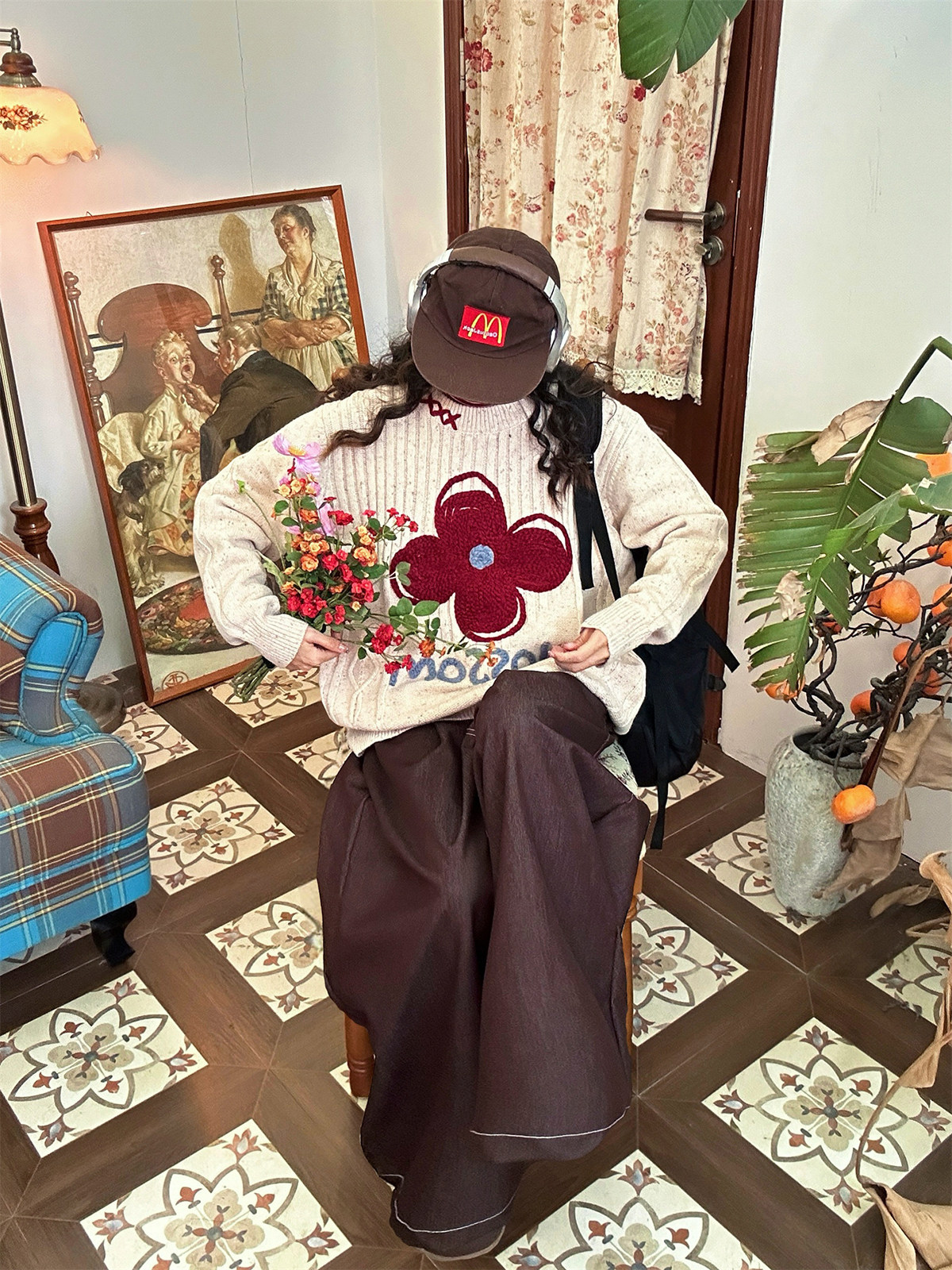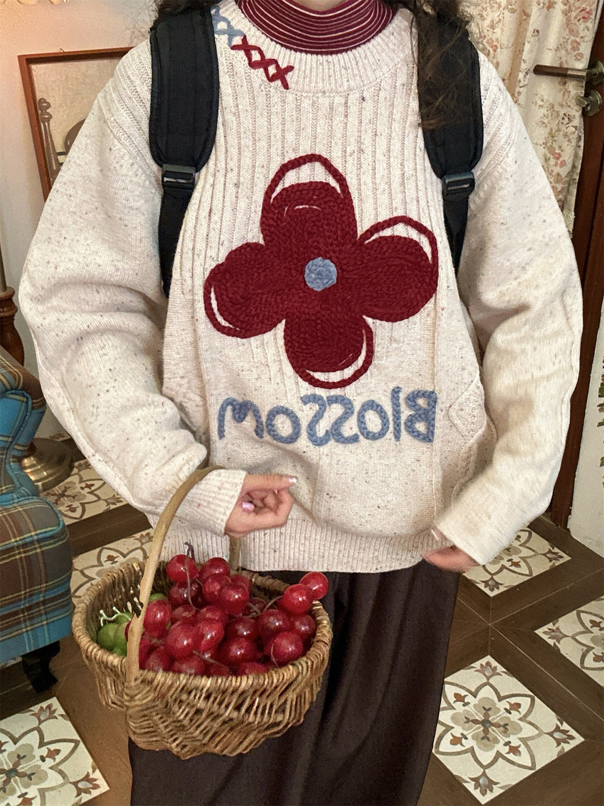 C2自製/秋冬款日系立體鉤織花朵圓領套頭毛衣針織衫男女同款上衣