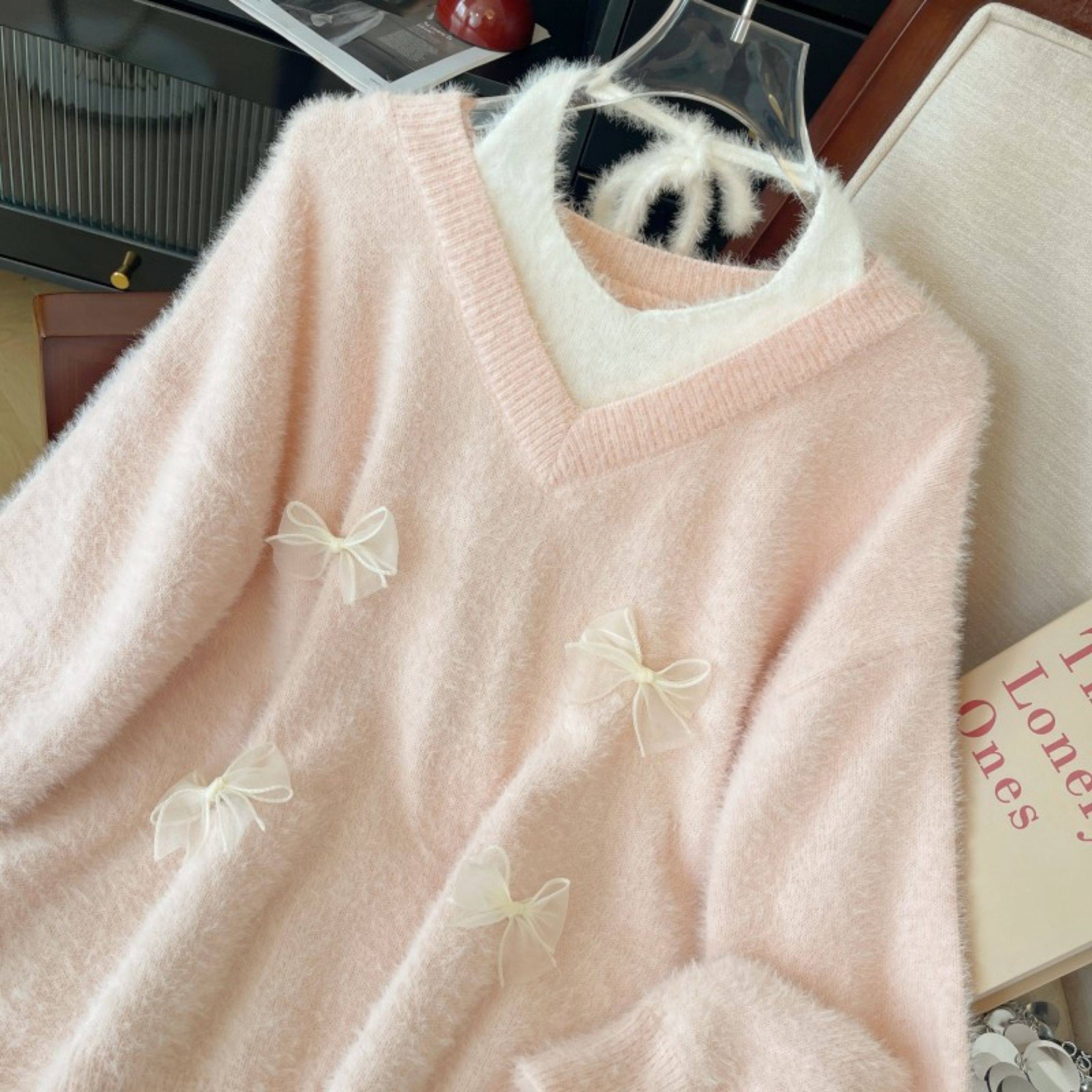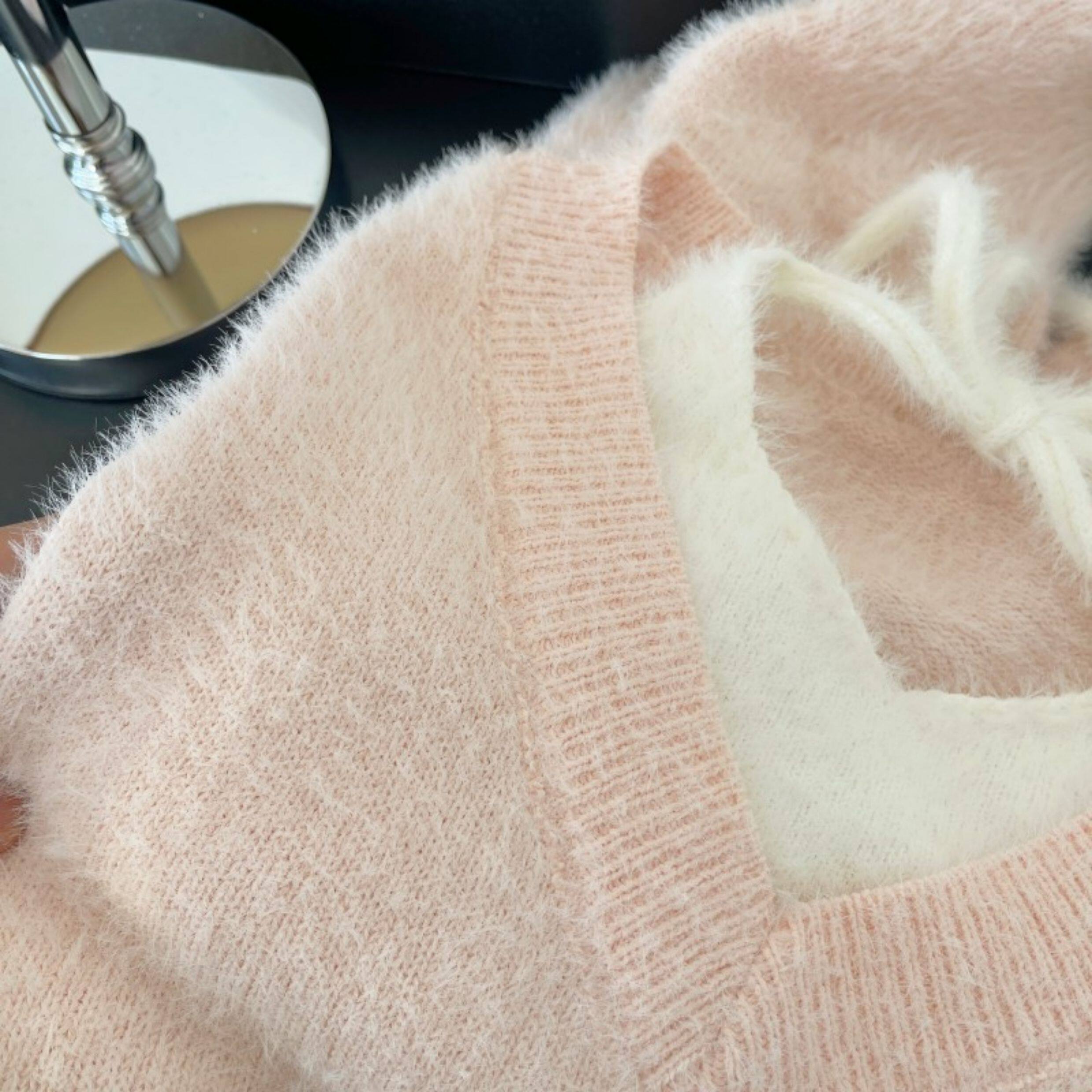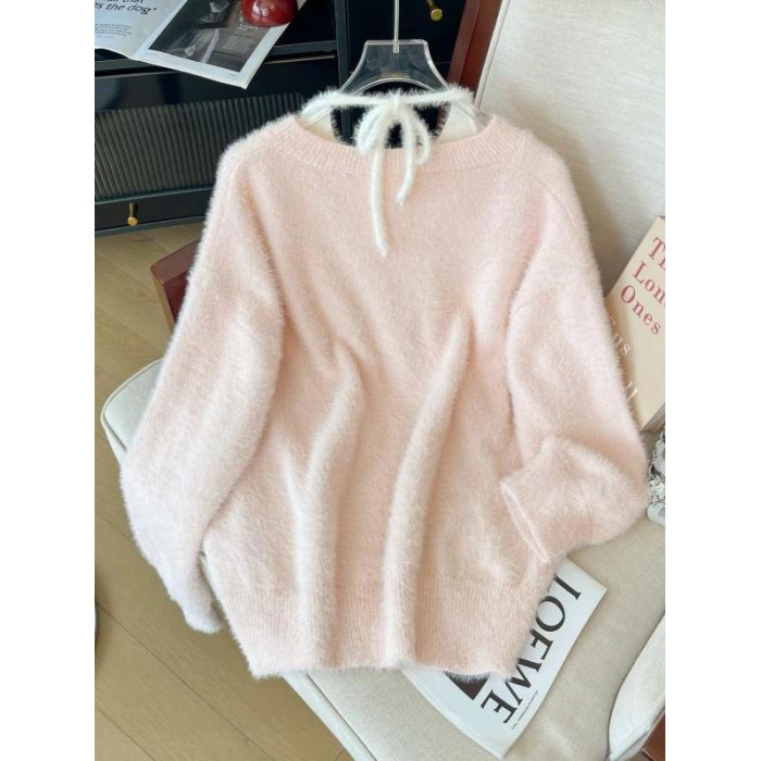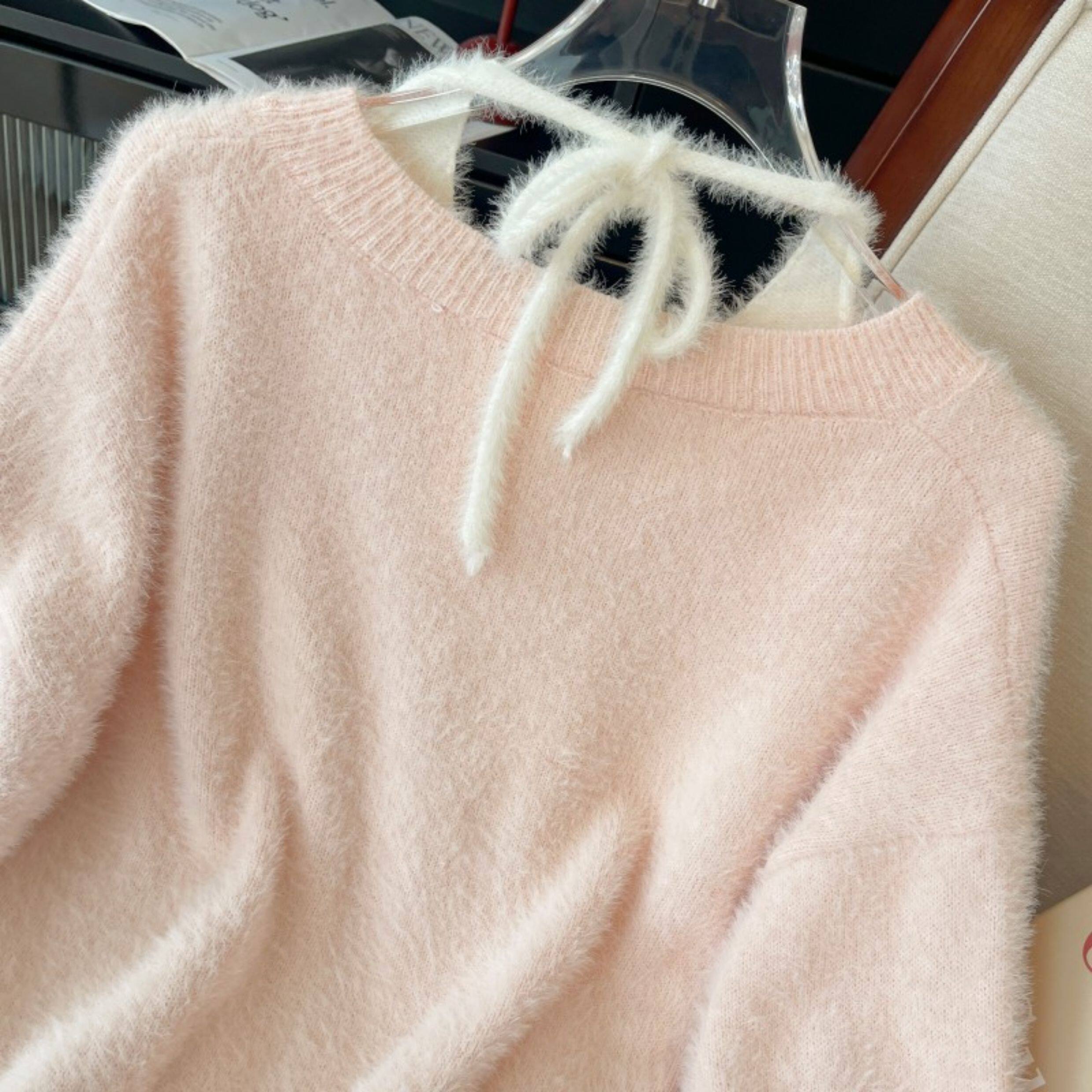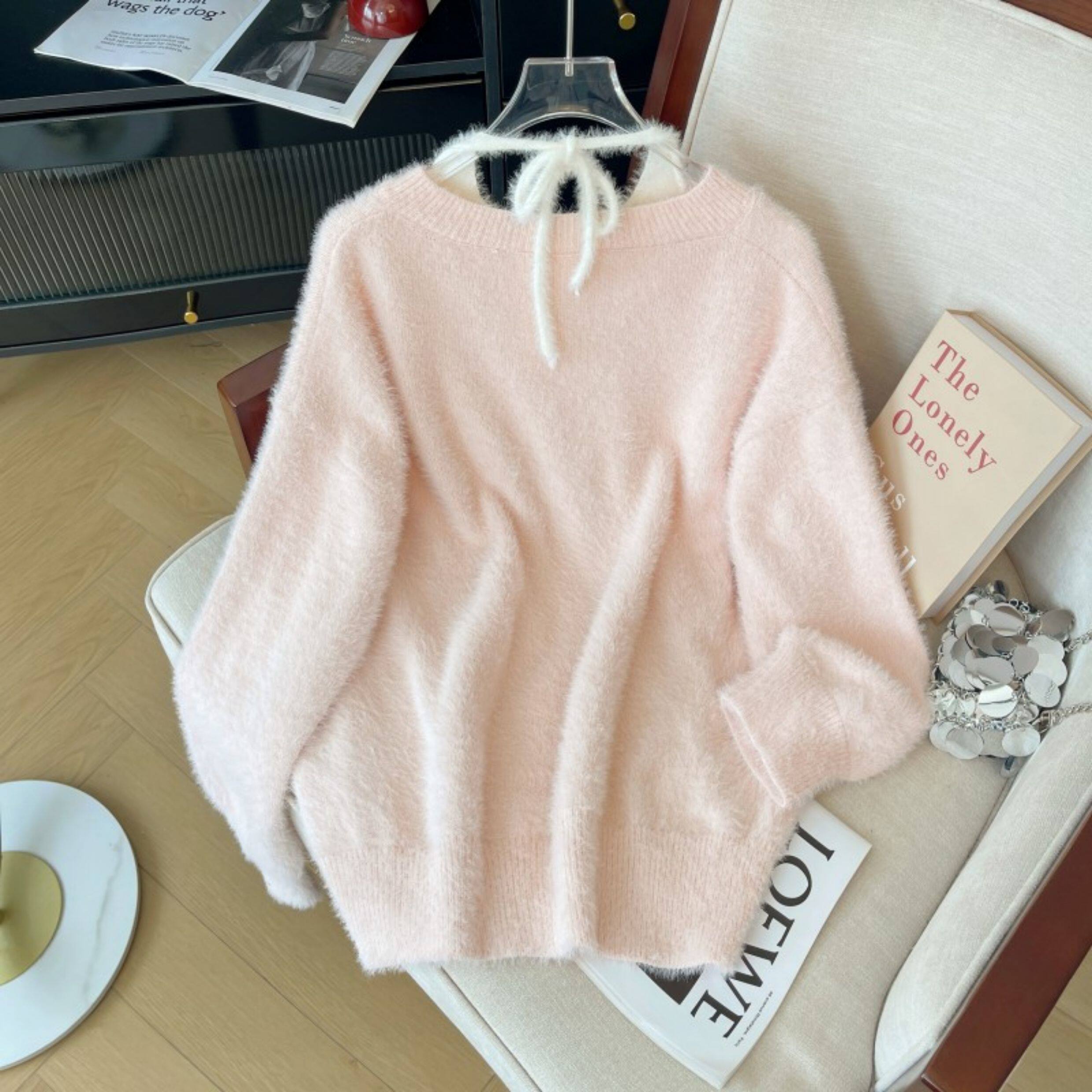 粉色假兩件掛脖水貂絨毛衣女秋冬大碼胖mm顯瘦韓系軟糯針織衫上衣