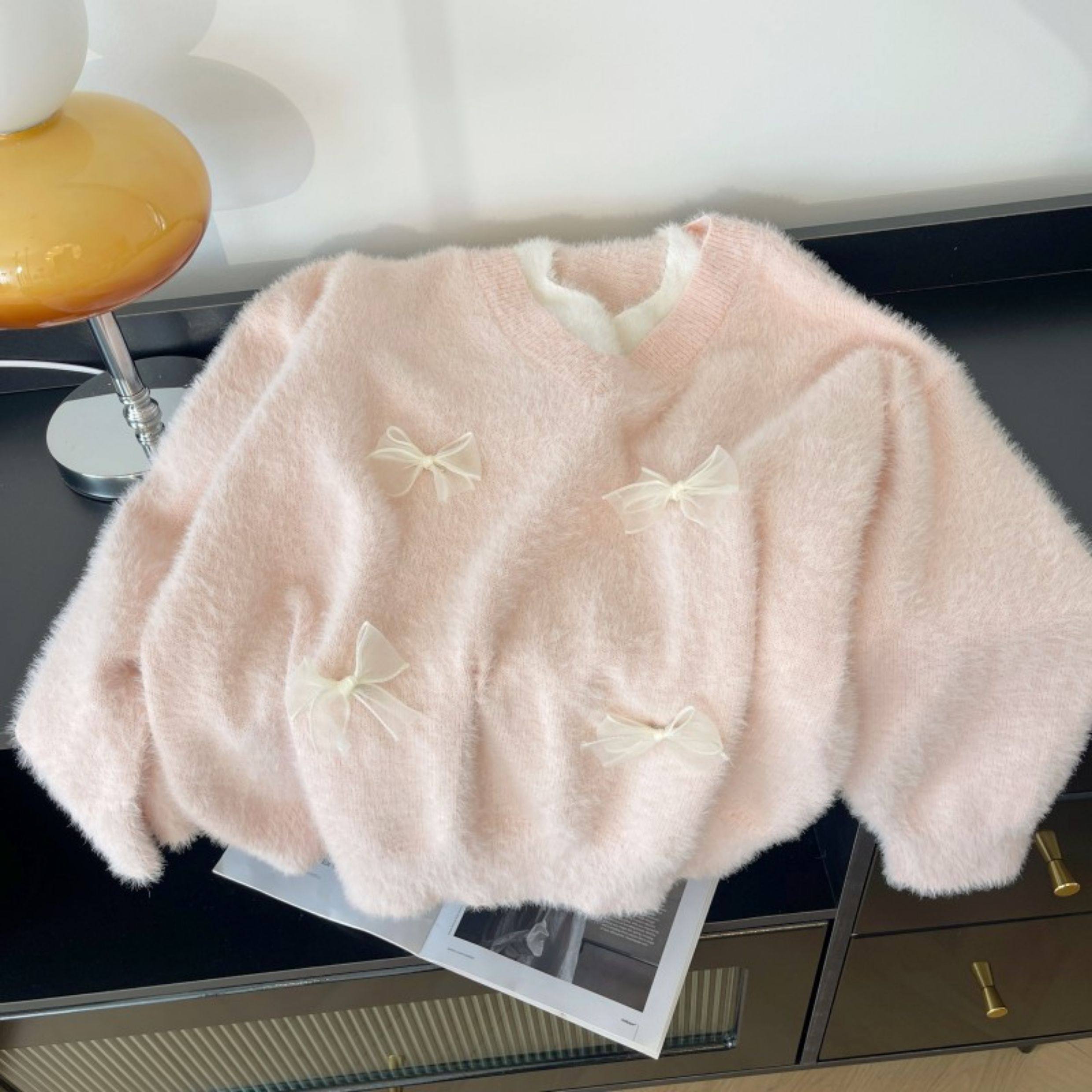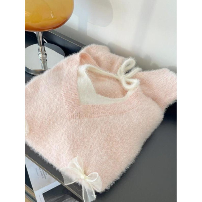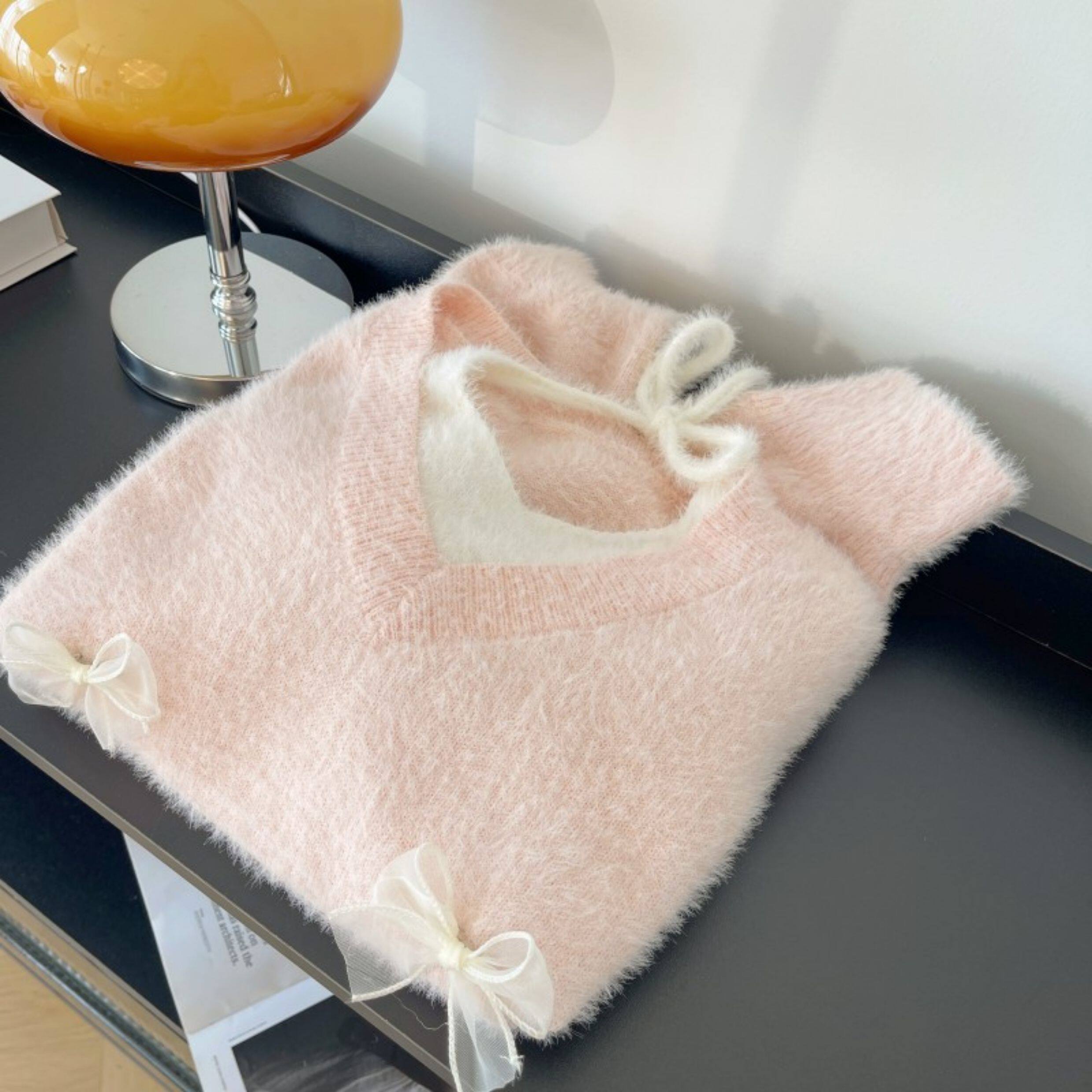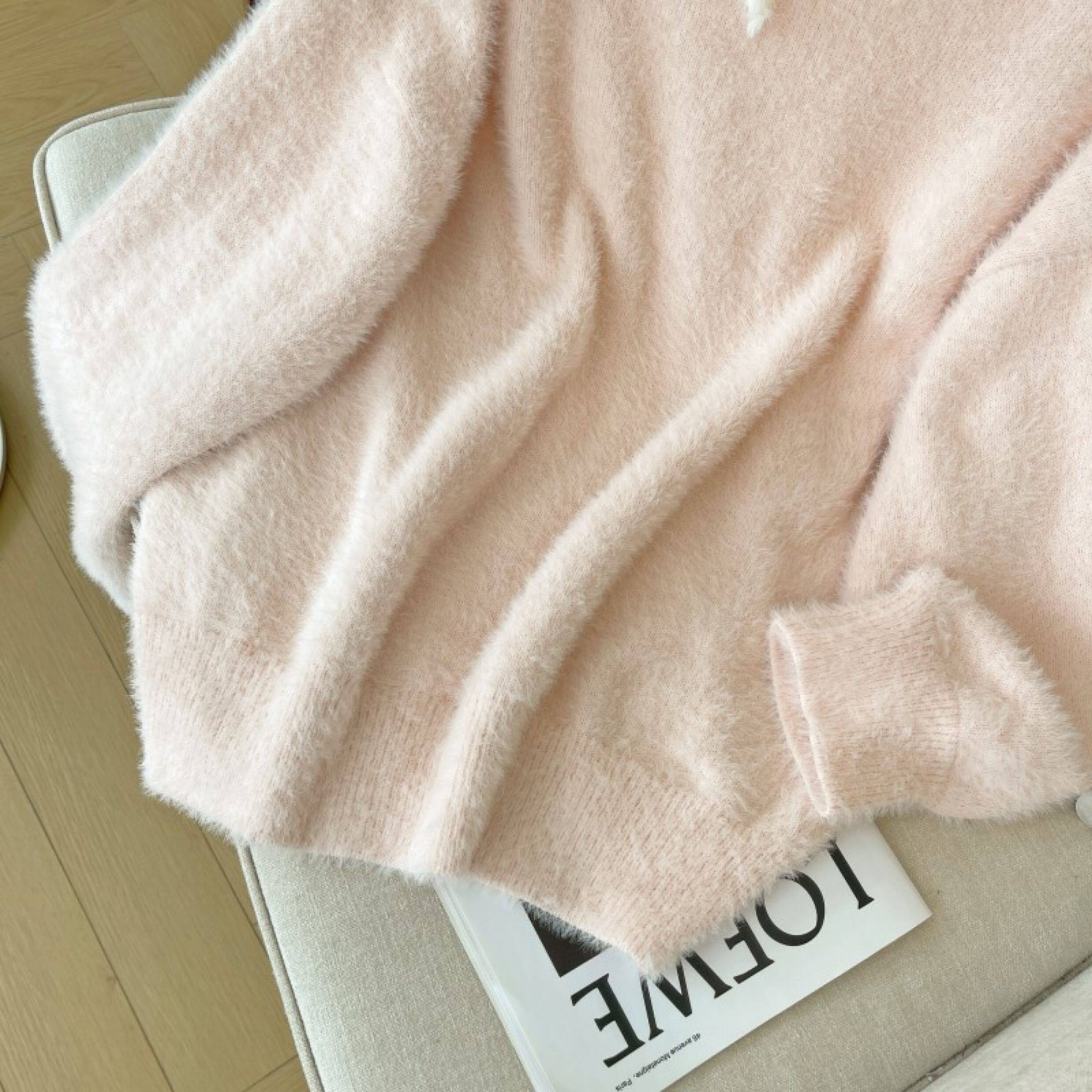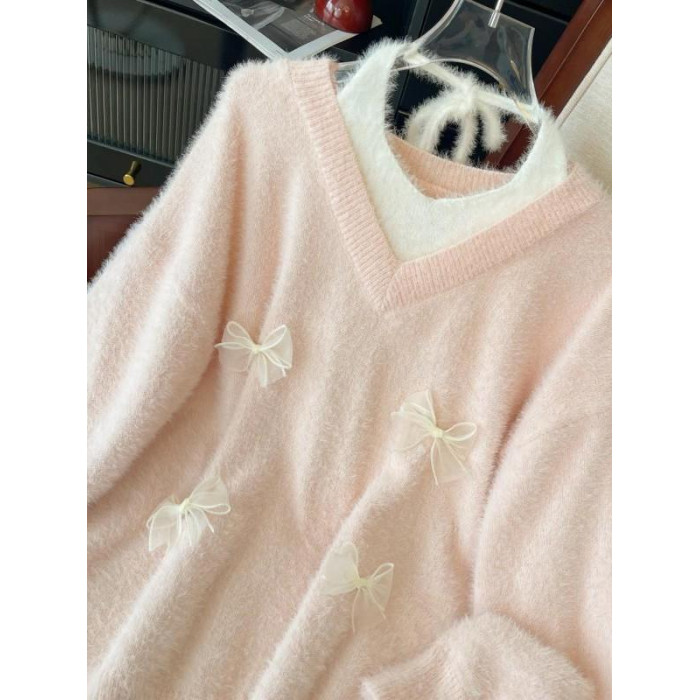 粉色假兩件掛脖水貂絨毛衣女秋冬大碼胖mm顯瘦韓系軟糯針織衫上衣