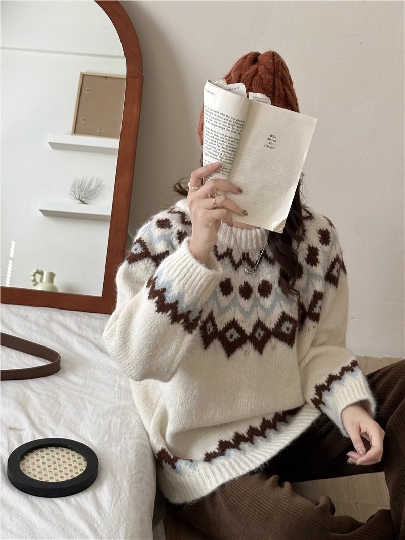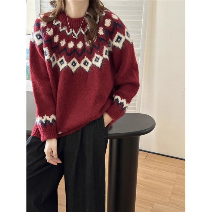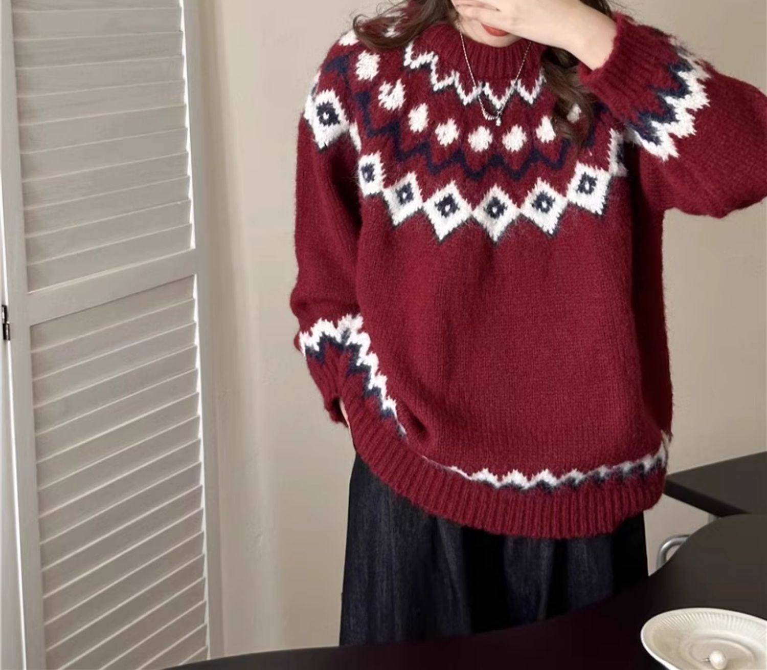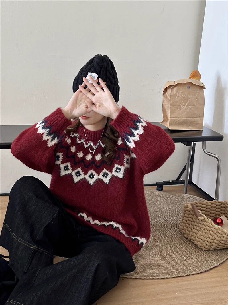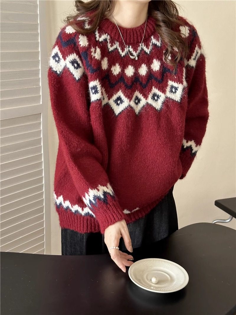 復古費爾島軟糯毛衣女秋冬寬松加厚溫柔慵懶風套頭針織衫聖誕穿搭