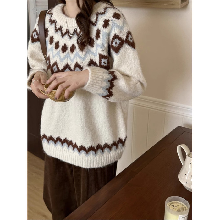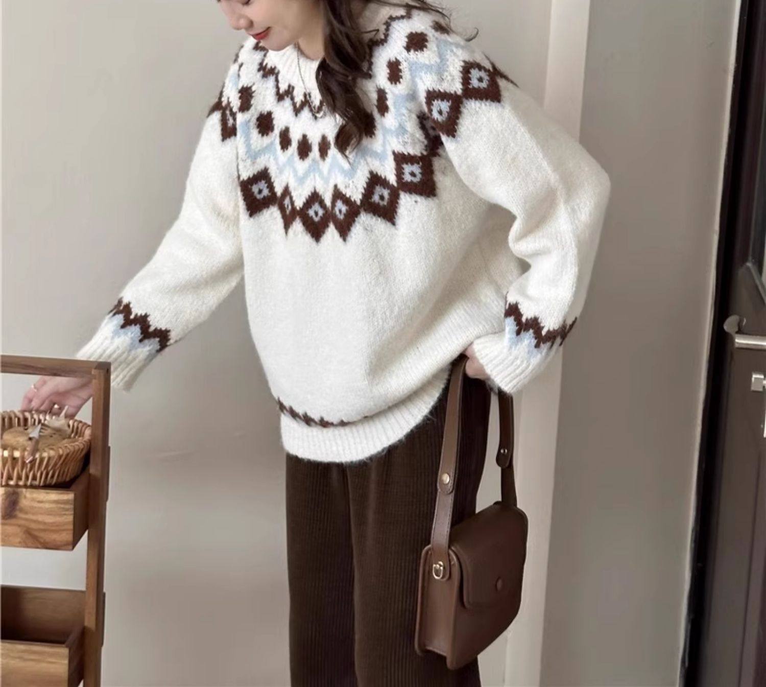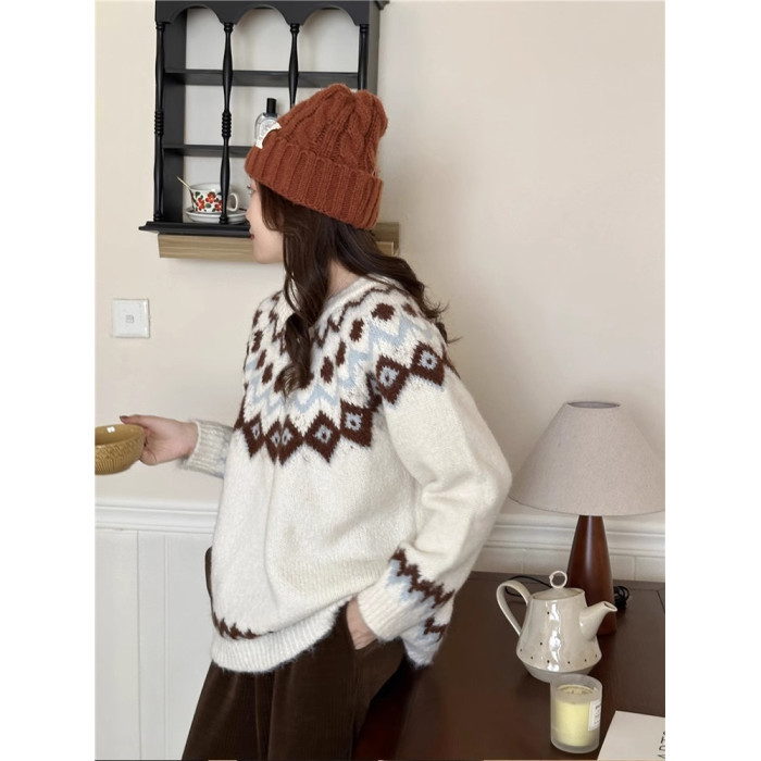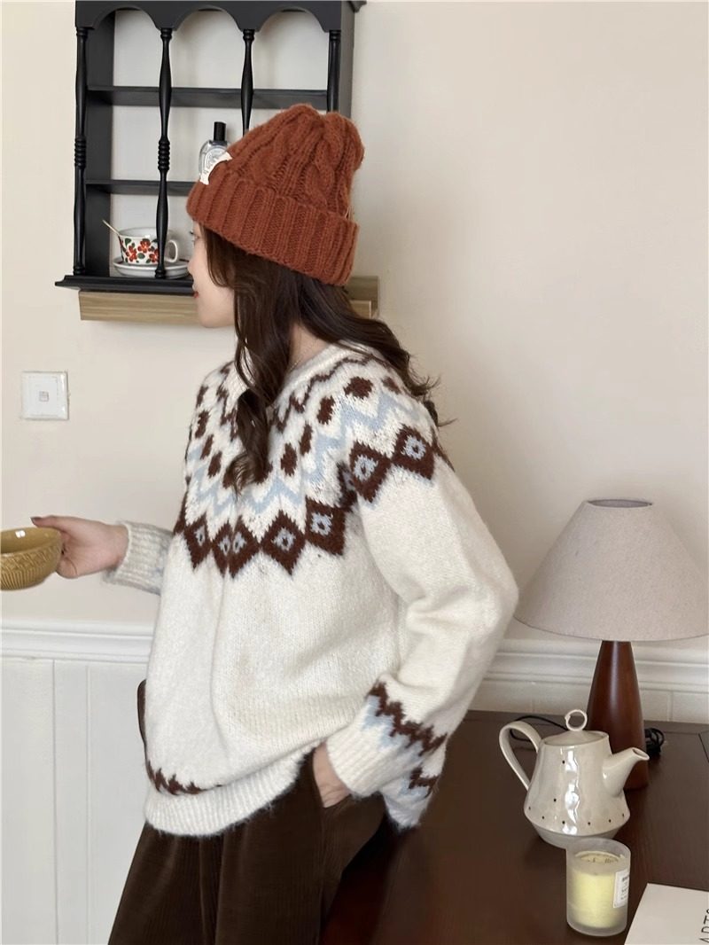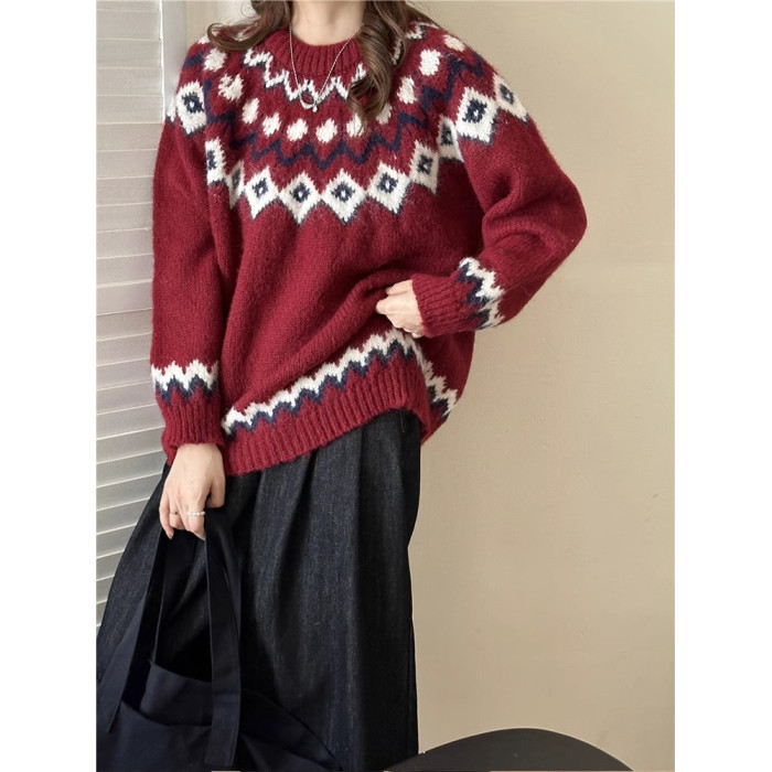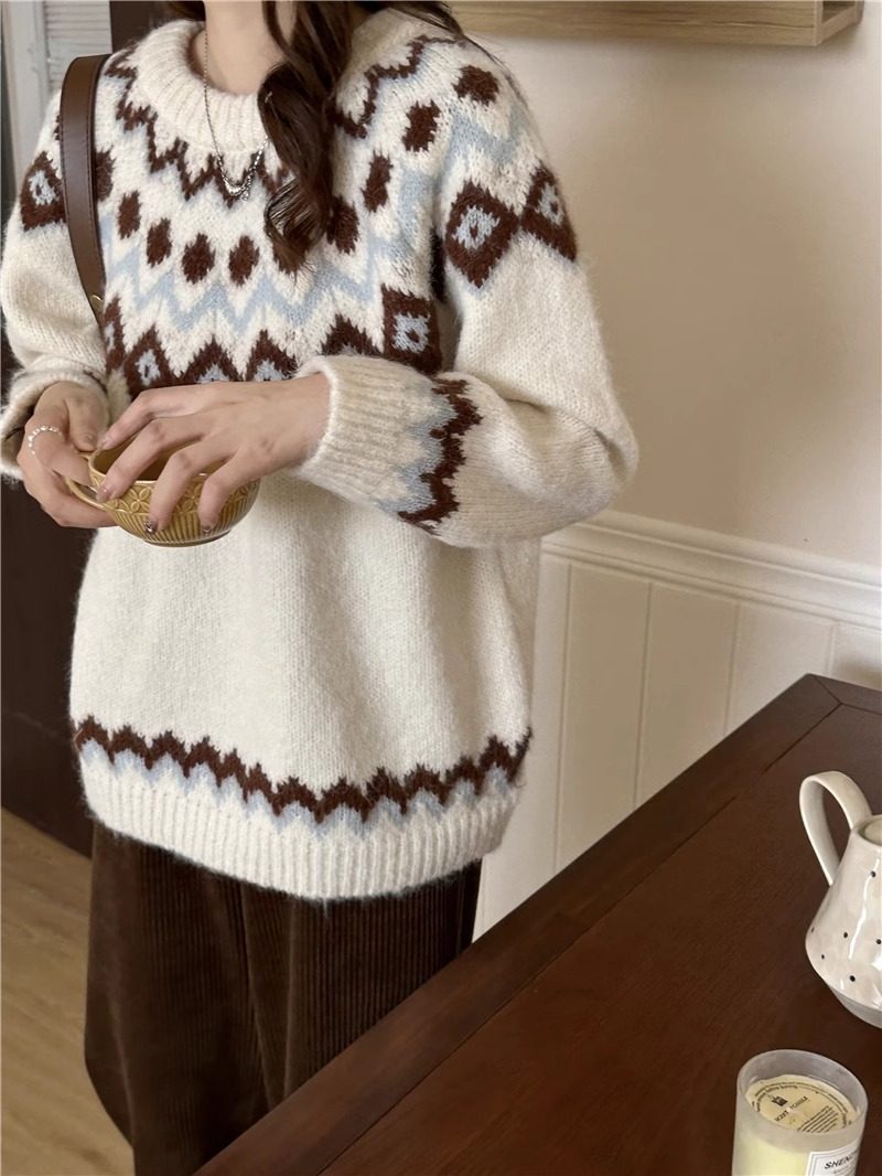 復古費爾島軟糯毛衣女秋冬寬松加厚溫柔慵懶風套頭針織衫聖誕穿搭