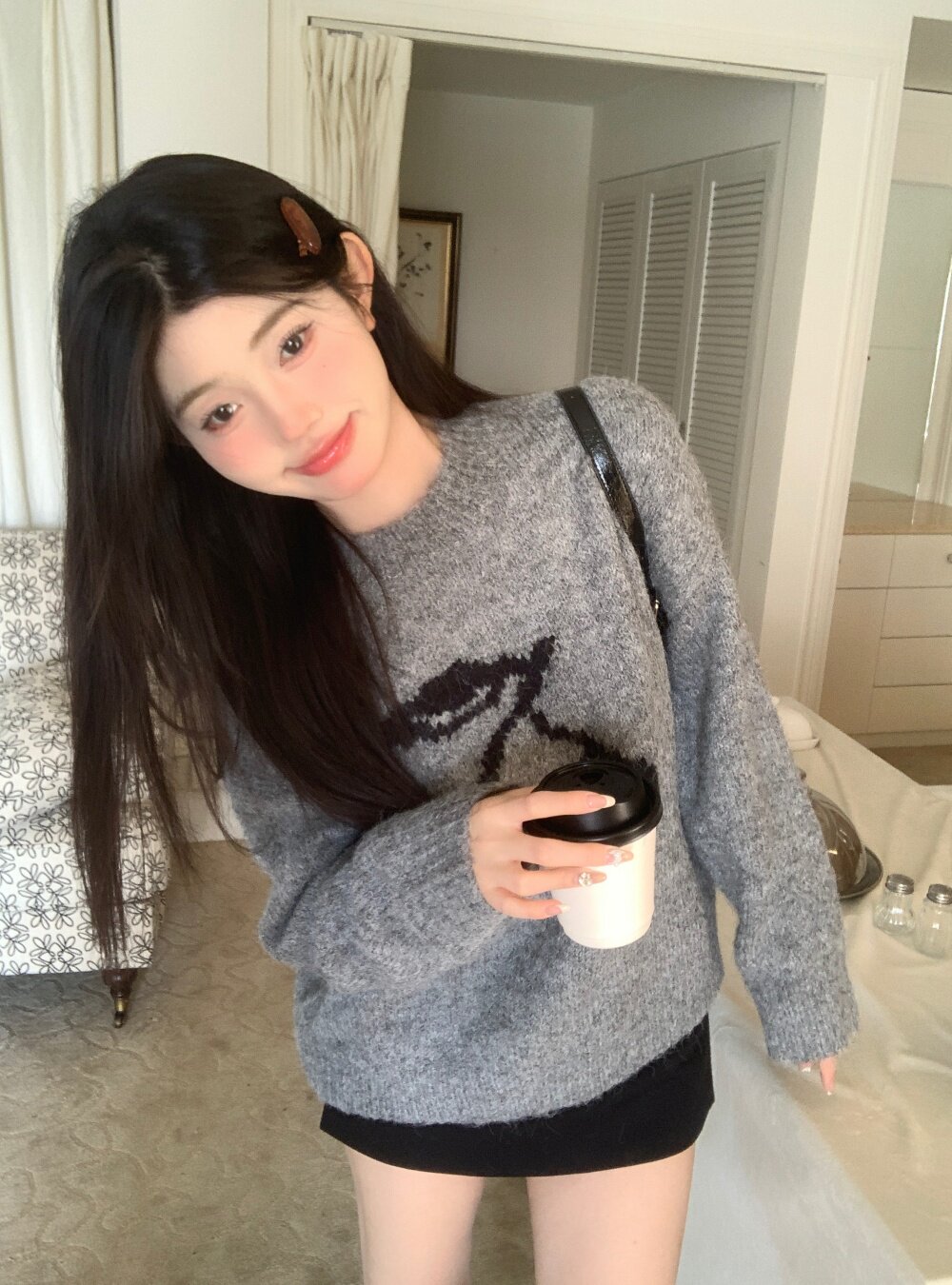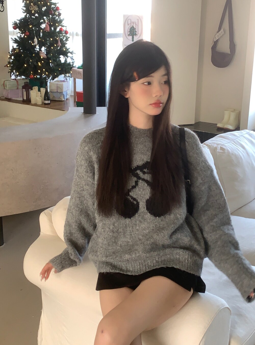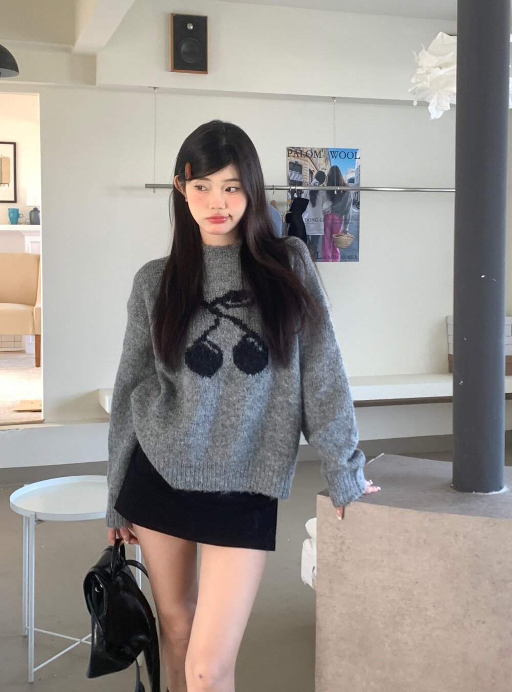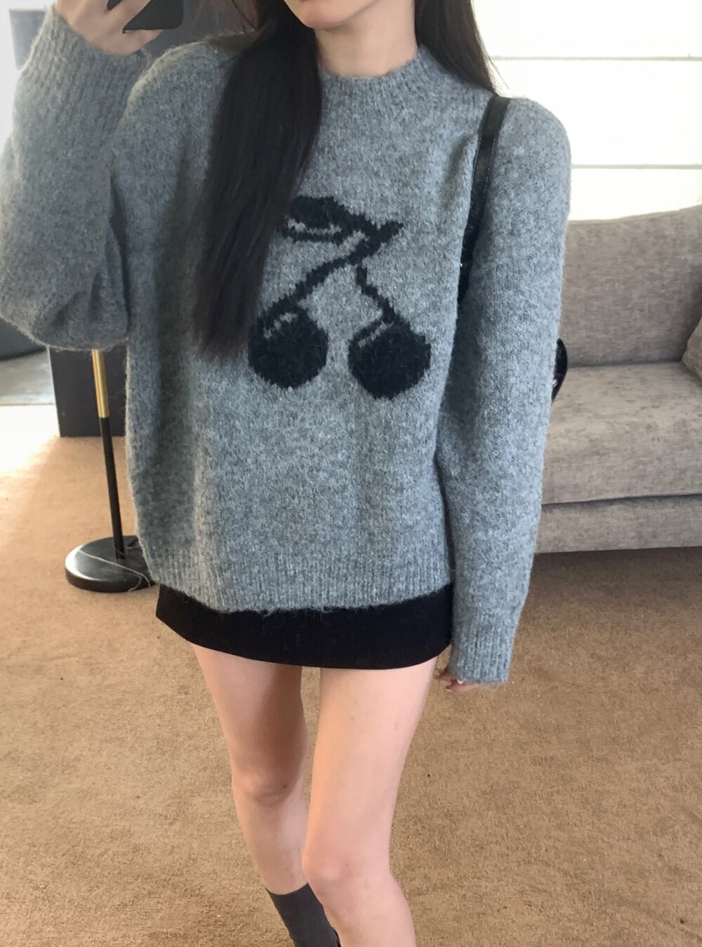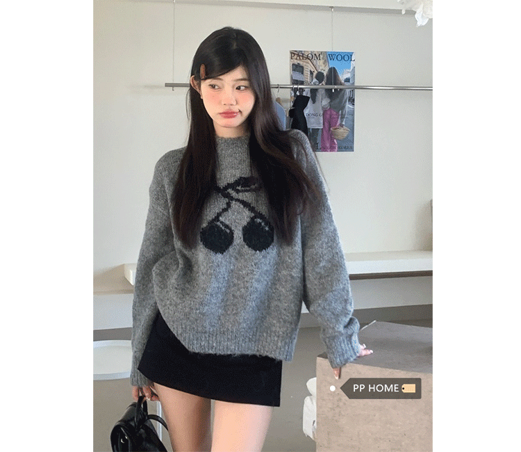 PPHOME灰色甜美櫻桃提花加厚毛衣女秋冬小個子軟糯寬松針織衫上衣