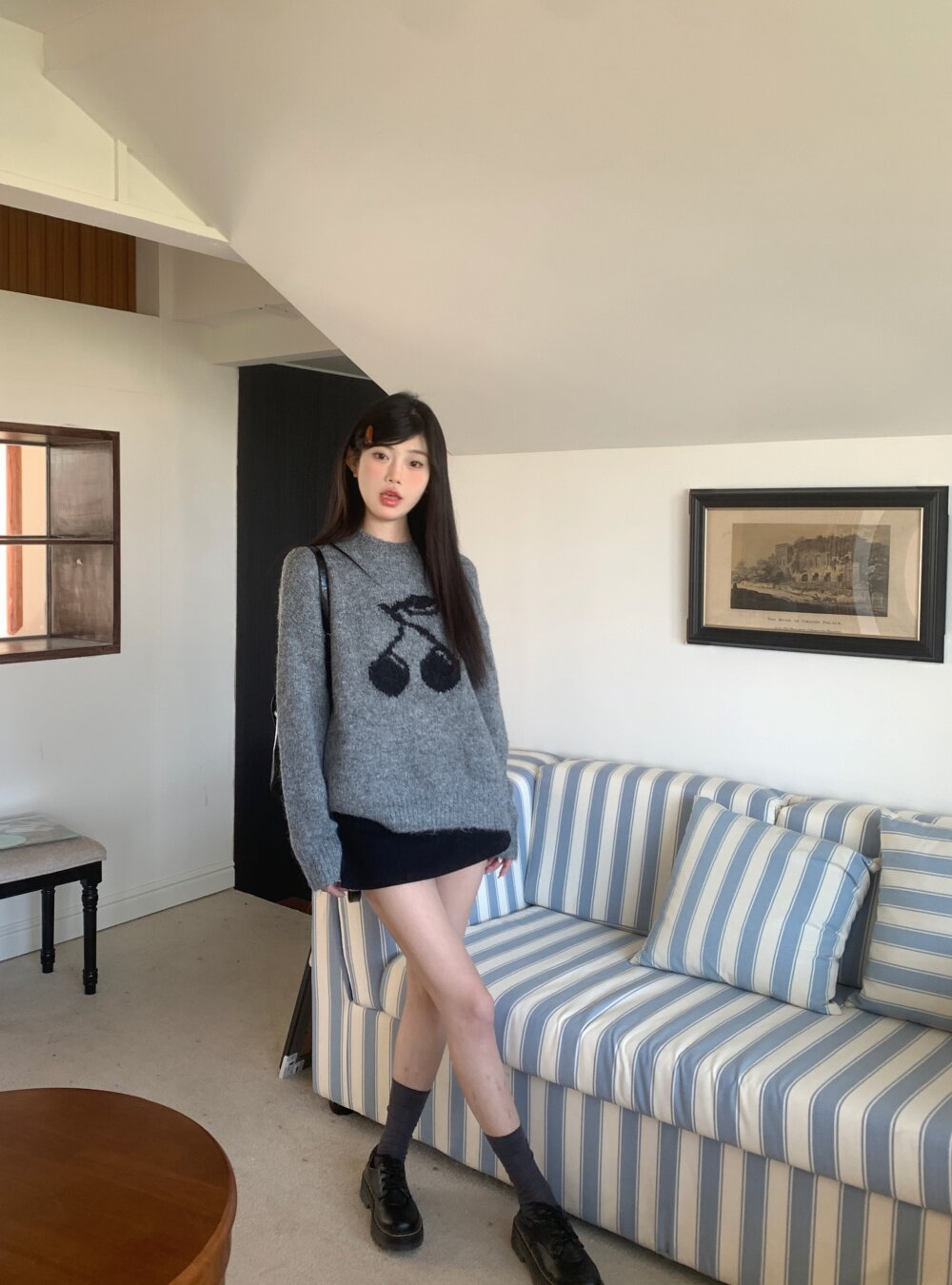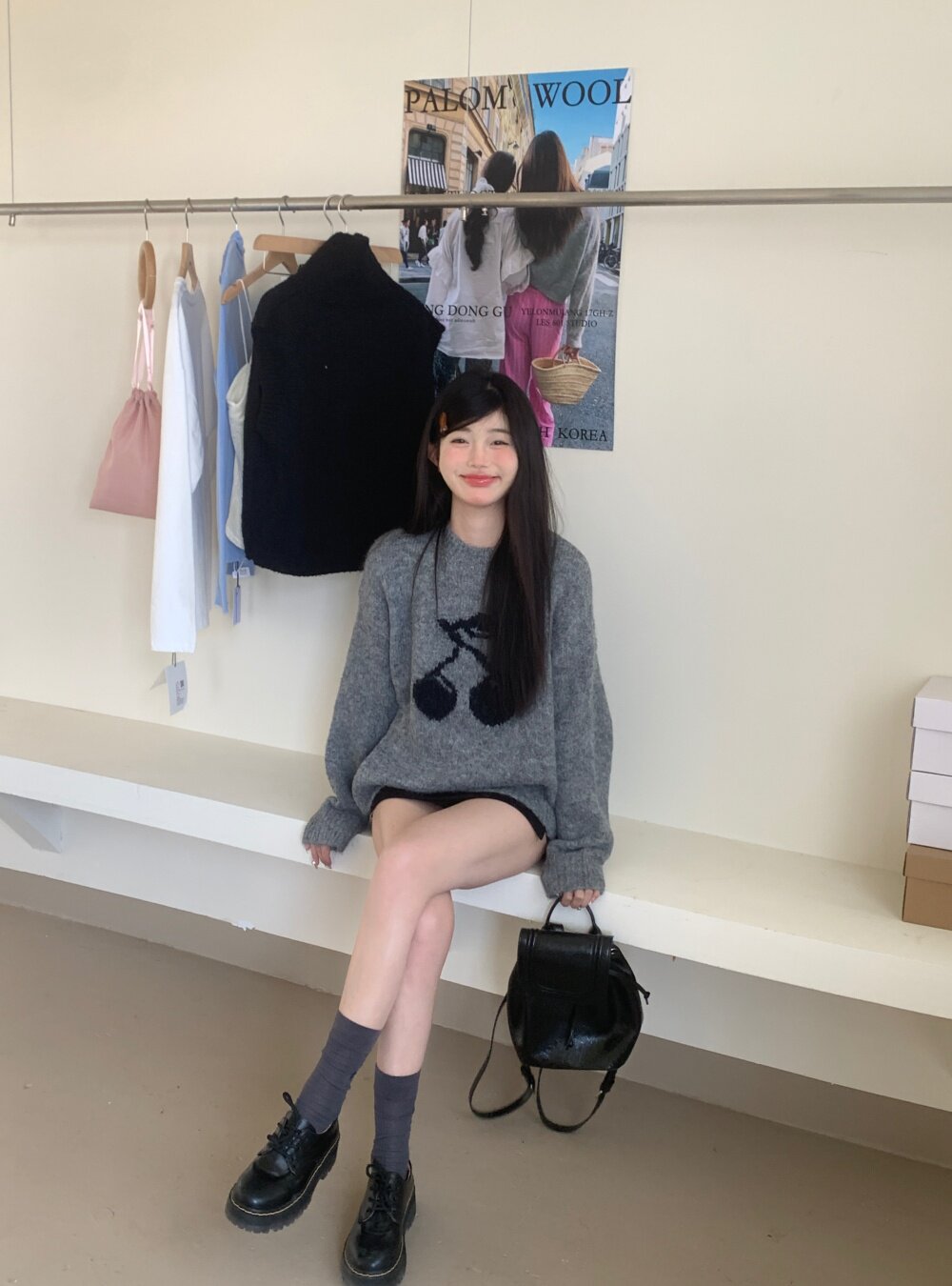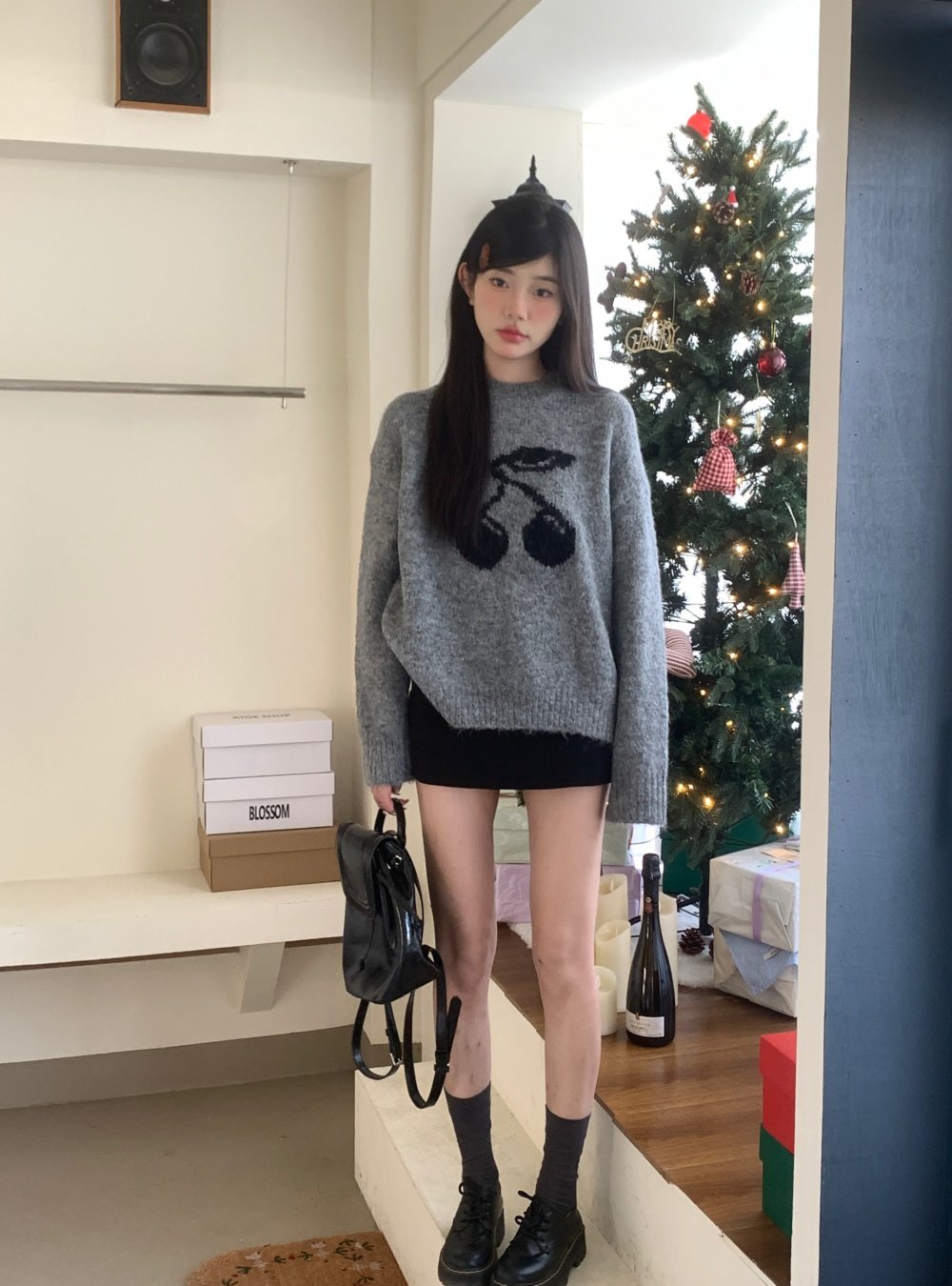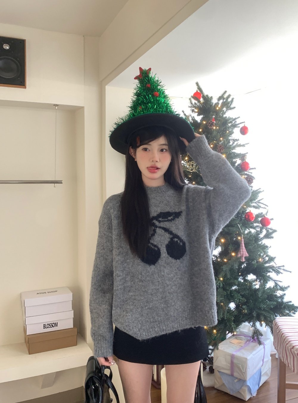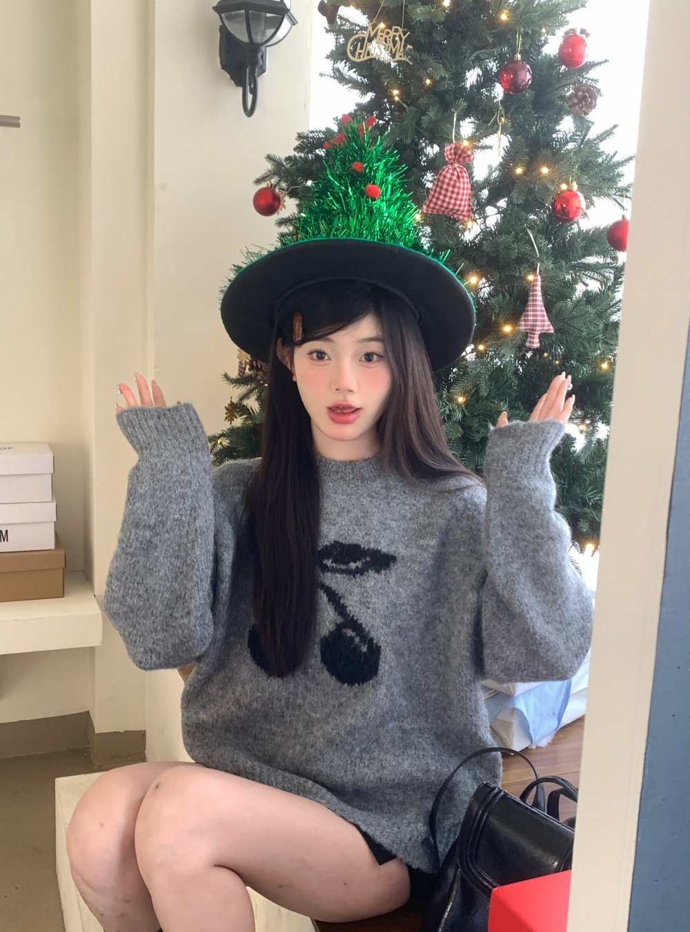 PPHOME灰色甜美櫻桃提花加厚毛衣女秋冬小個子軟糯寬松針織衫上衣