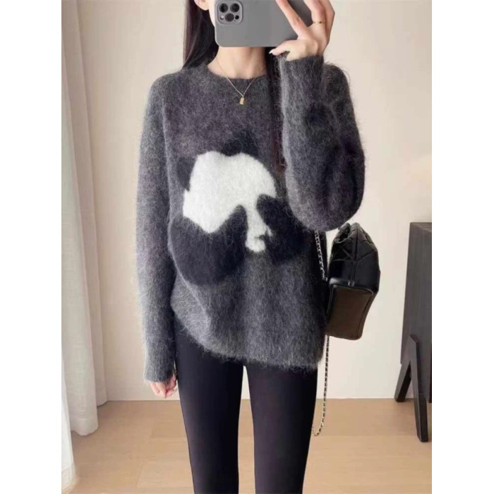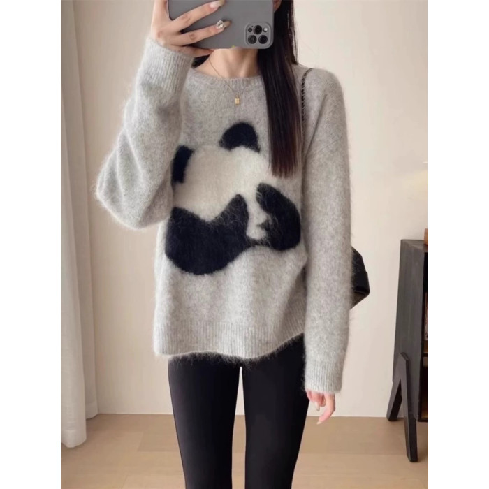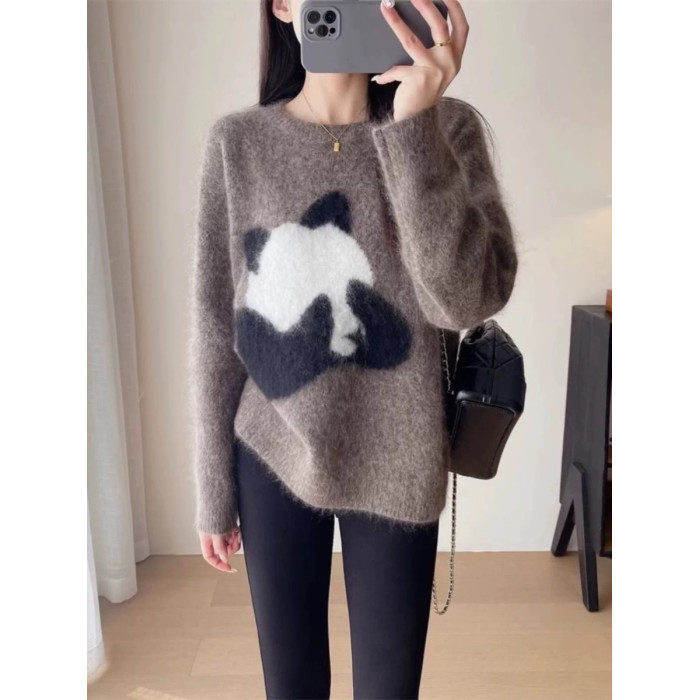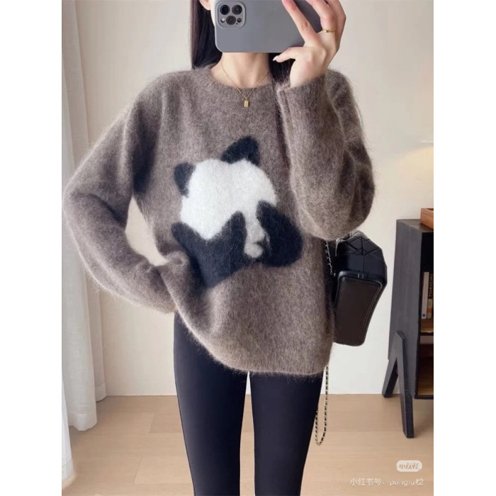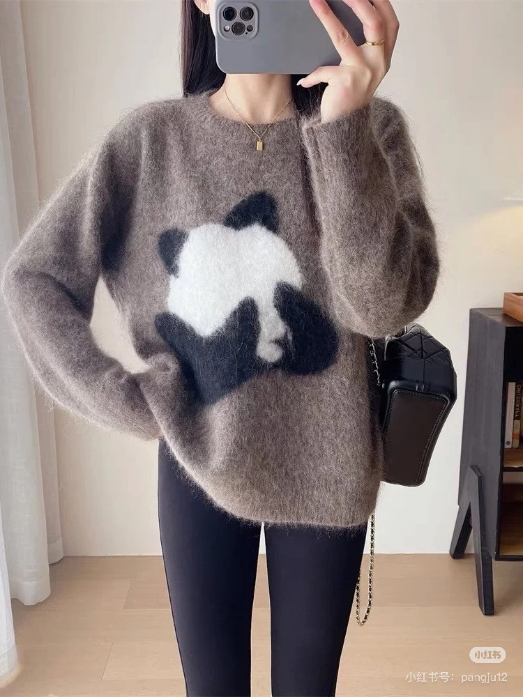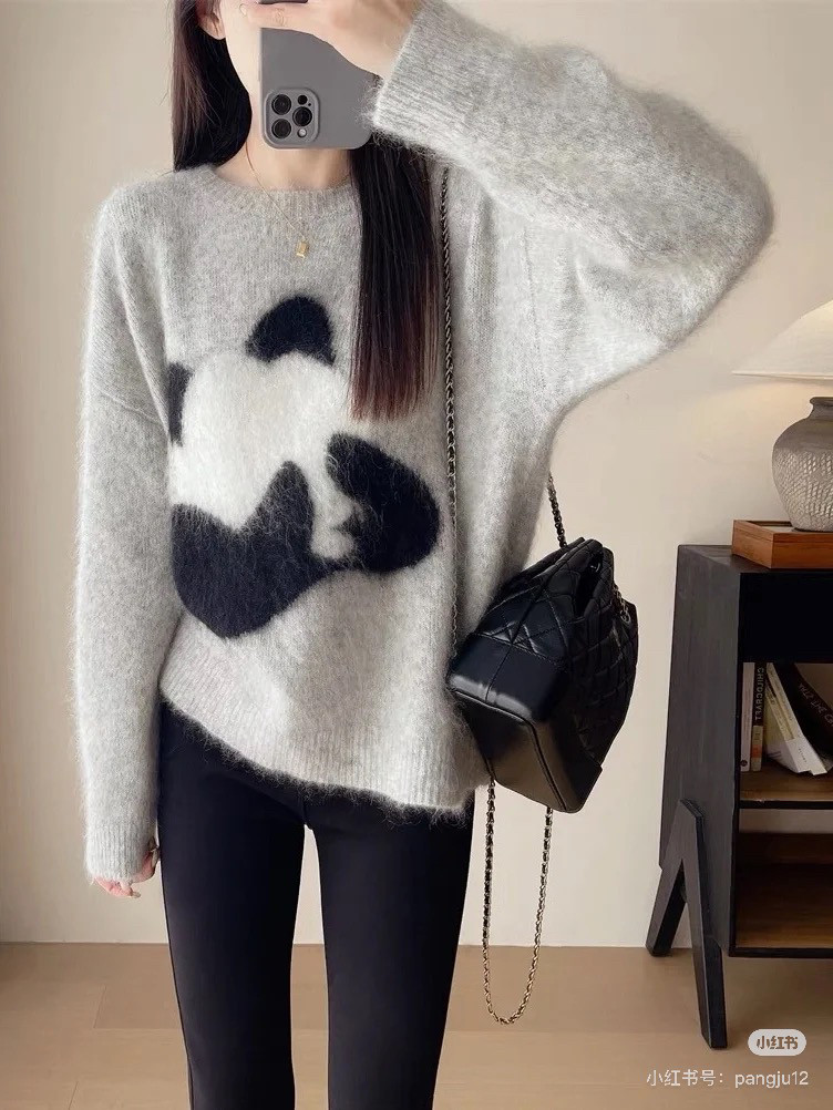 〖egg雞蛋〗羊駝毛絨絨熊貓提花慵懶風 軟糯拉毛套頭針織毛衣女