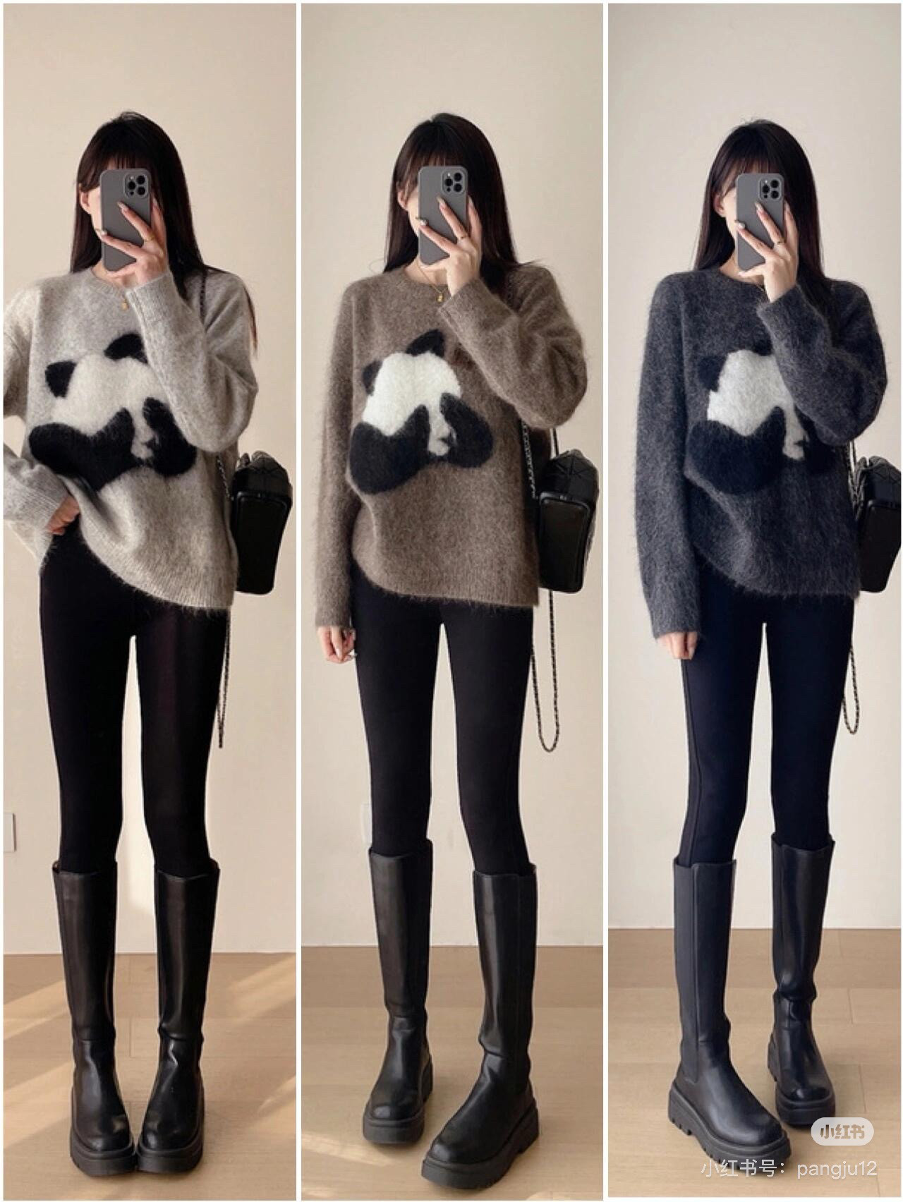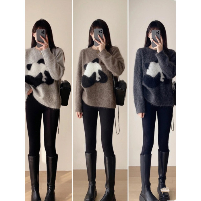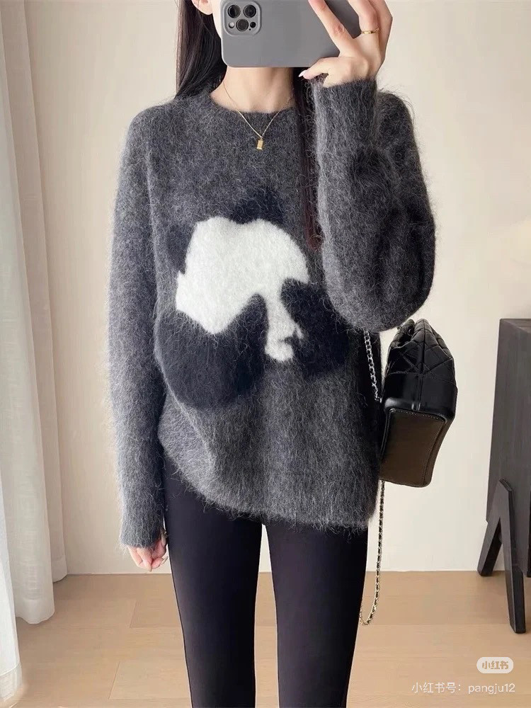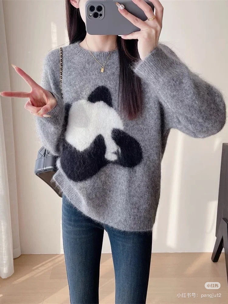 〖egg雞蛋〗羊駝毛絨絨熊貓提花慵懶風 軟糯拉毛套頭針織毛衣女