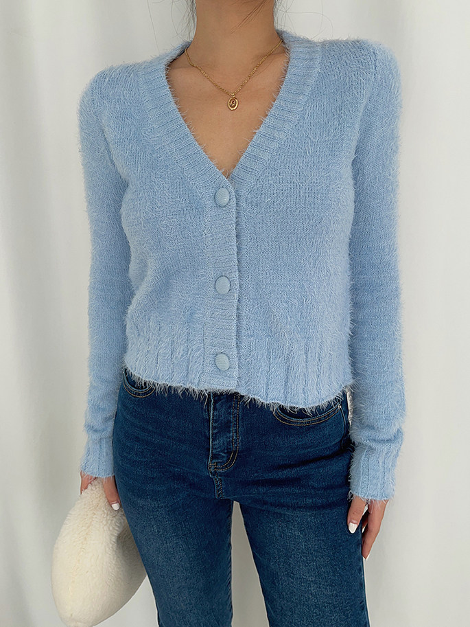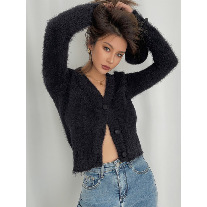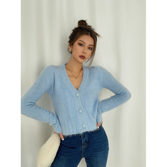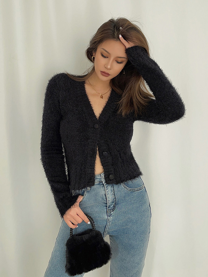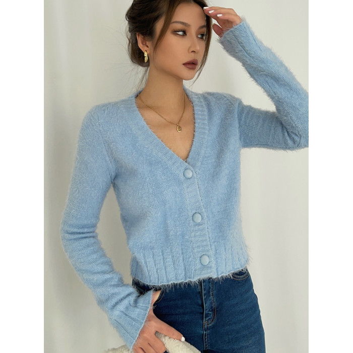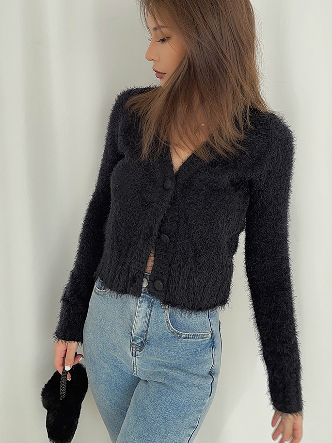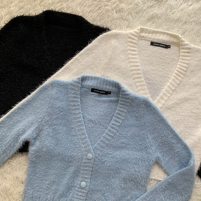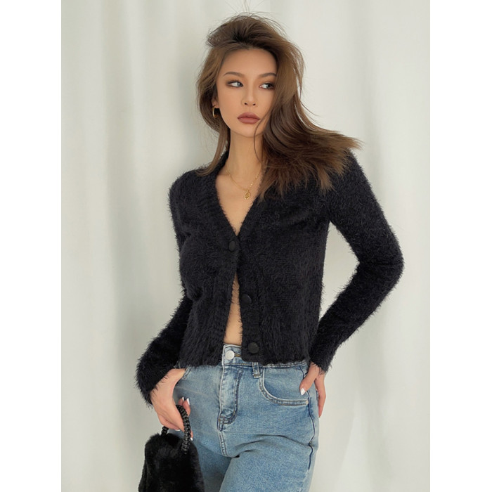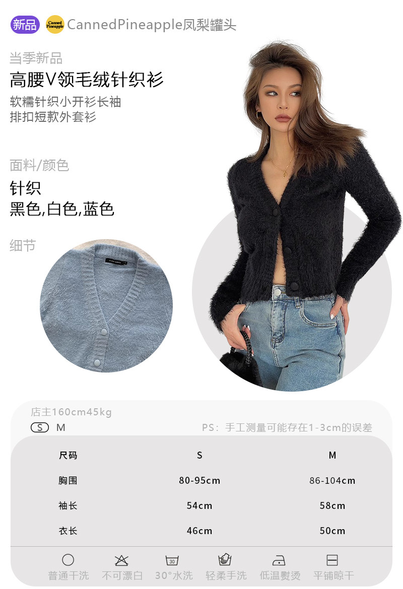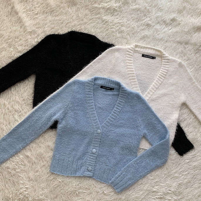 辣妹顯瘦高腰V領毛絨軟糯針織小開衫長袖毛衣短款外套2024年新款