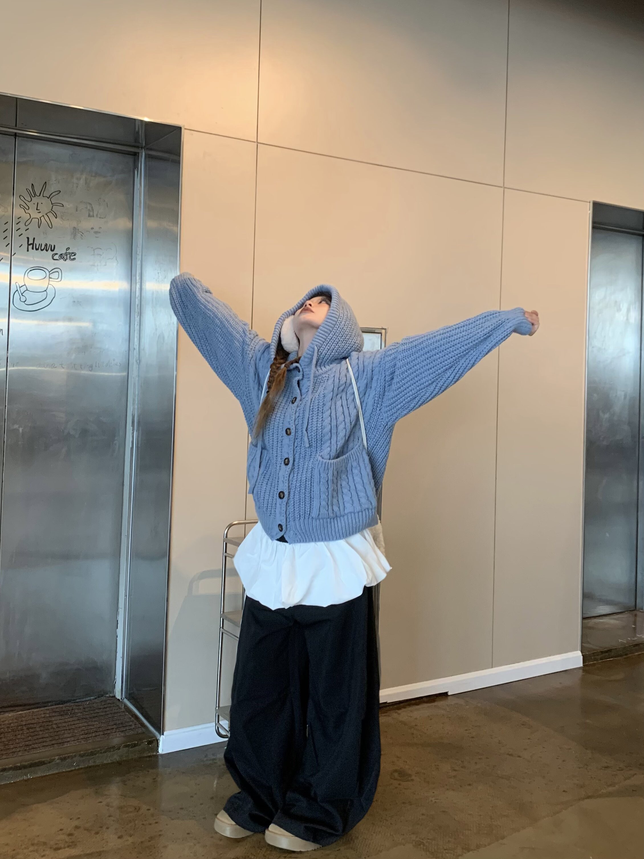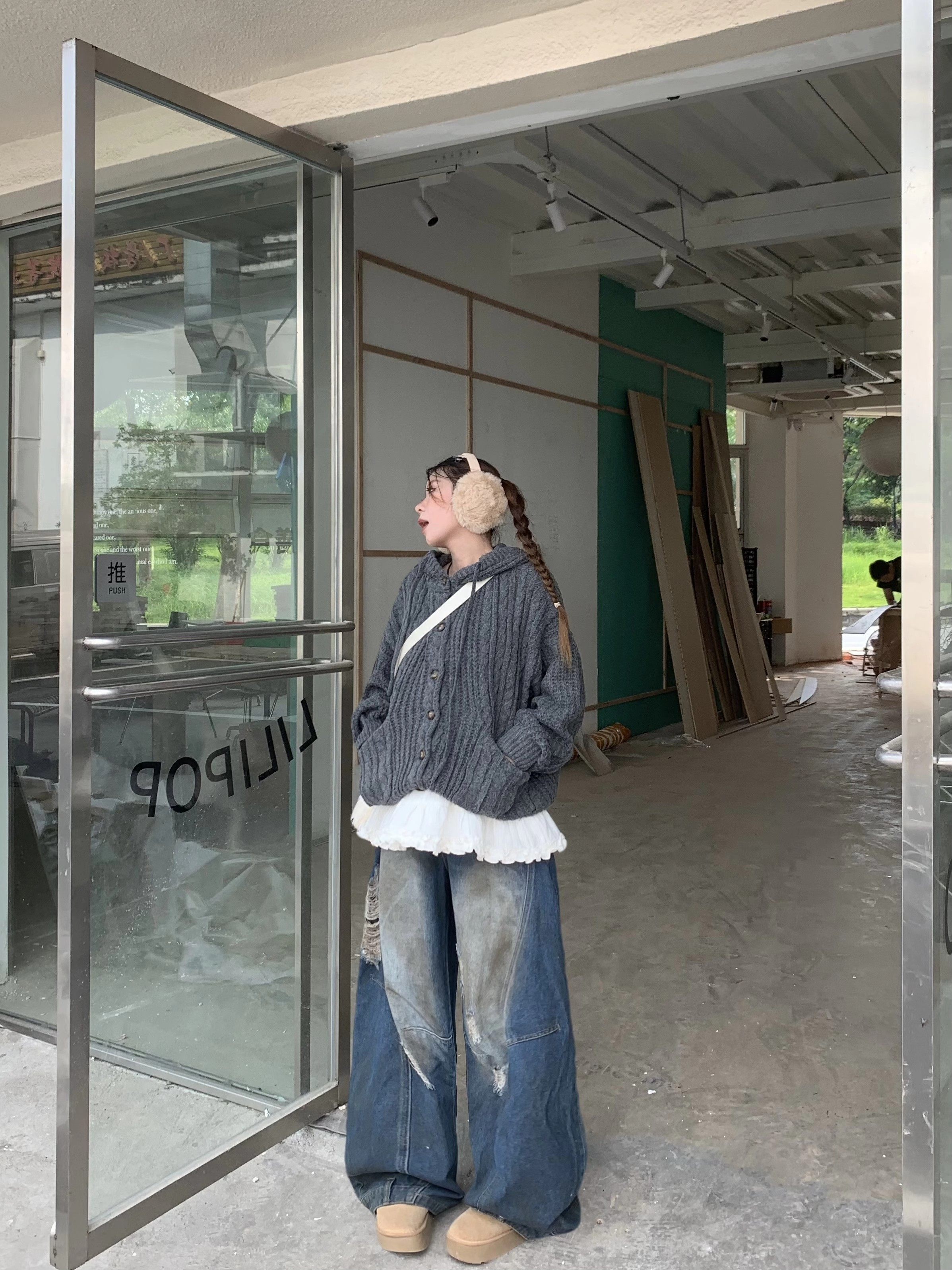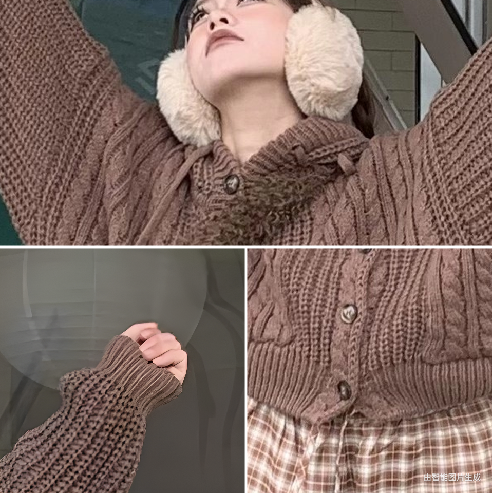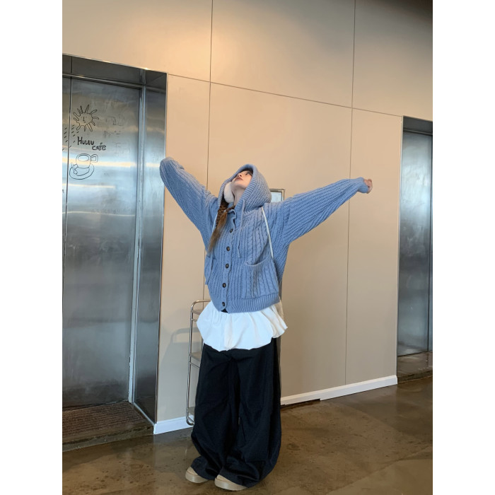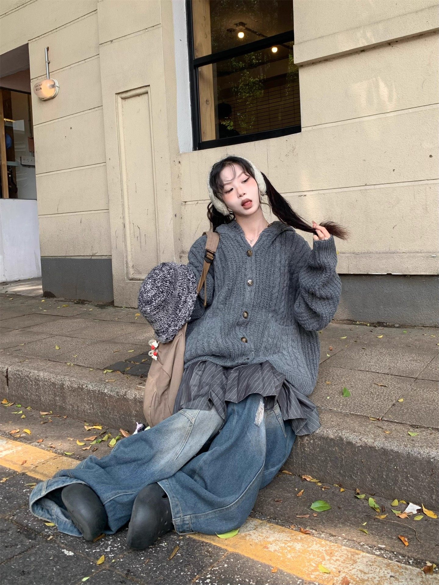 美式復古慵懶風秋冬新款連帽開衫毛衣外套女設計感寬松針織上衣潮