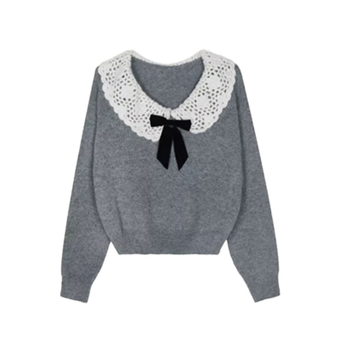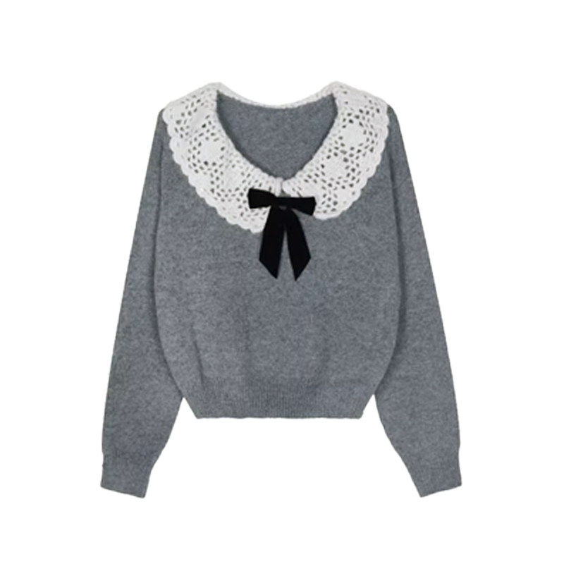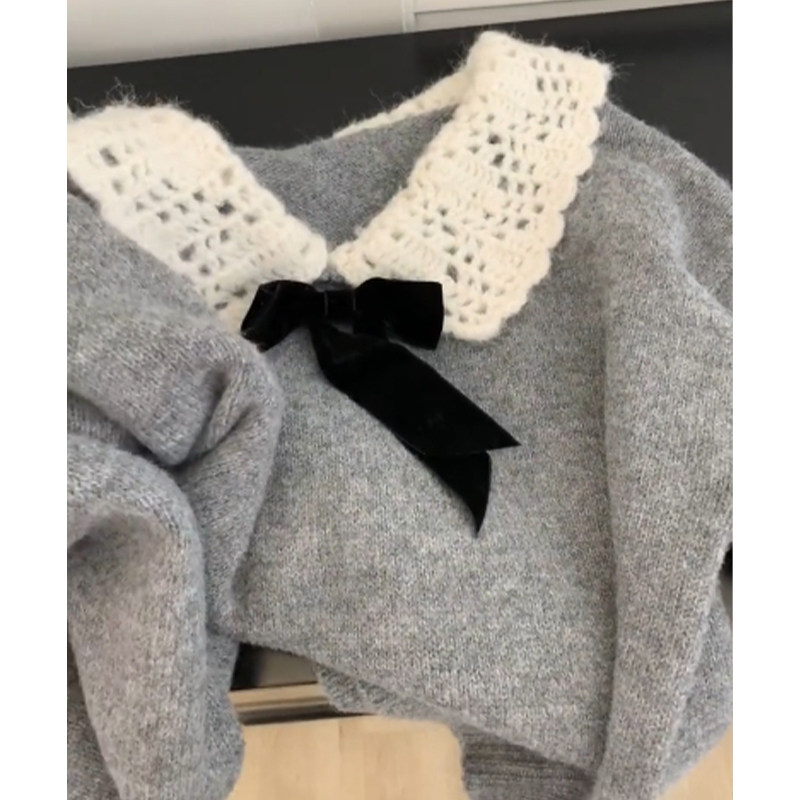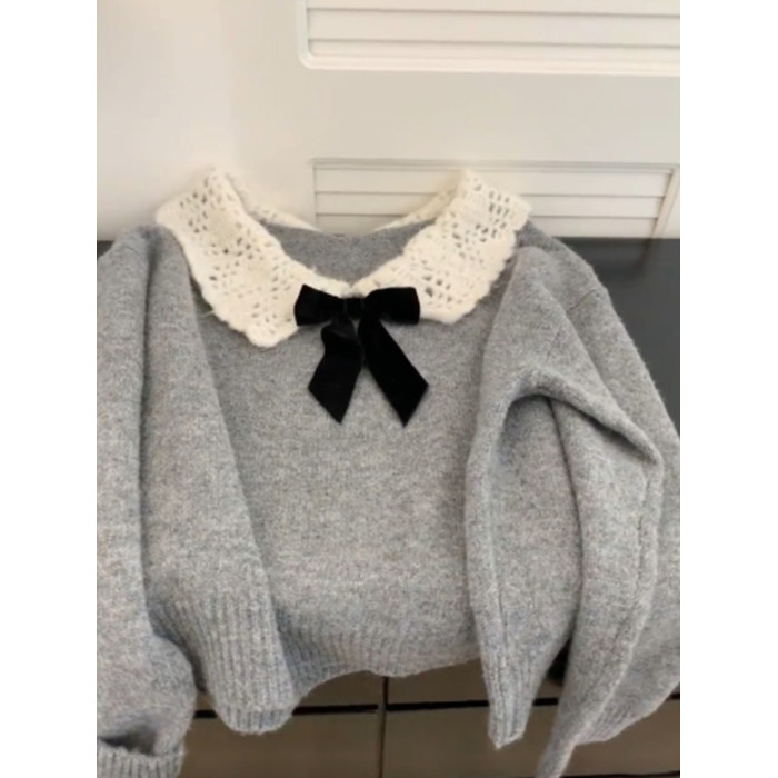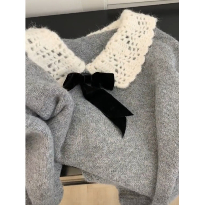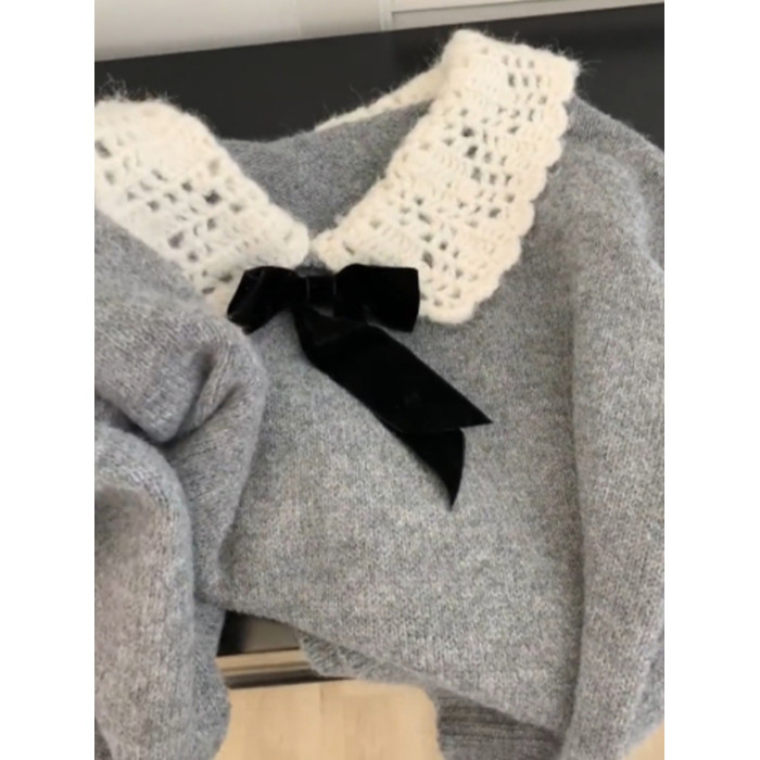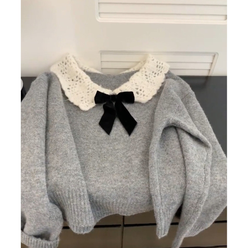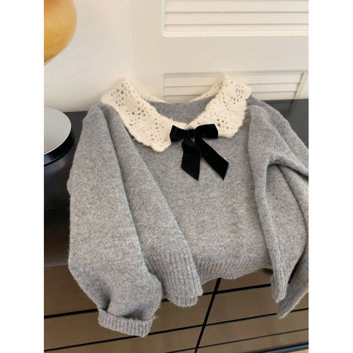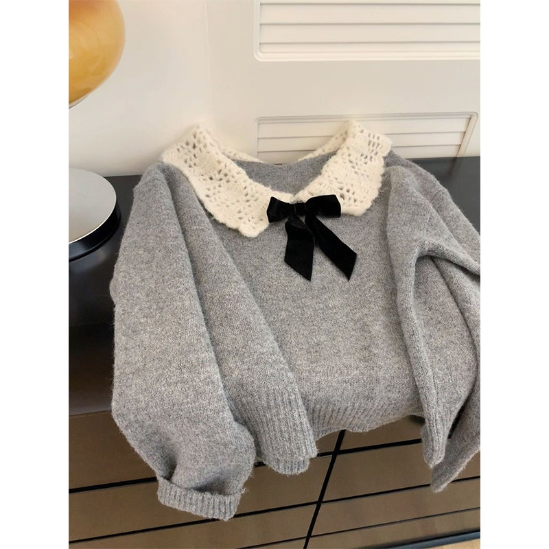 法式娃娃領蝴蝶結灰色套頭毛衣女秋冬季加厚寬松慵懶風針織衫上衣