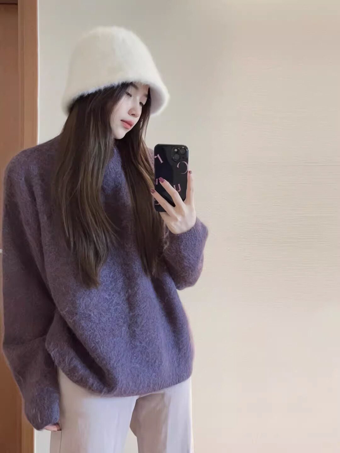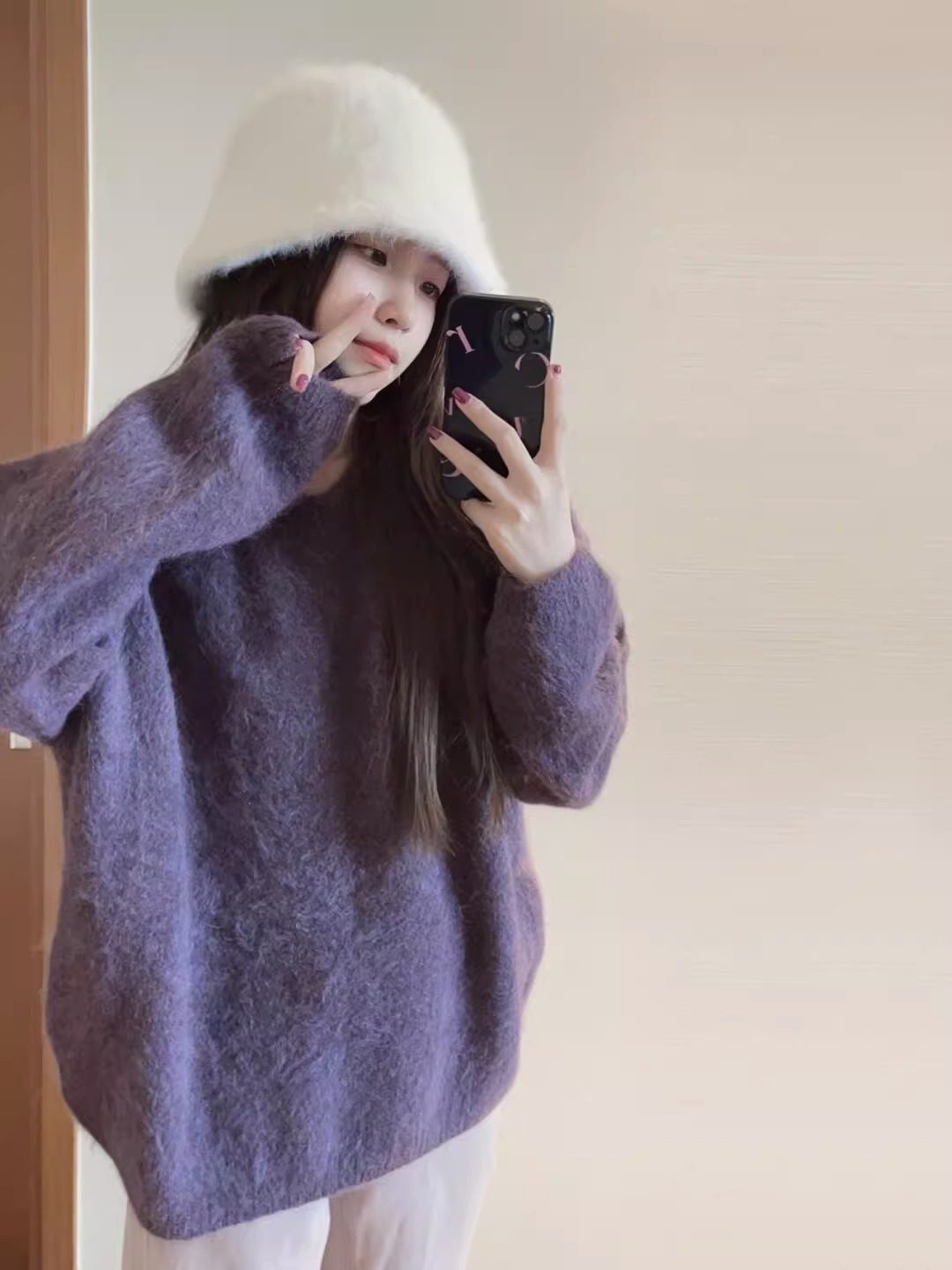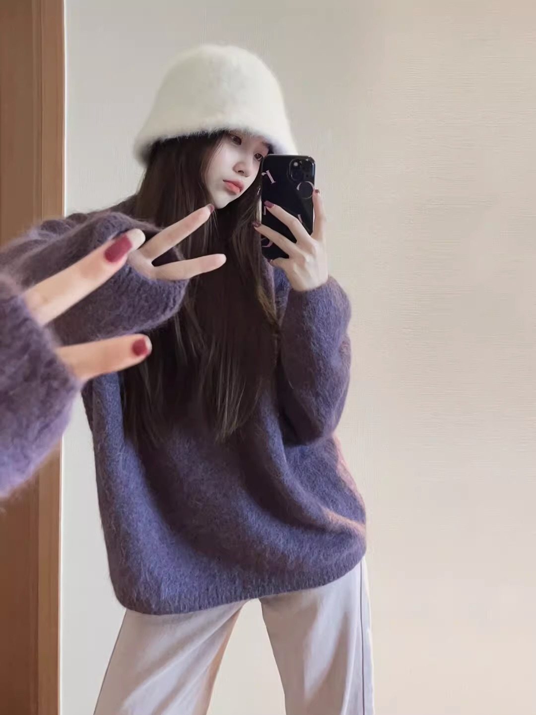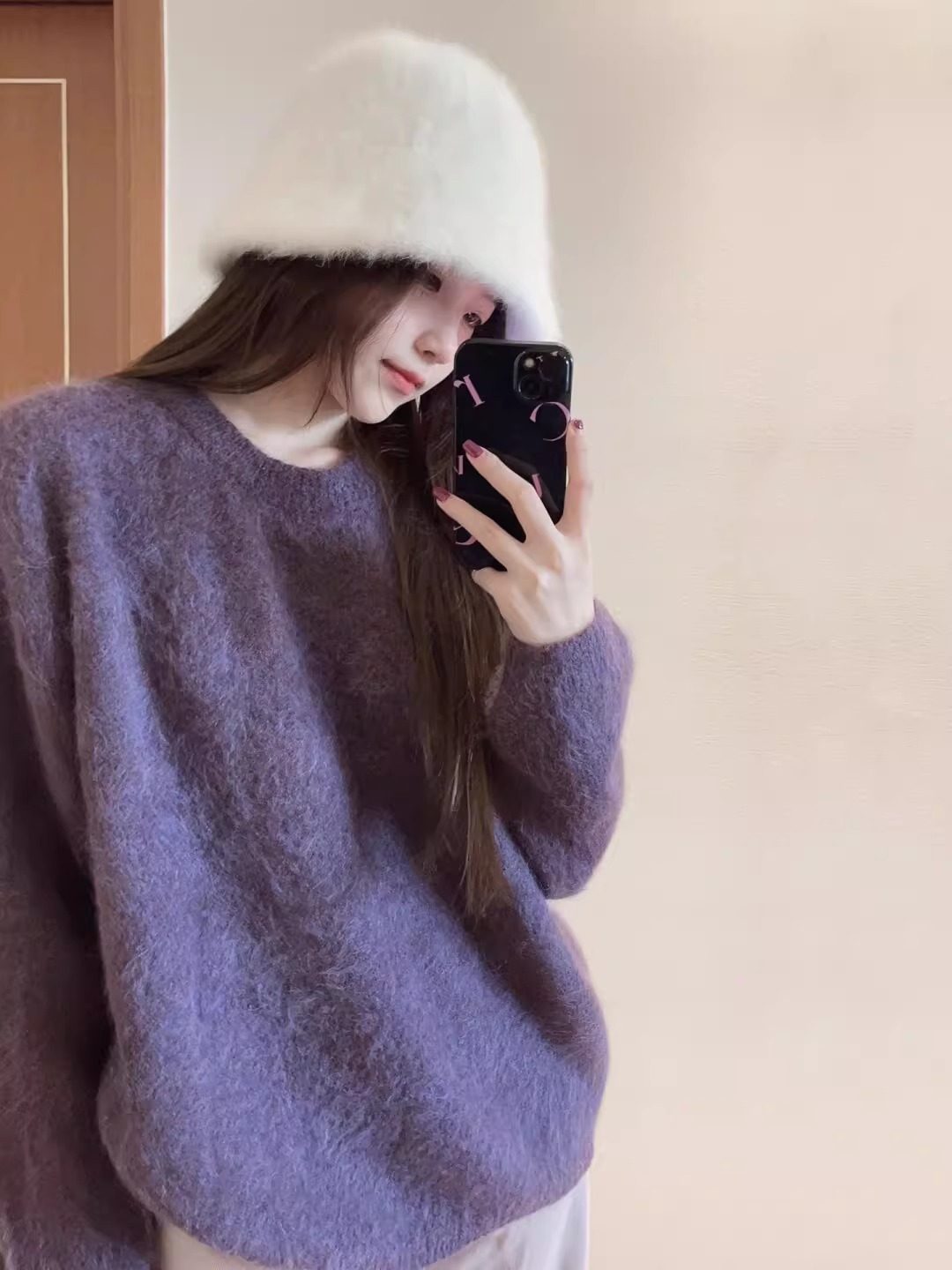 高級感浣熊絨紫色毛衣女秋冬軟糯加厚保暖馬海毛圓領氣質針織上衣