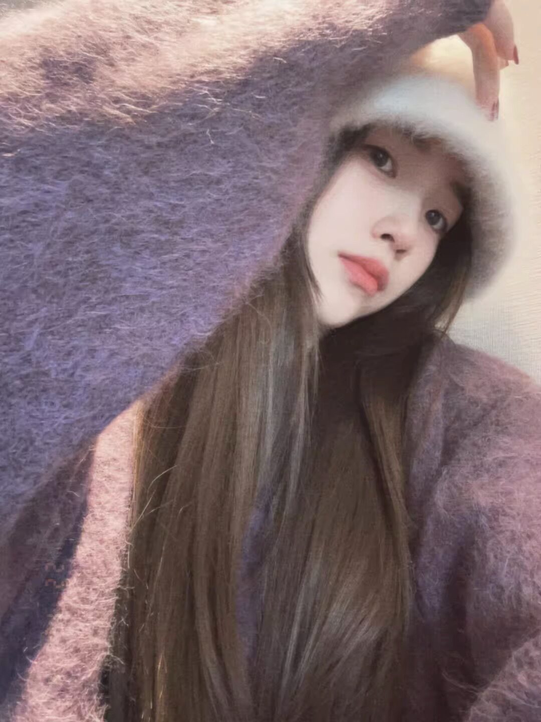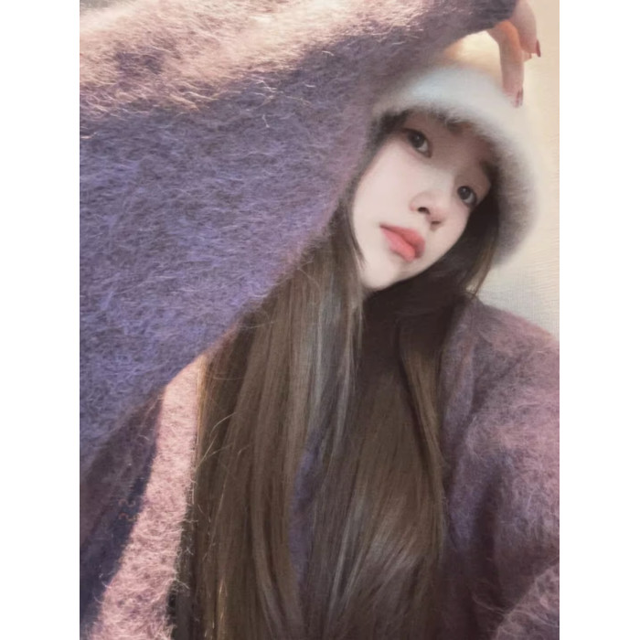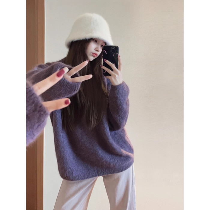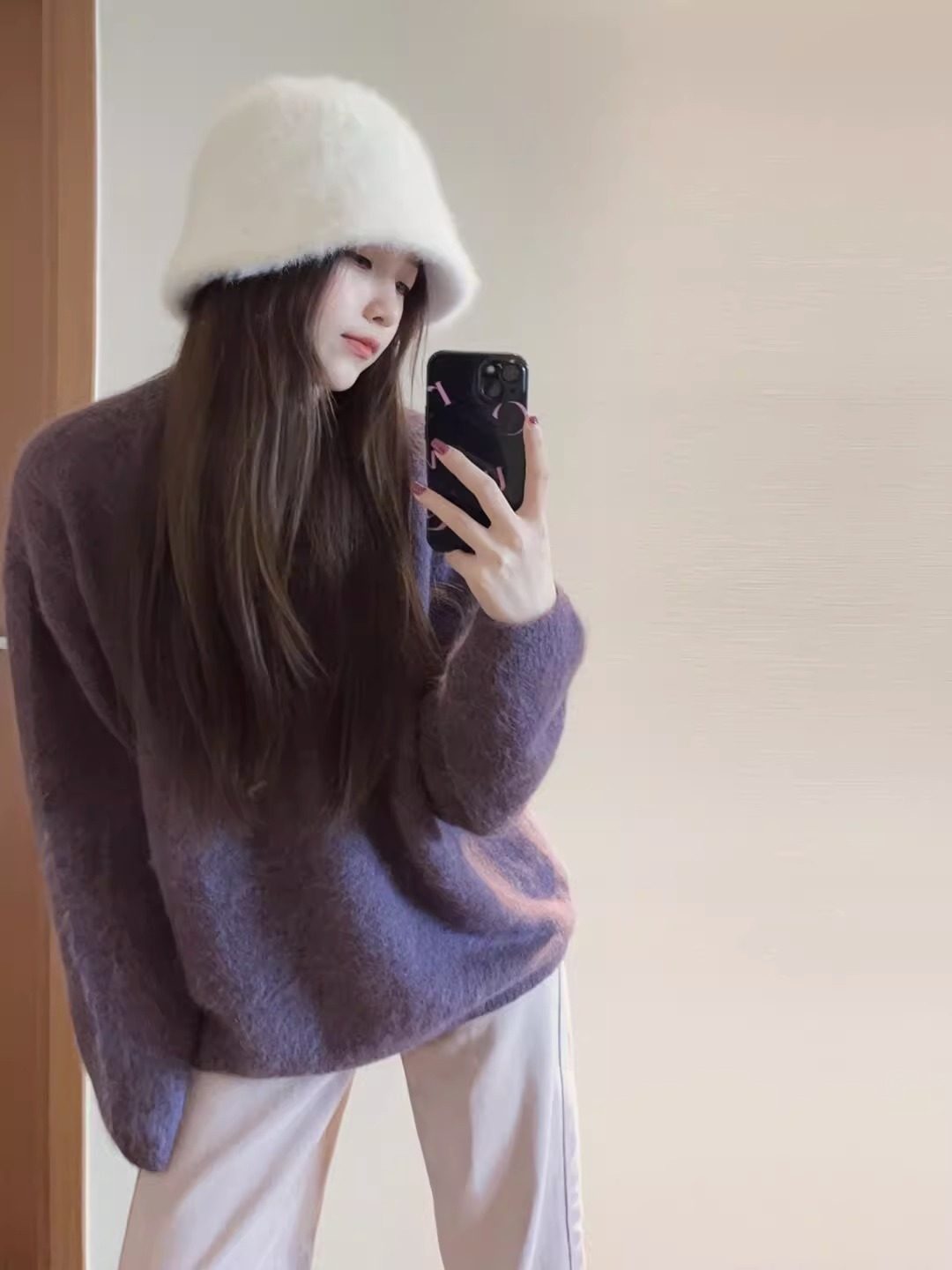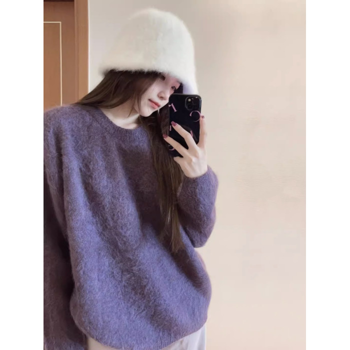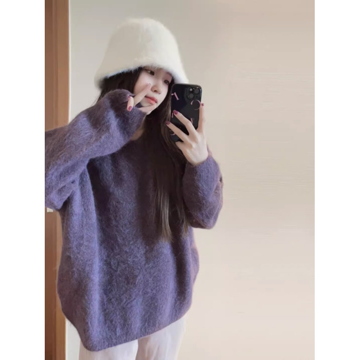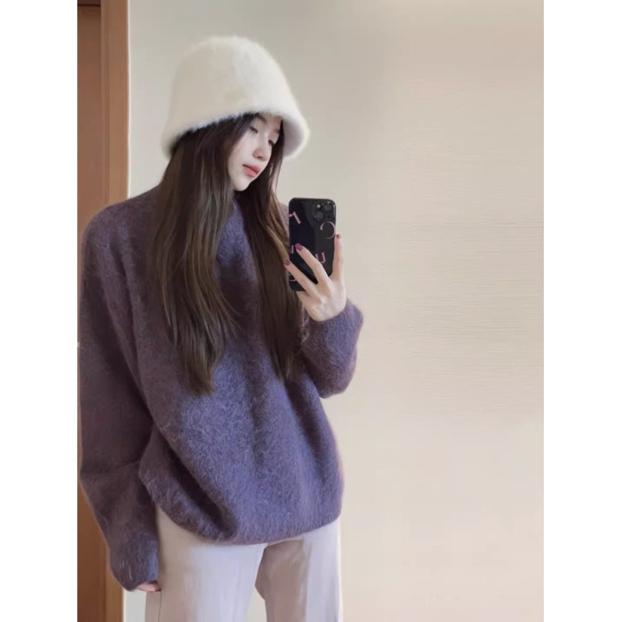 高級感浣熊絨紫色毛衣女秋冬軟糯加厚保暖馬海毛圓領氣質針織上衣