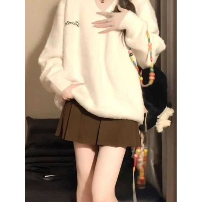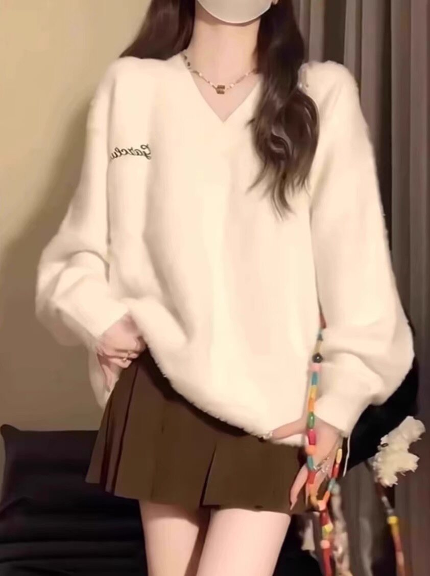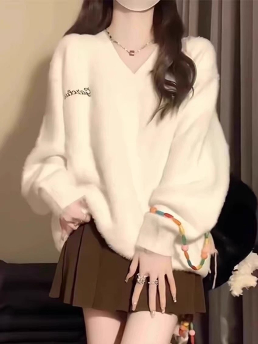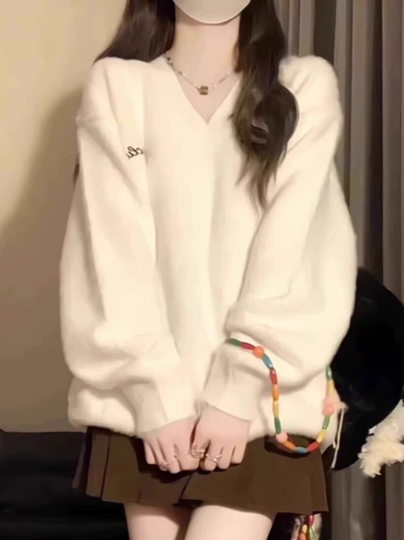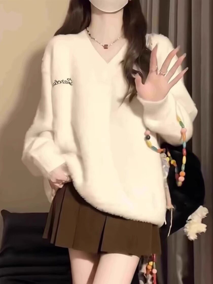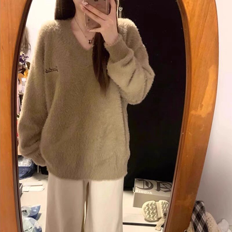 仿水貂絨毛衣女秋冬季慵懶風外穿V領針織衫高級感學院風寬松上衣