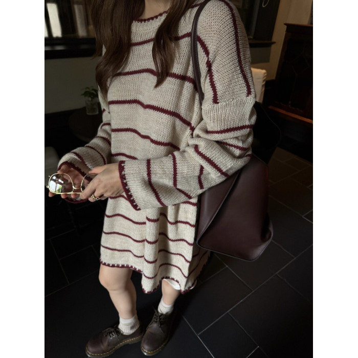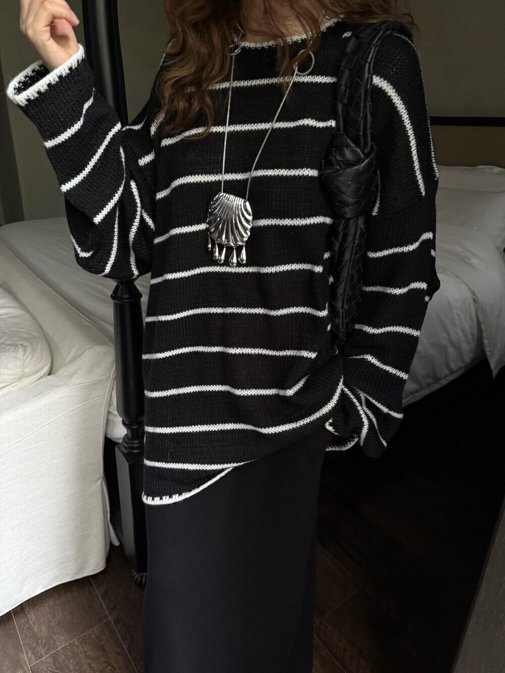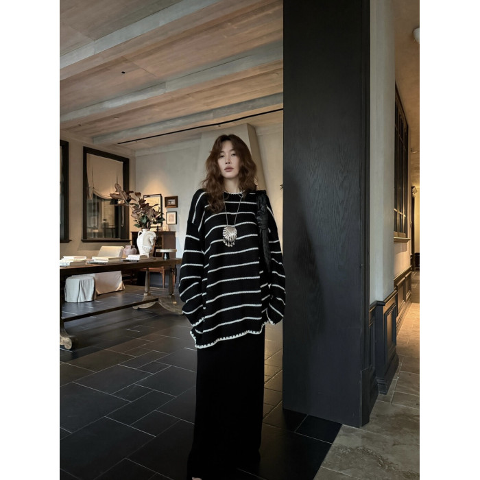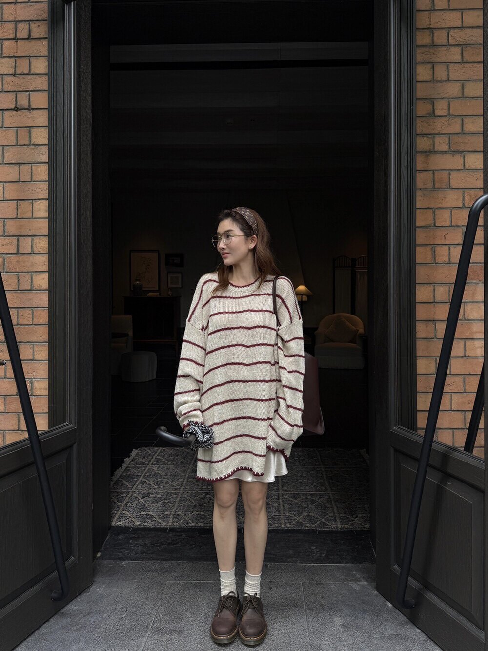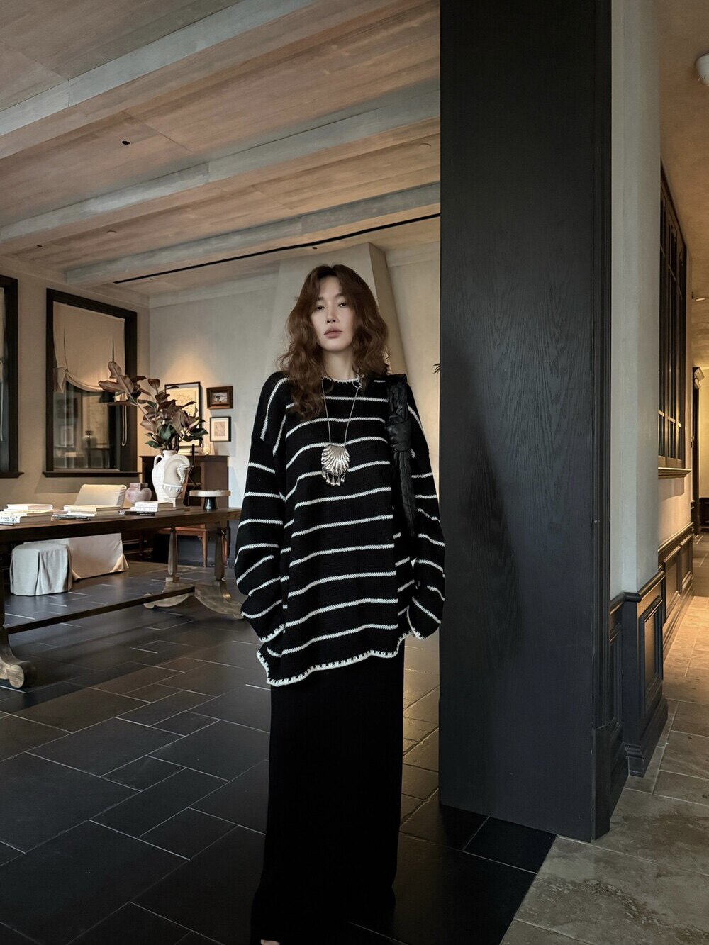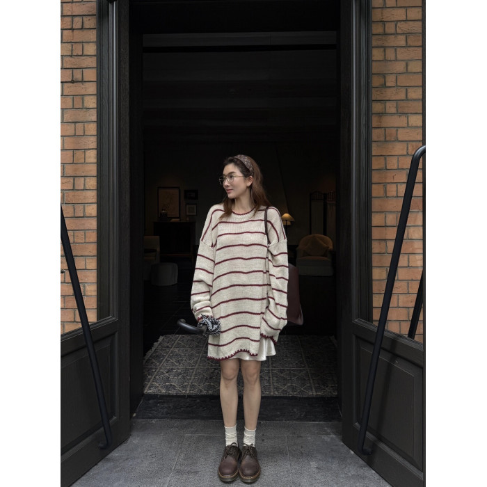 ALL IN十三行2025秋季新款寬松慵懶風休閒條紋中長款針織衫毛衣女