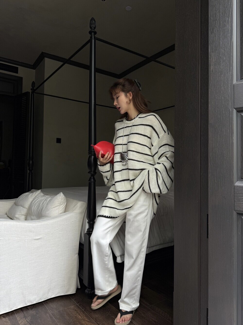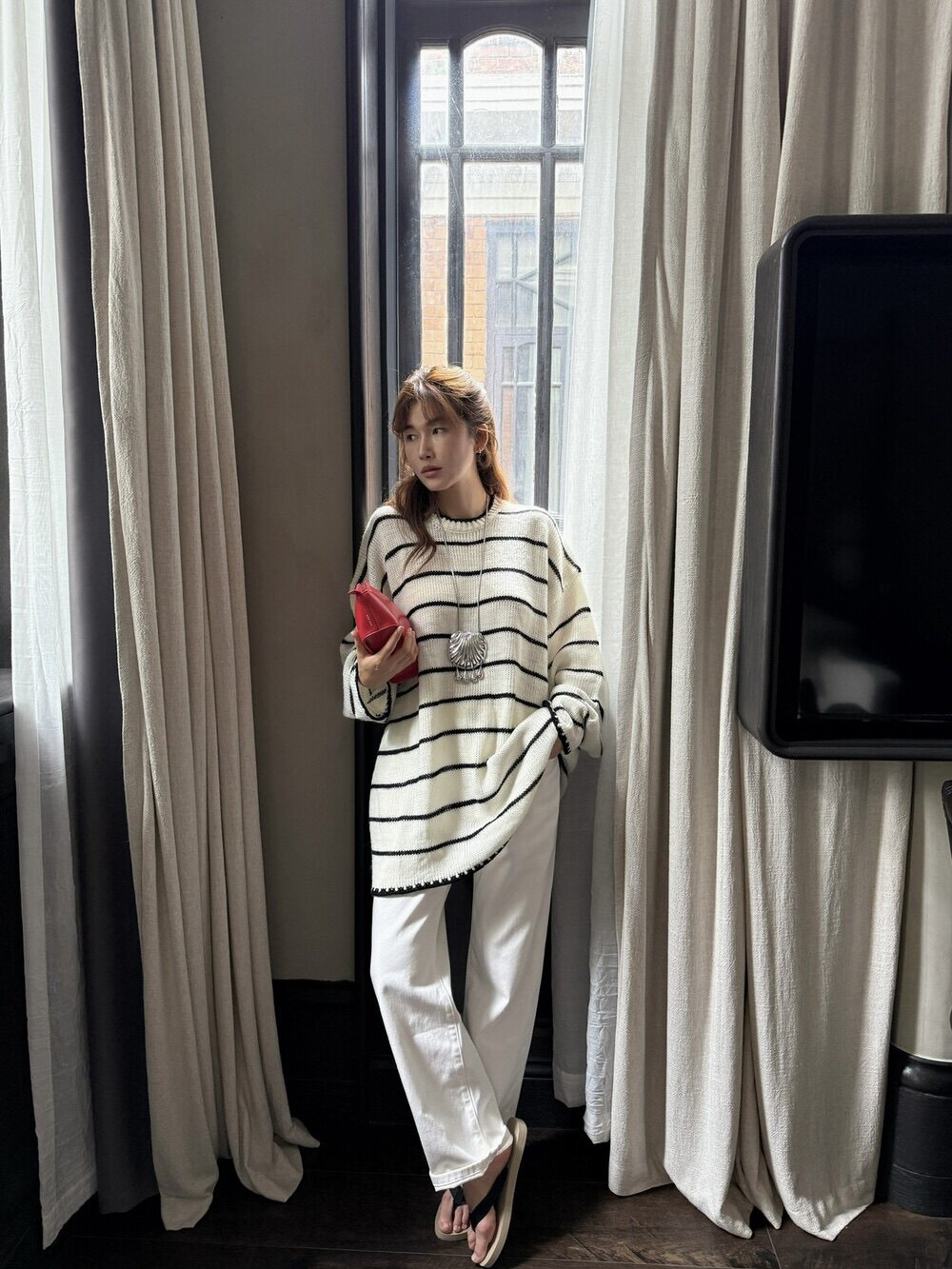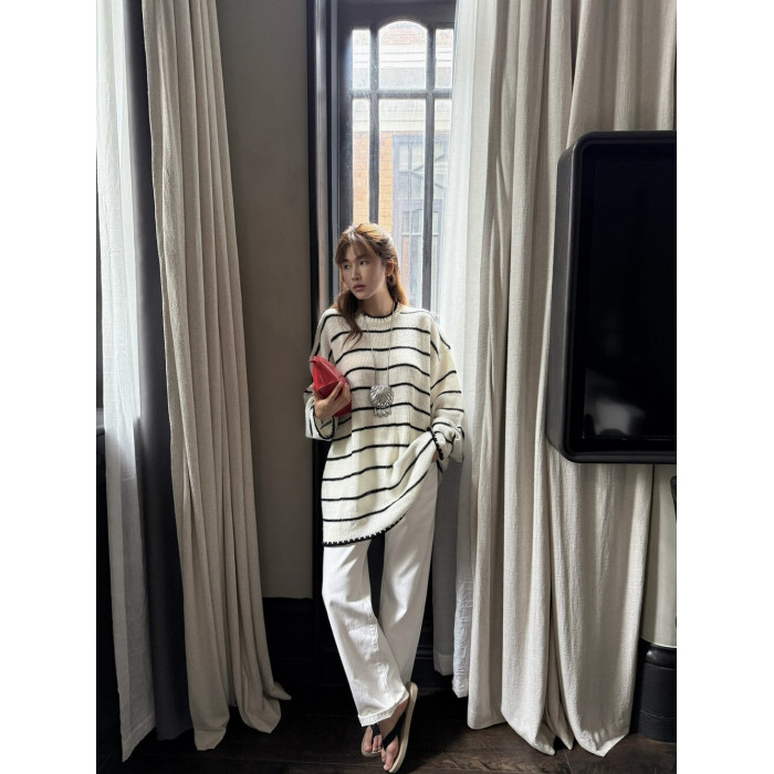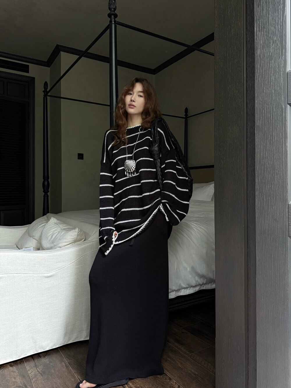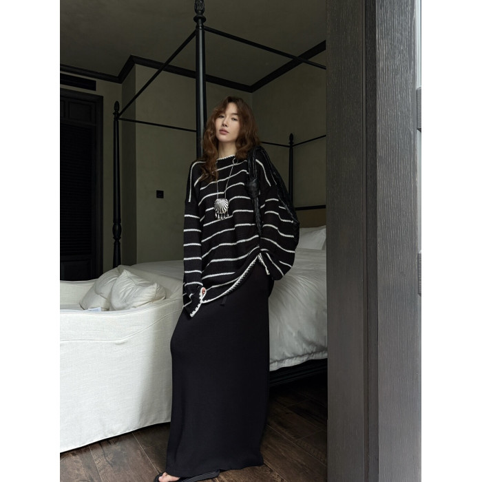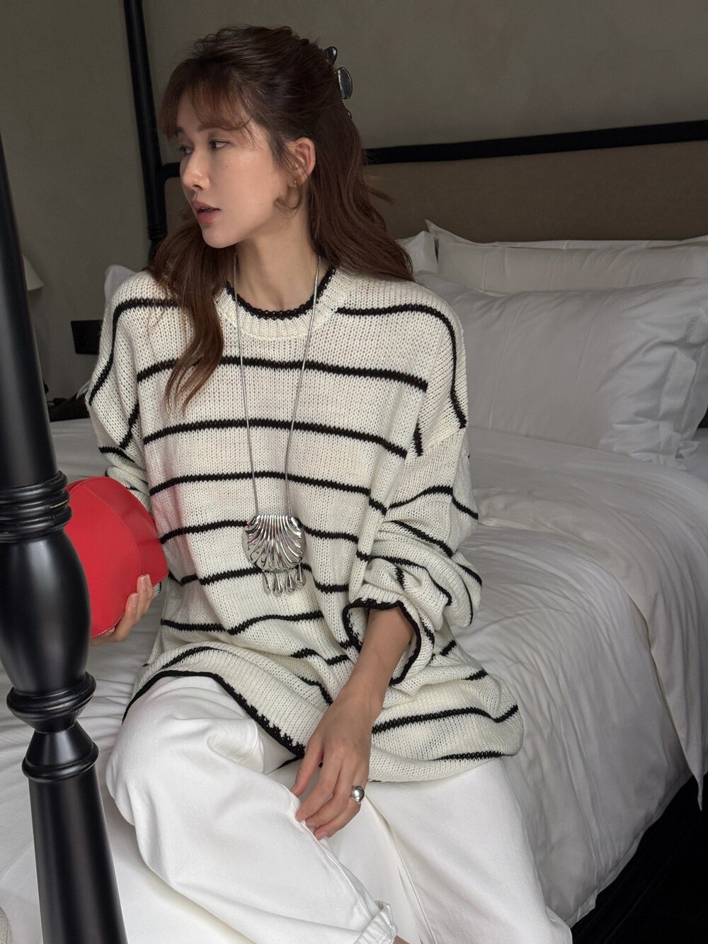 ALL IN十三行2025秋季新款寬松慵懶風休閒條紋中長款針織衫毛衣女