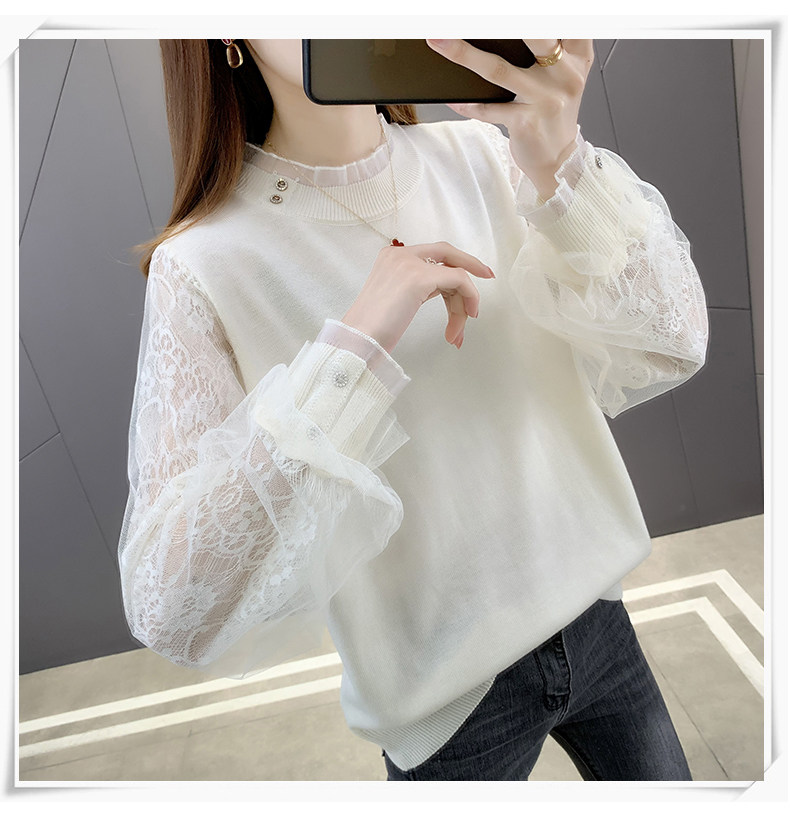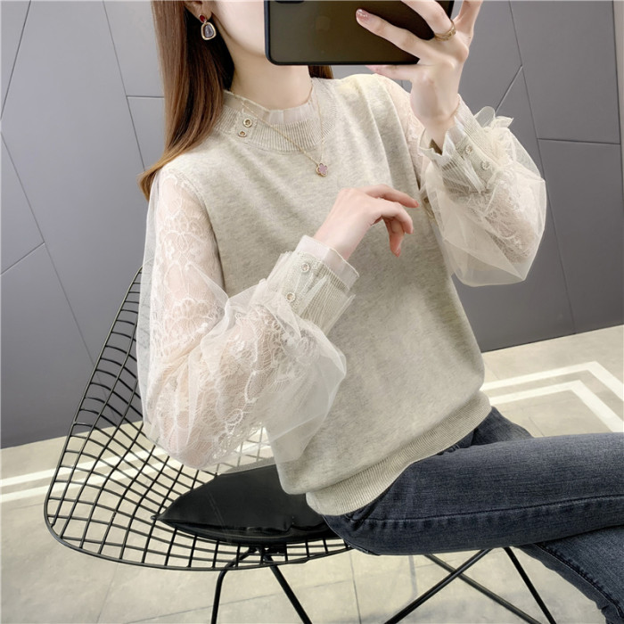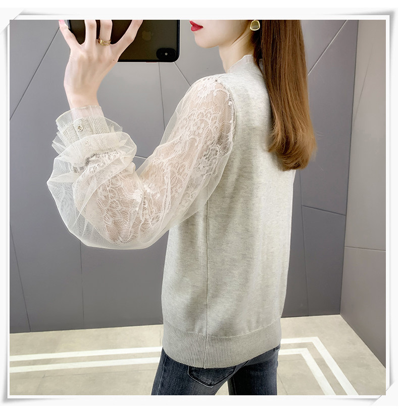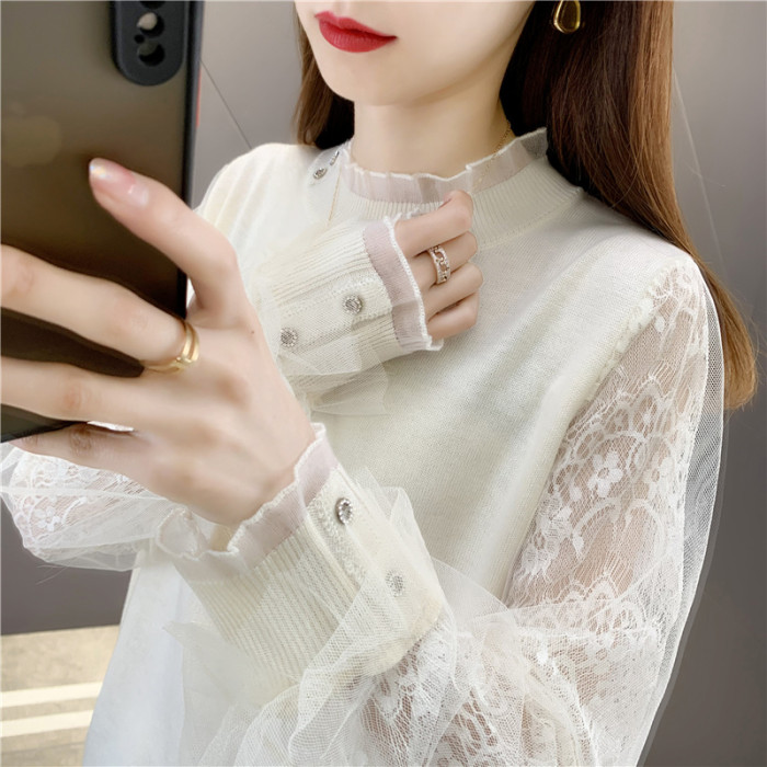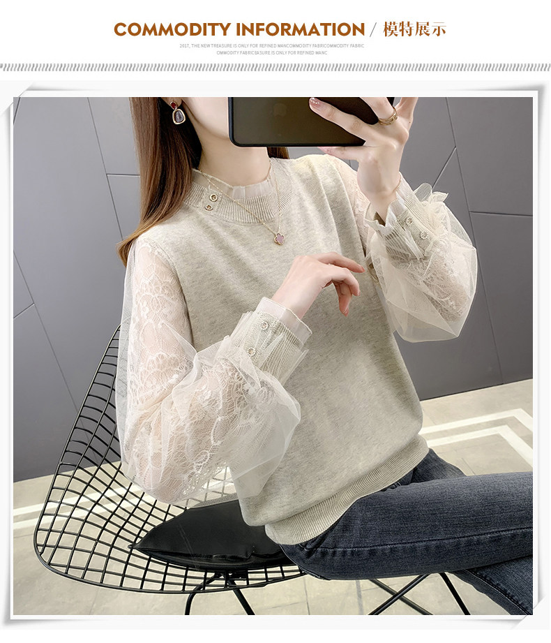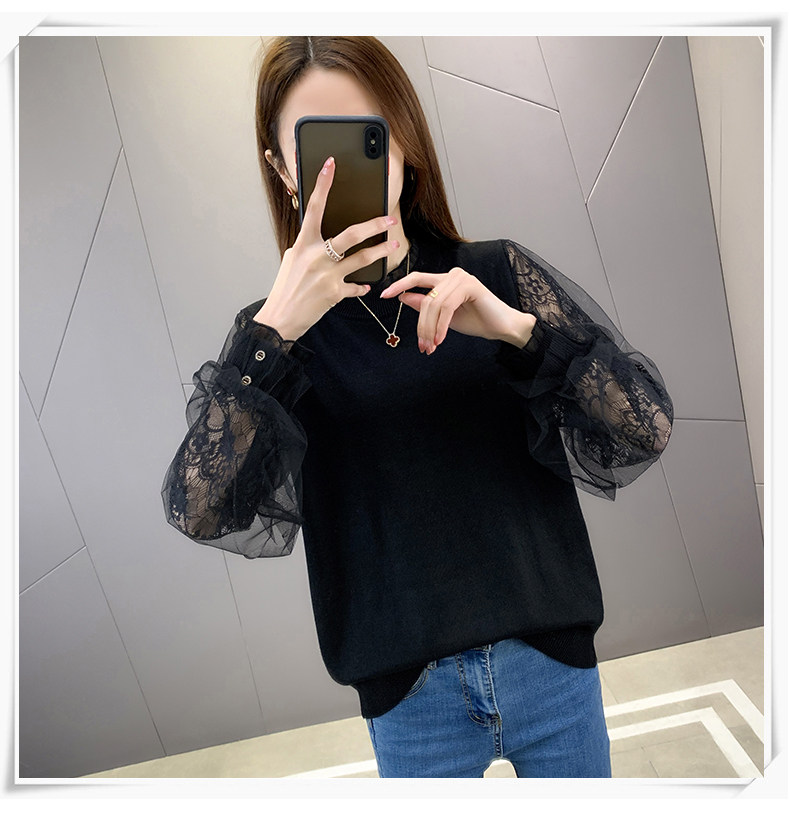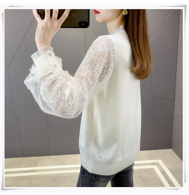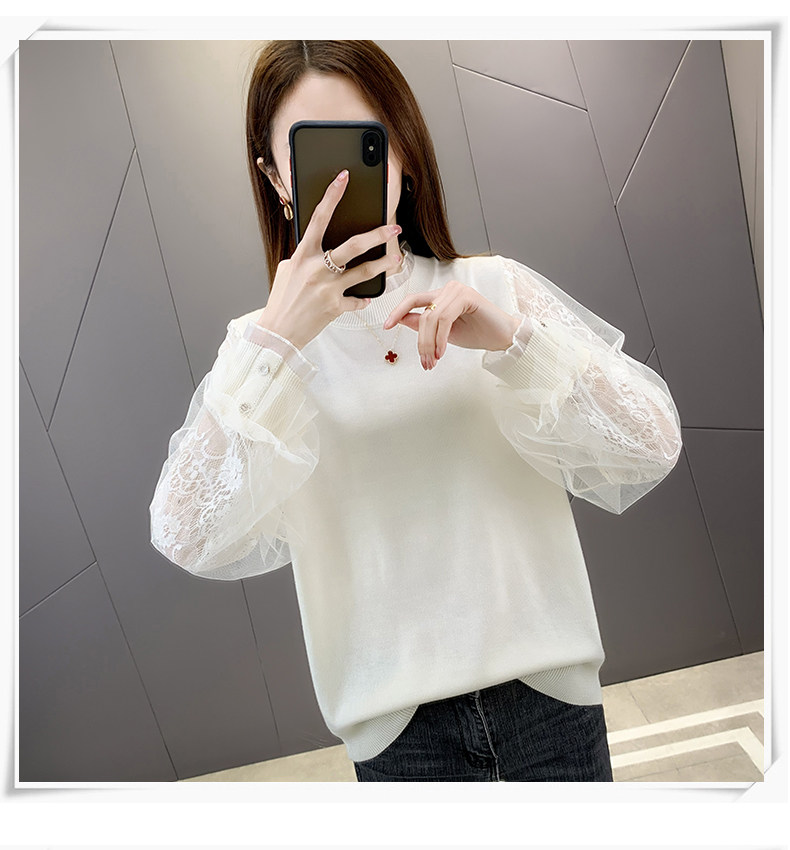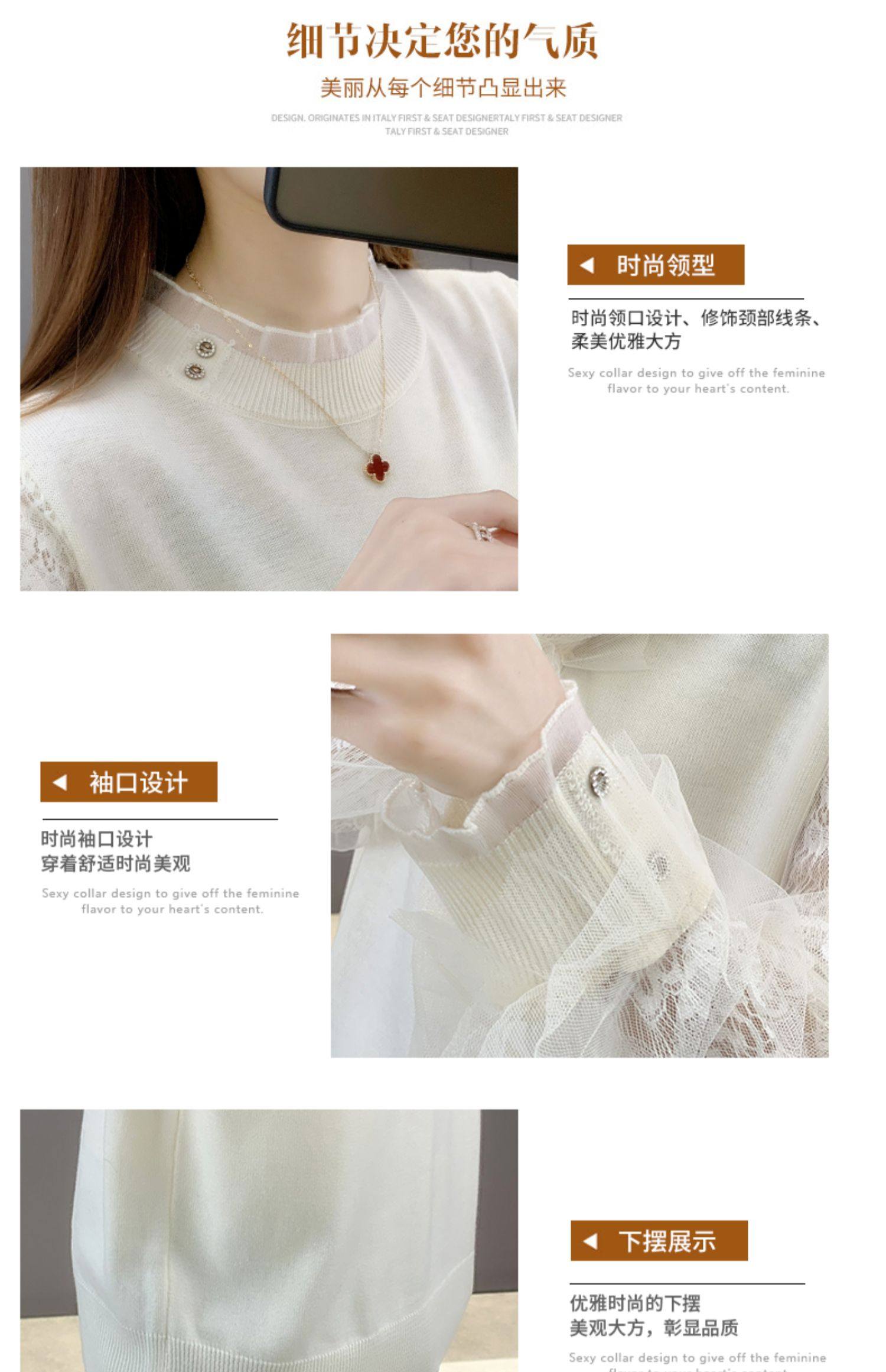 2025春季新款女士毛衣針織打底衫蕾絲袖薄款純色內搭上衣寬松洋氣