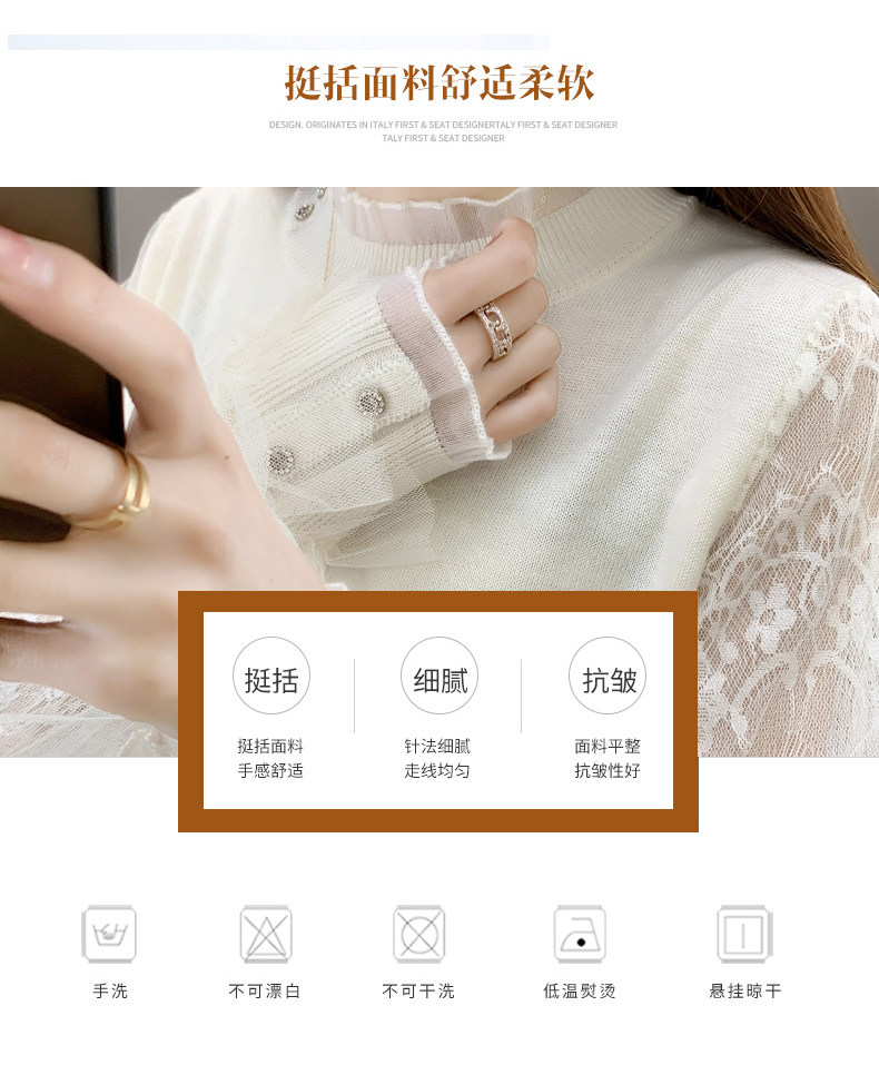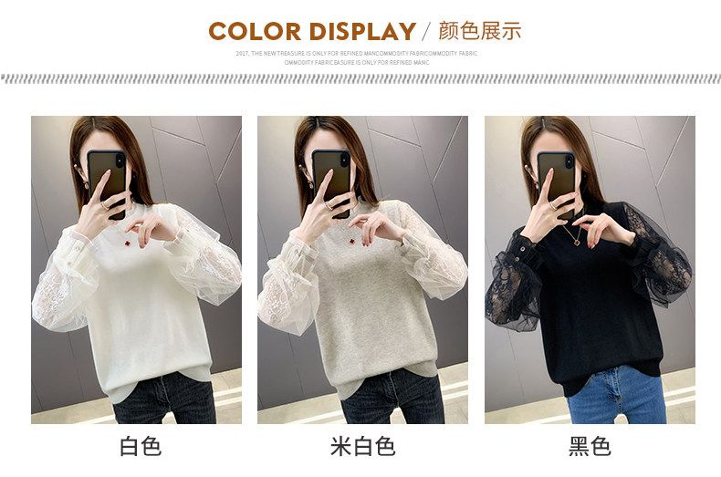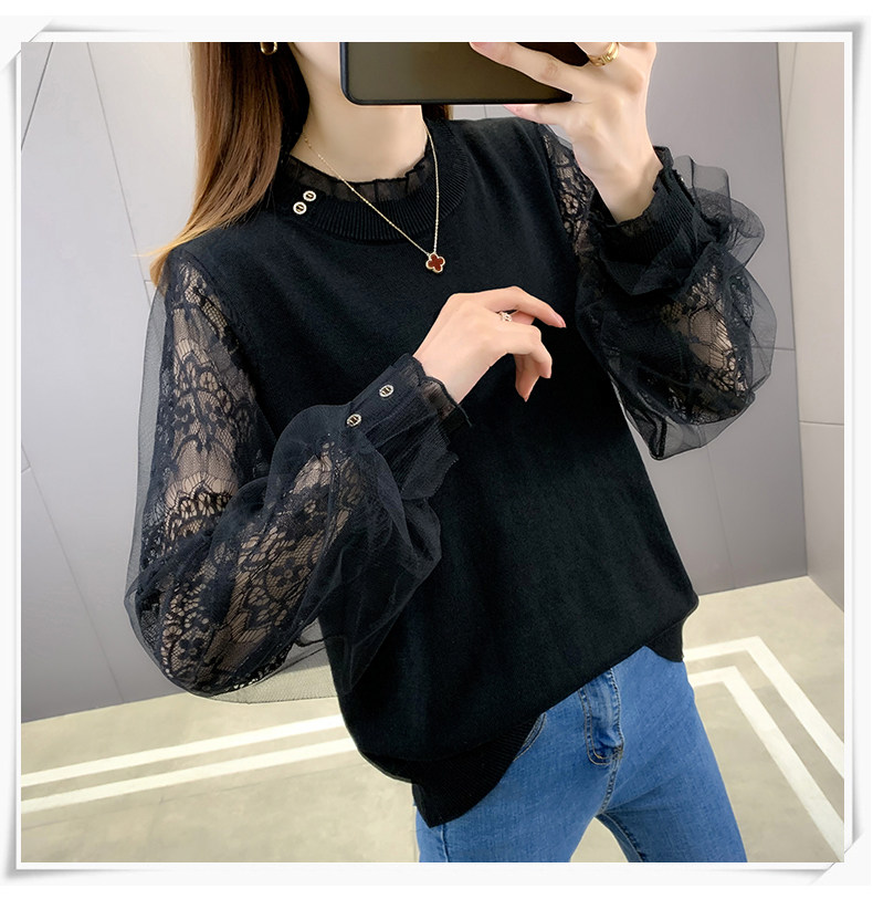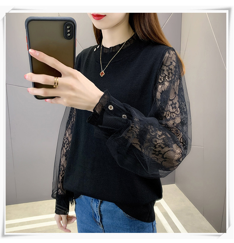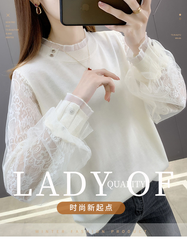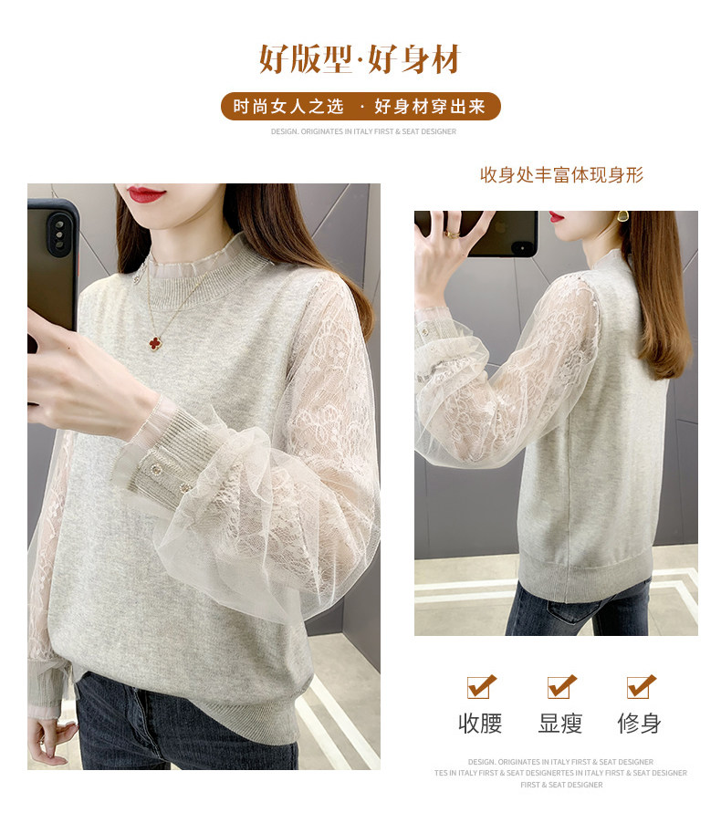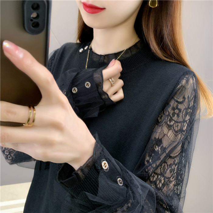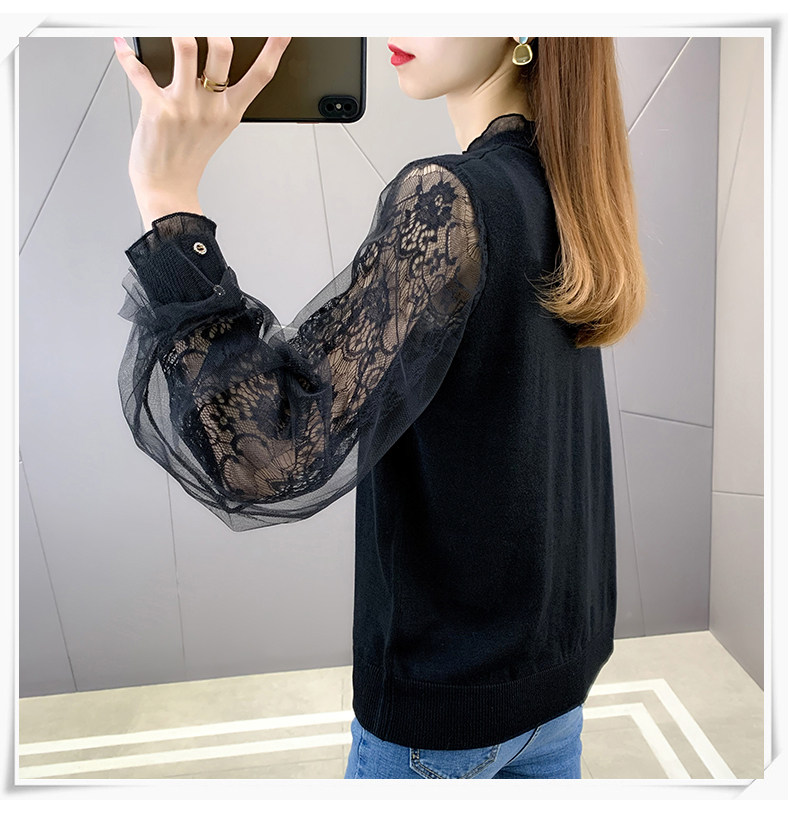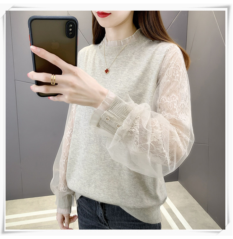 2025春季新款女士毛衣針織打底衫蕾絲袖薄款純色內搭上衣寬松洋氣