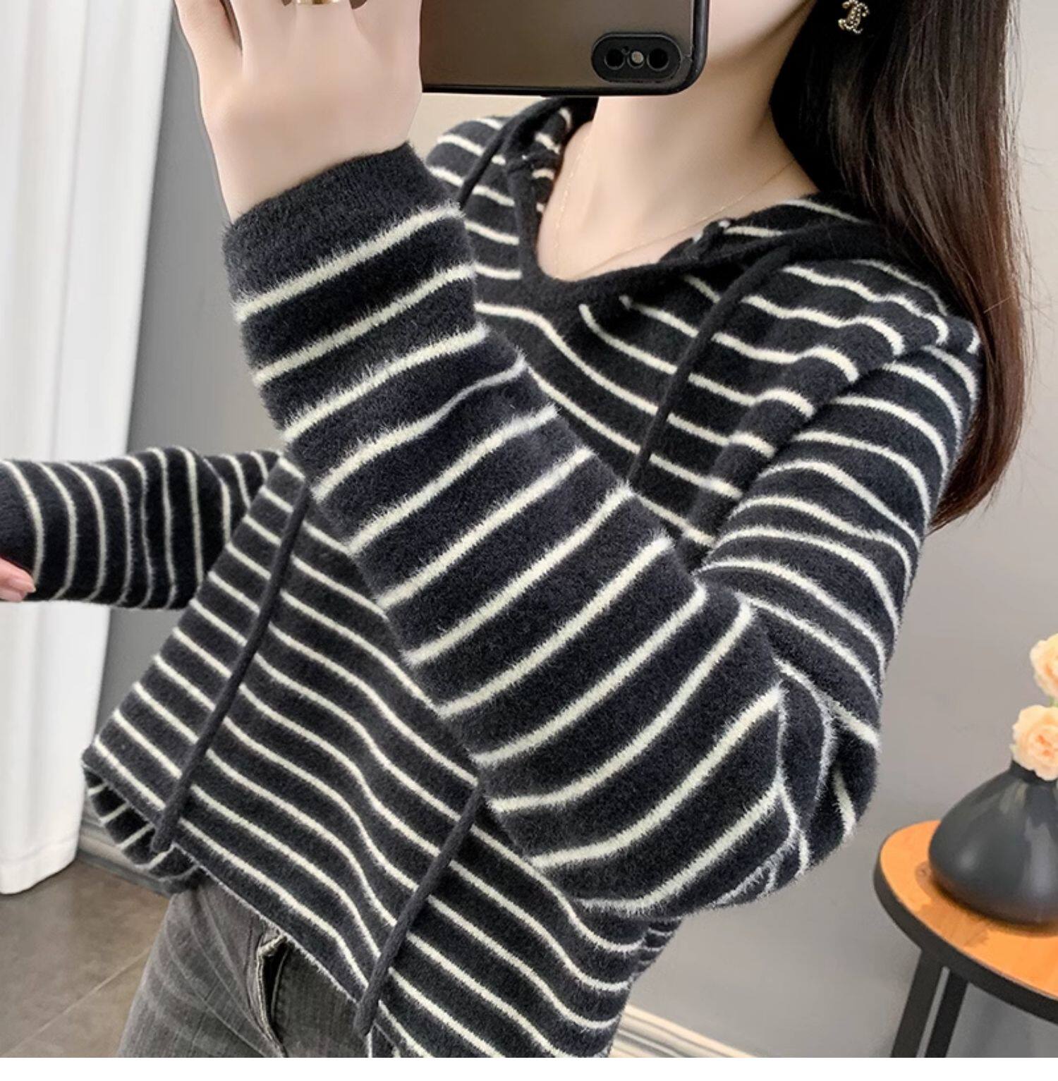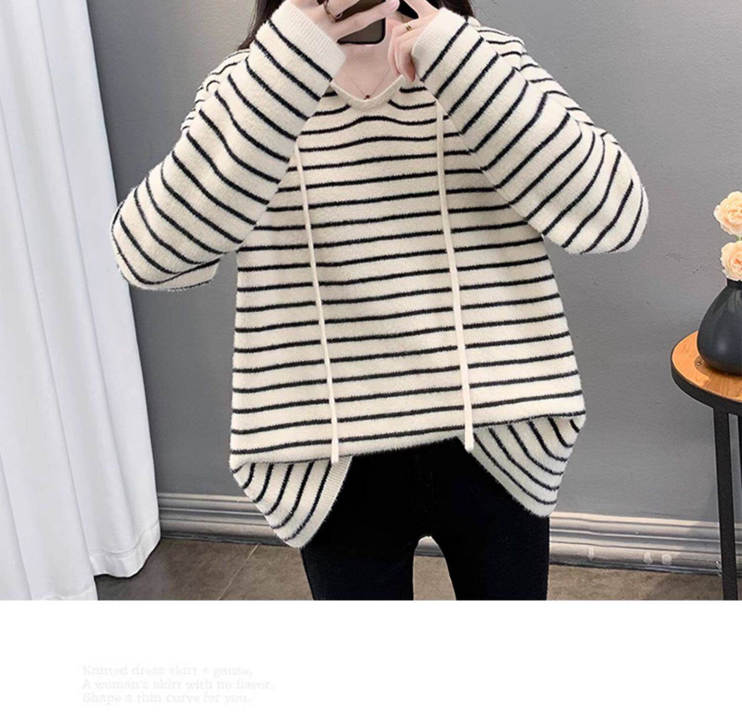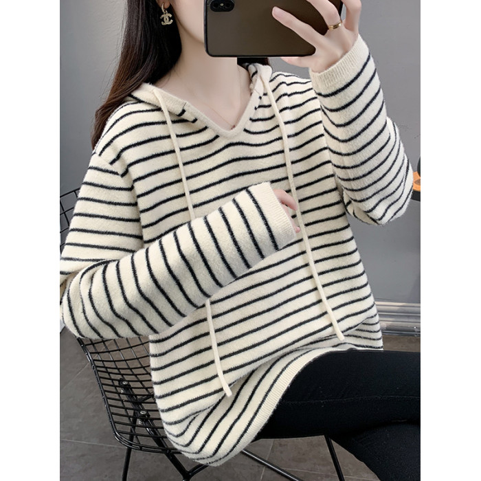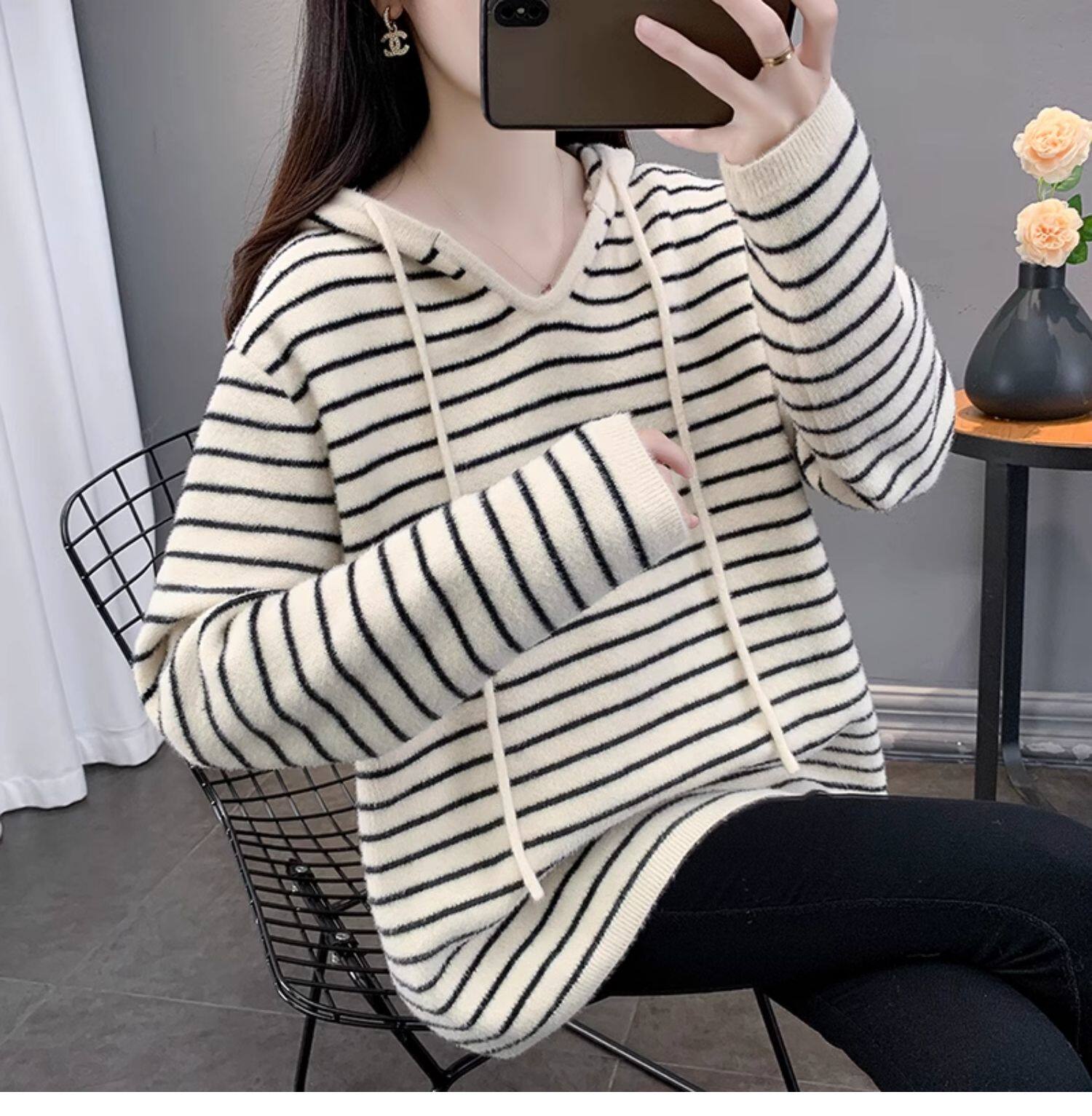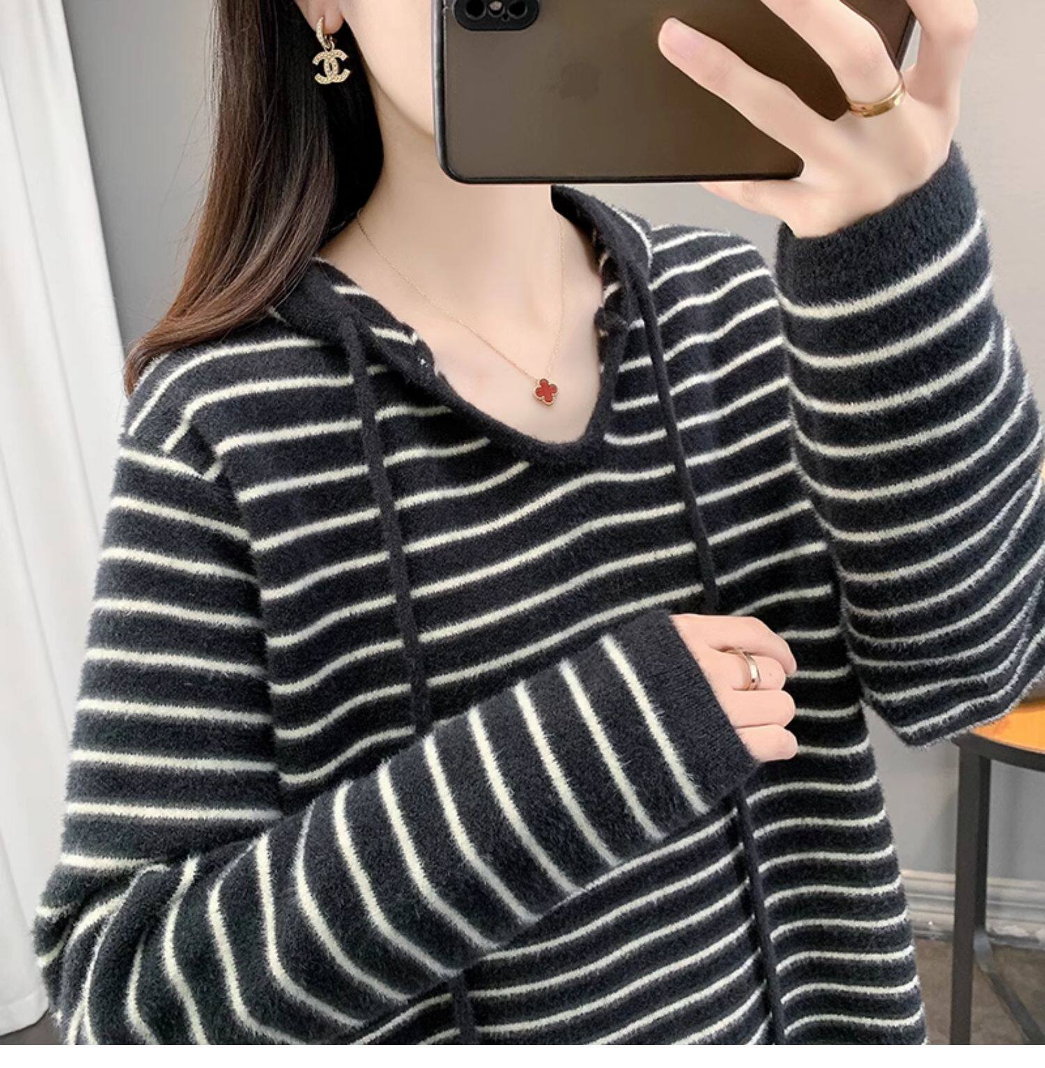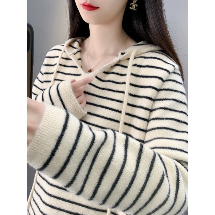 不起球軟糯毛衣外套女2025新款秋冬季條紋連帽針織衫寬松上衣加厚