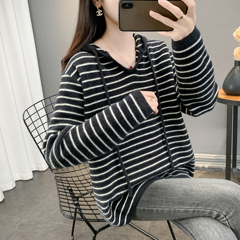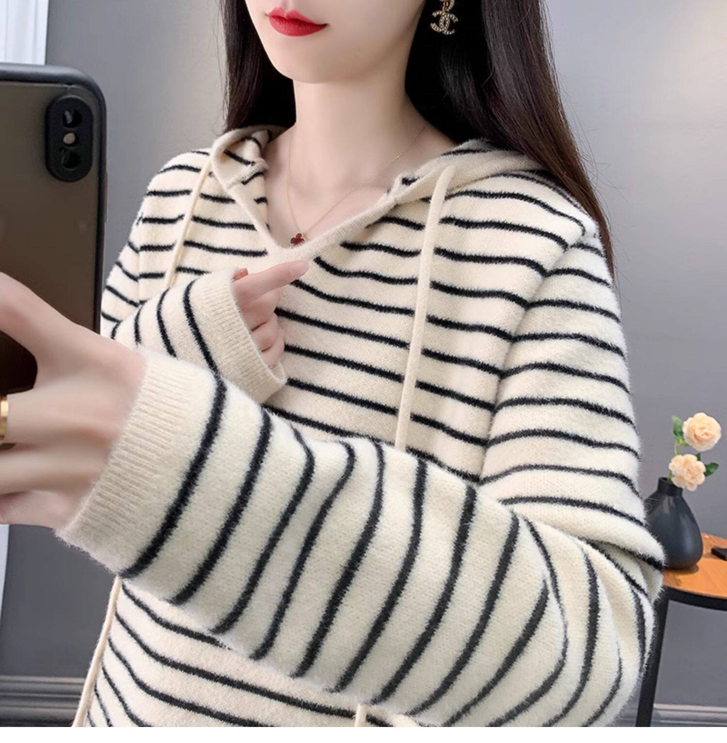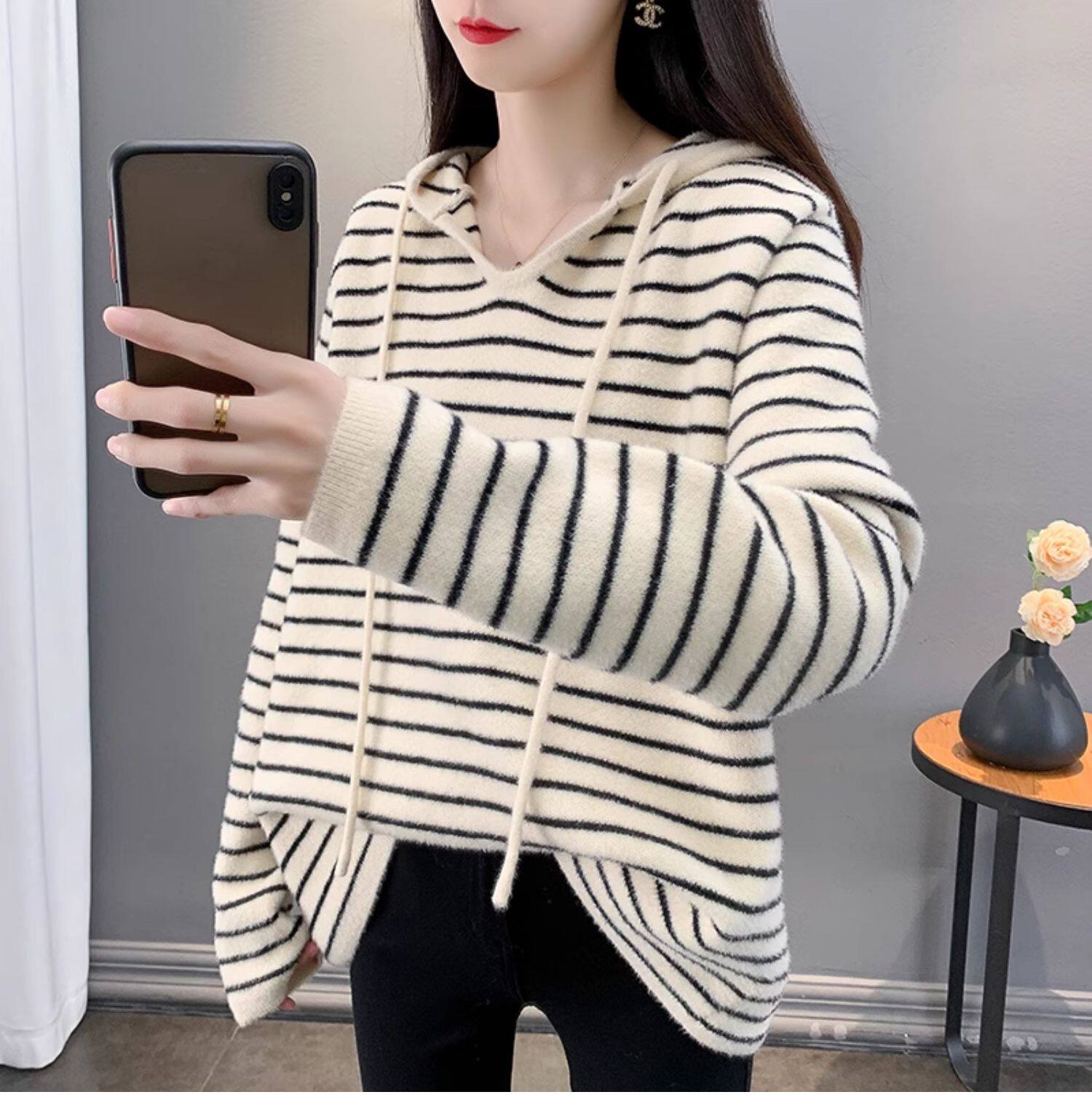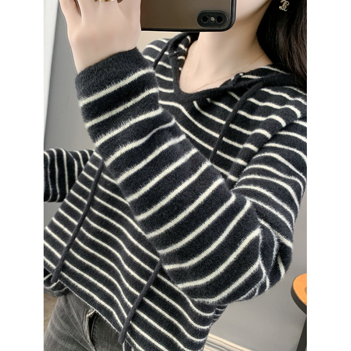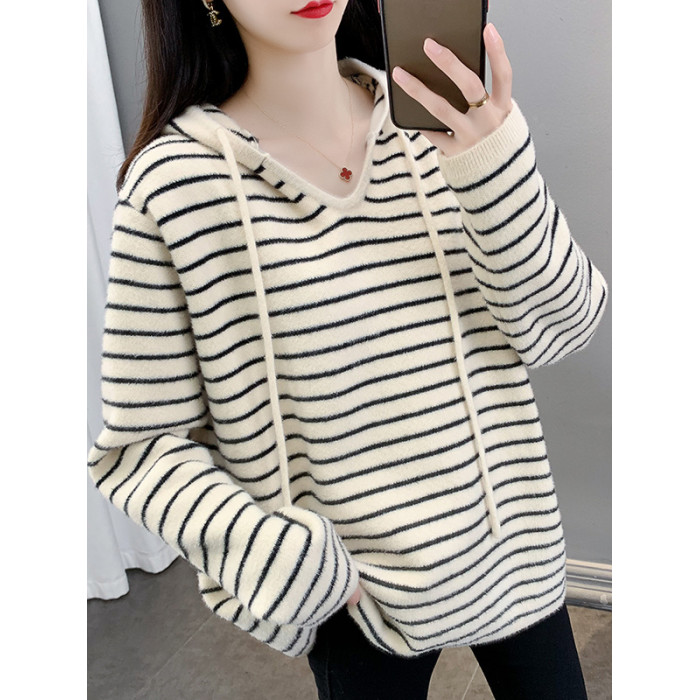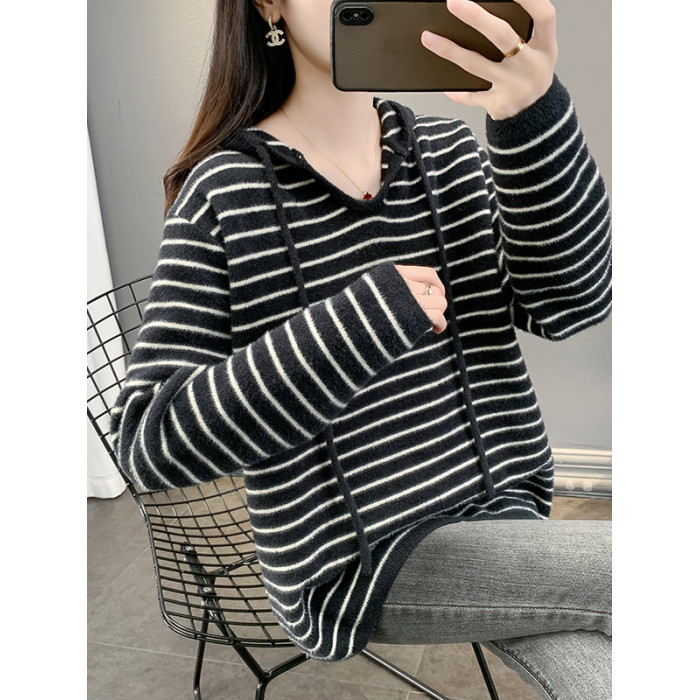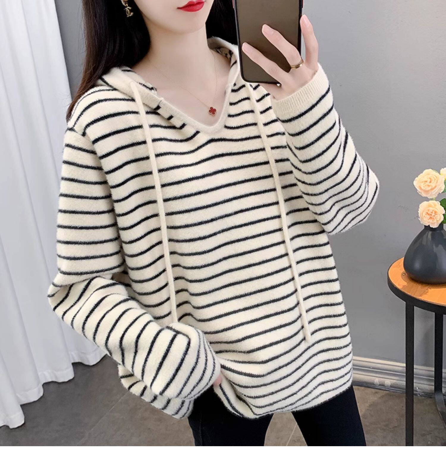 不起球軟糯毛衣外套女2025新款秋冬季條紋連帽針織衫寬松上衣加厚