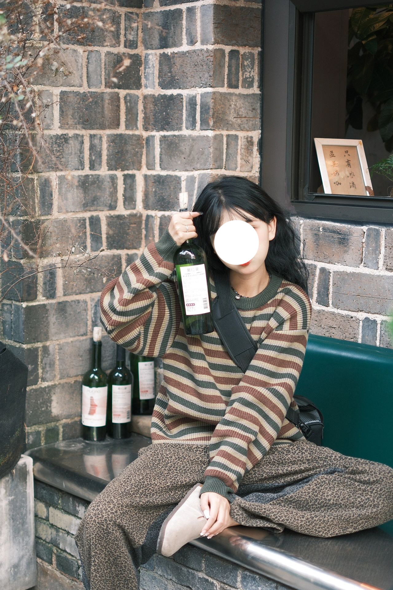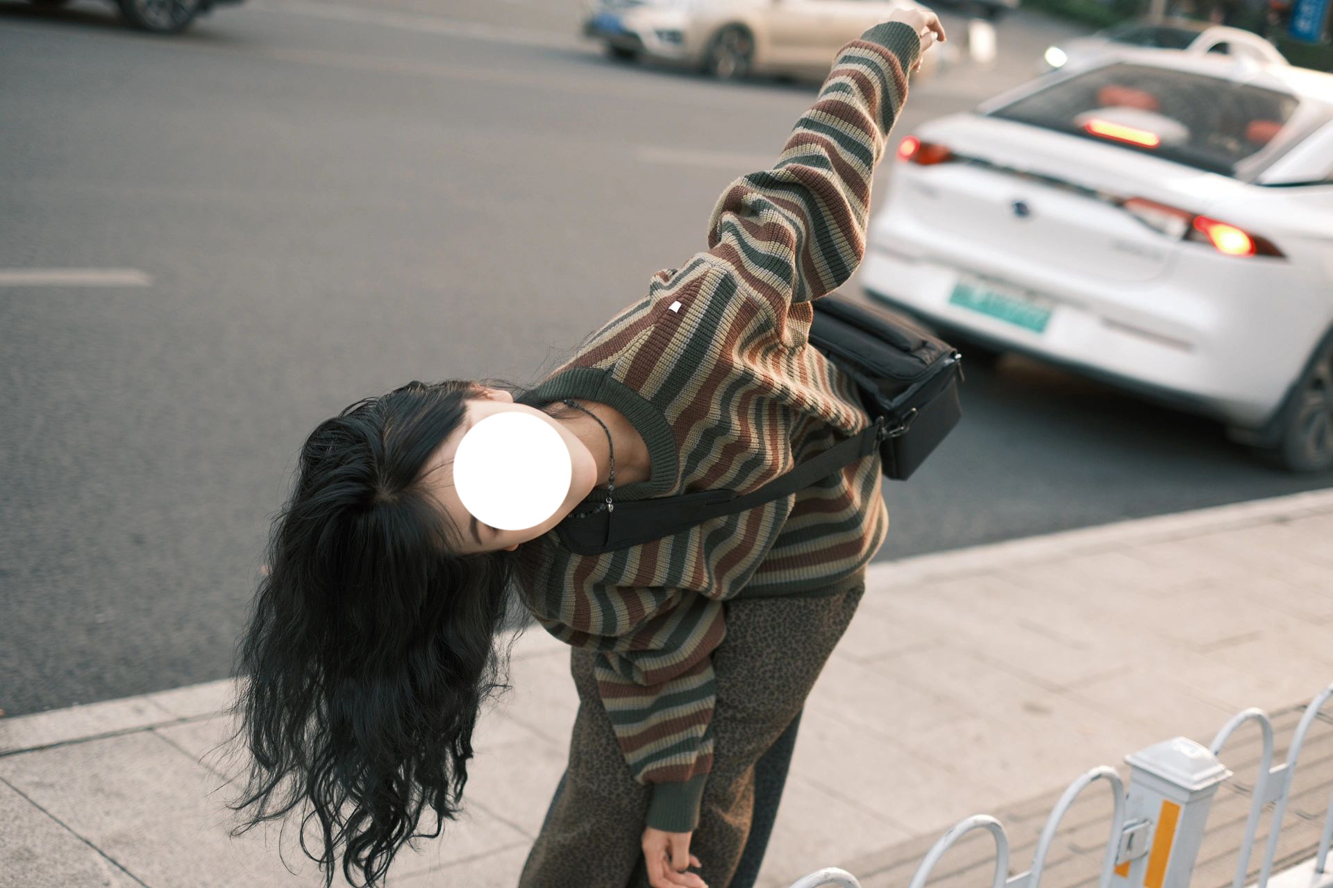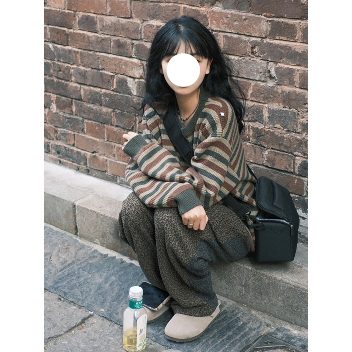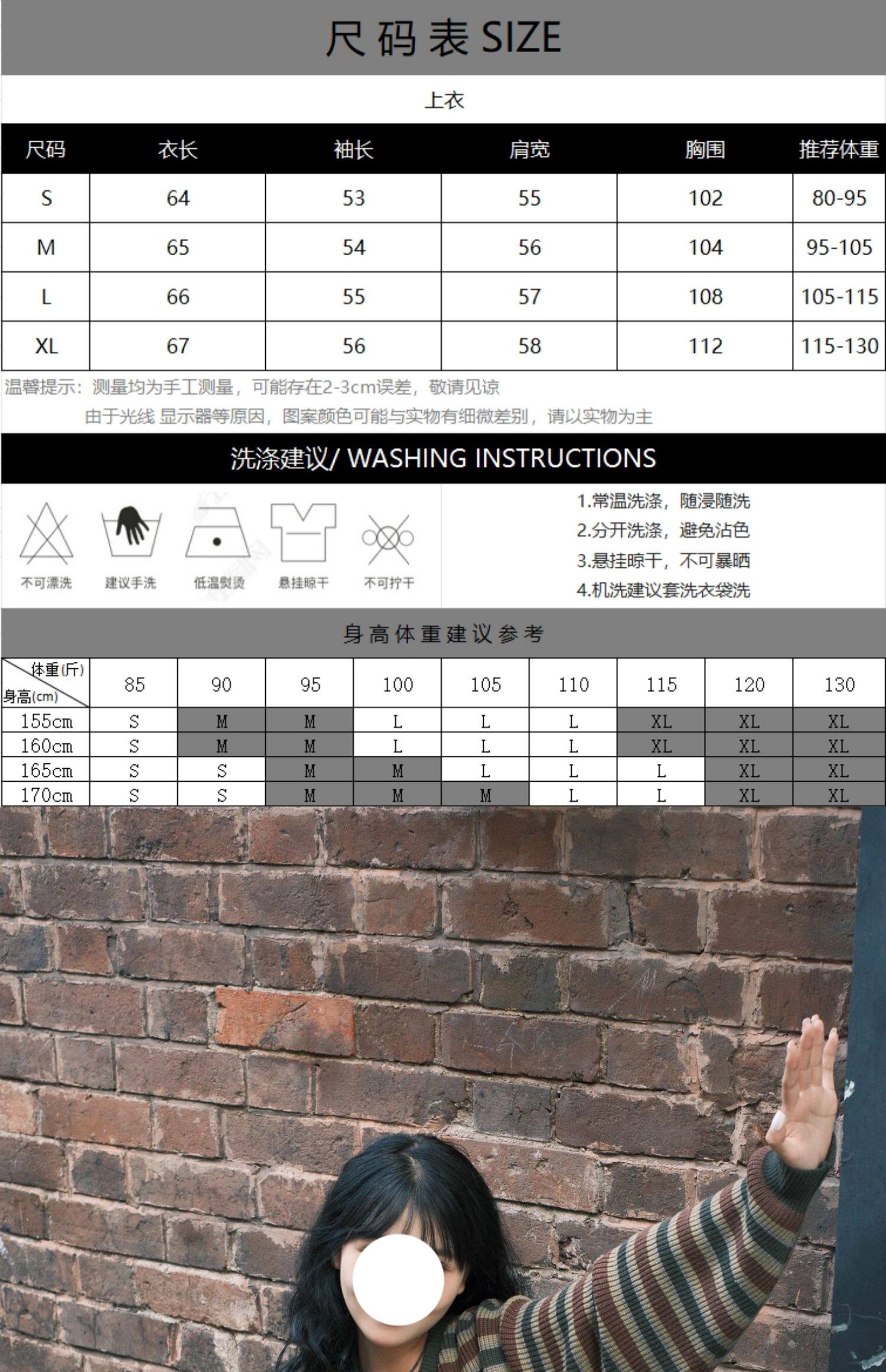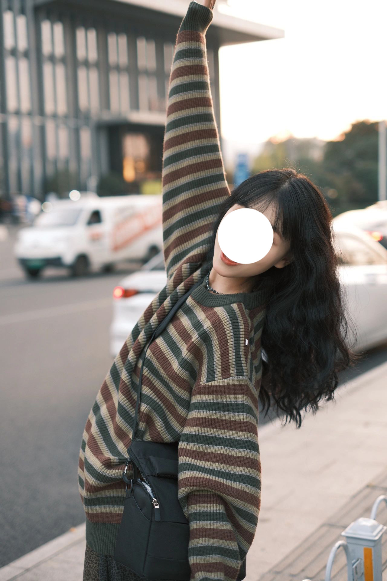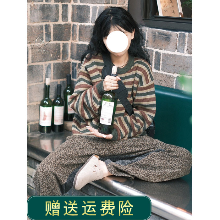 日系復古撞色條紋圓領套頭毛衣女秋冬慵懶風寬松中長款羊毛針織衫
