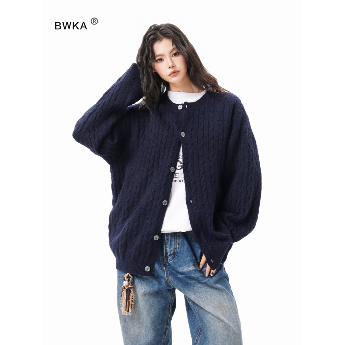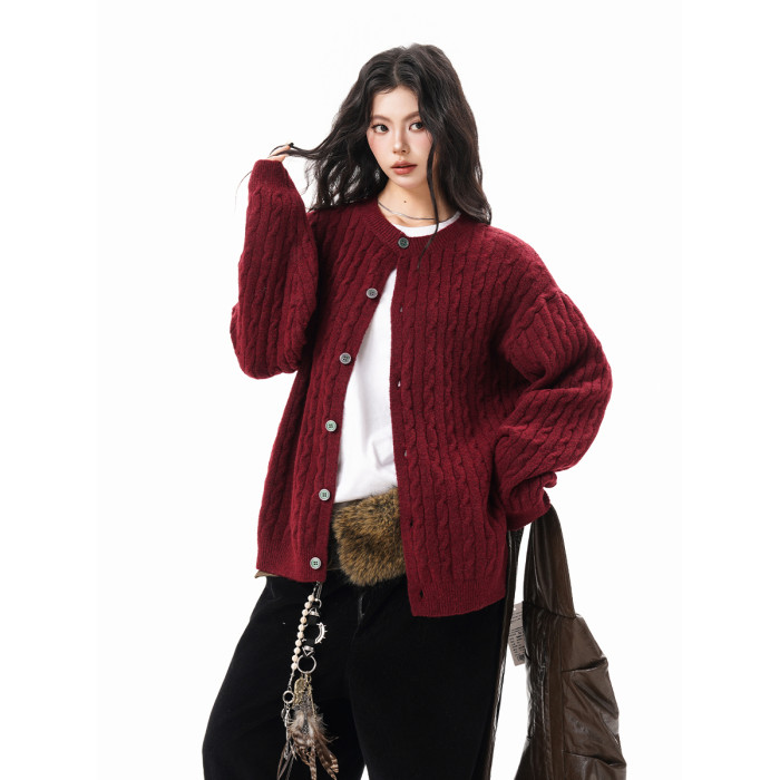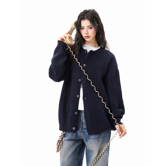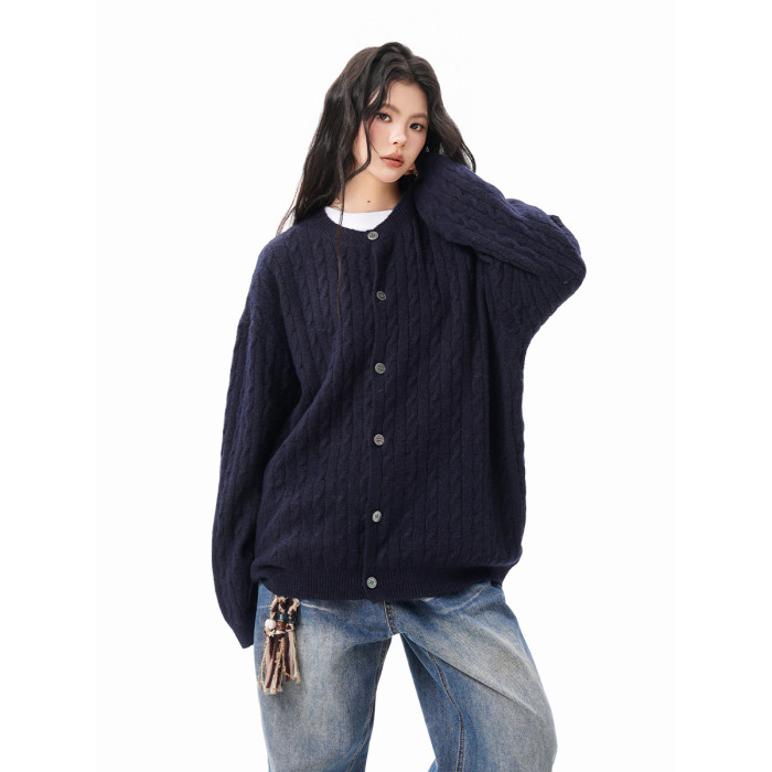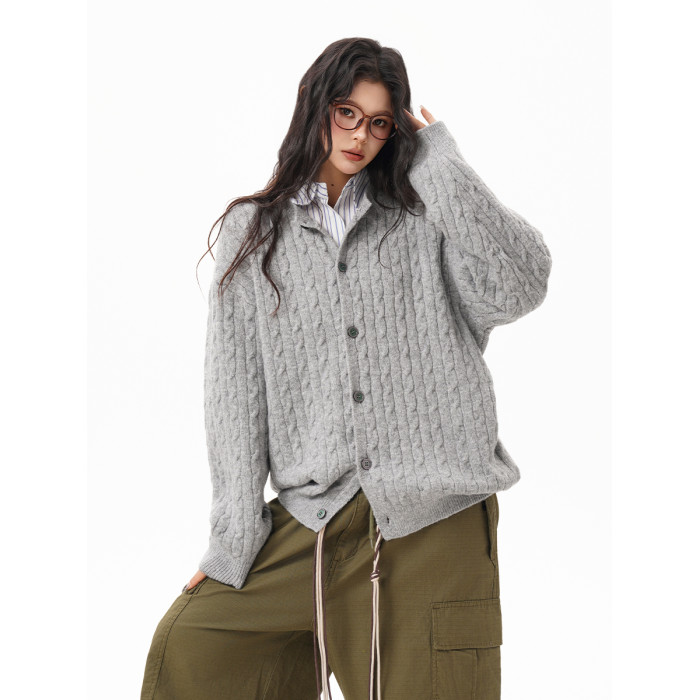 美式復古麻花紐釦毛衣開衫女男秋冬季純色肌理感慵懶針織外套情侶