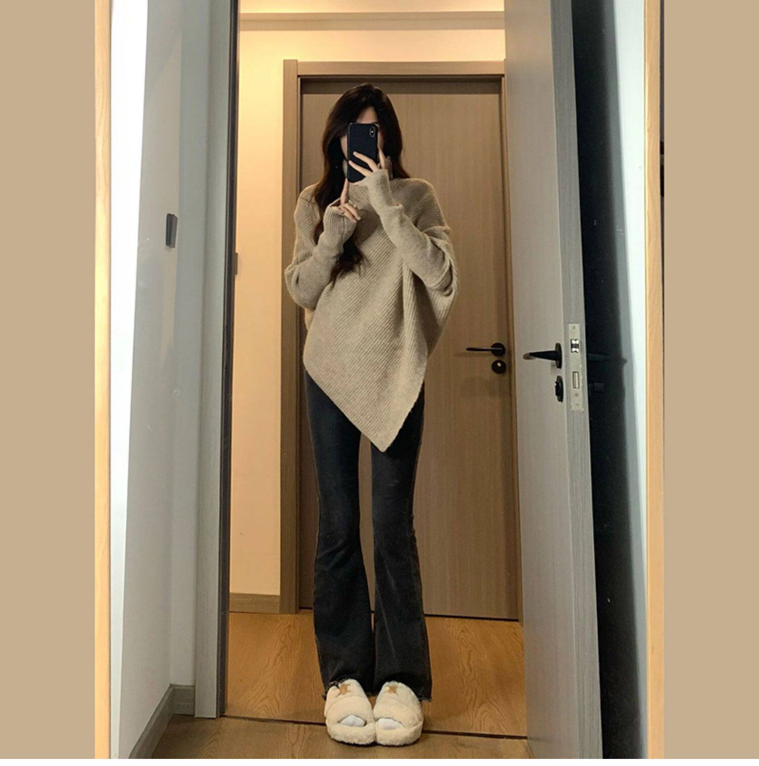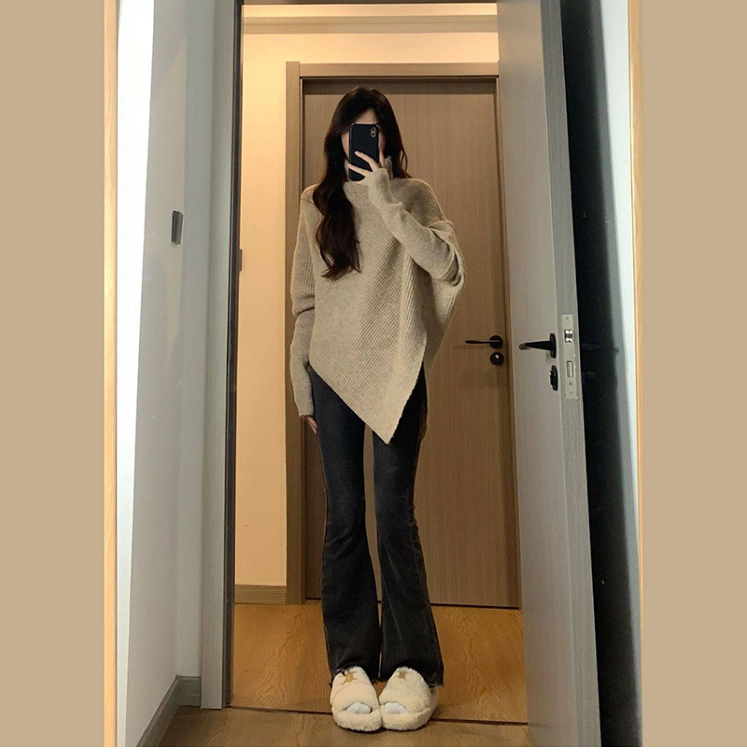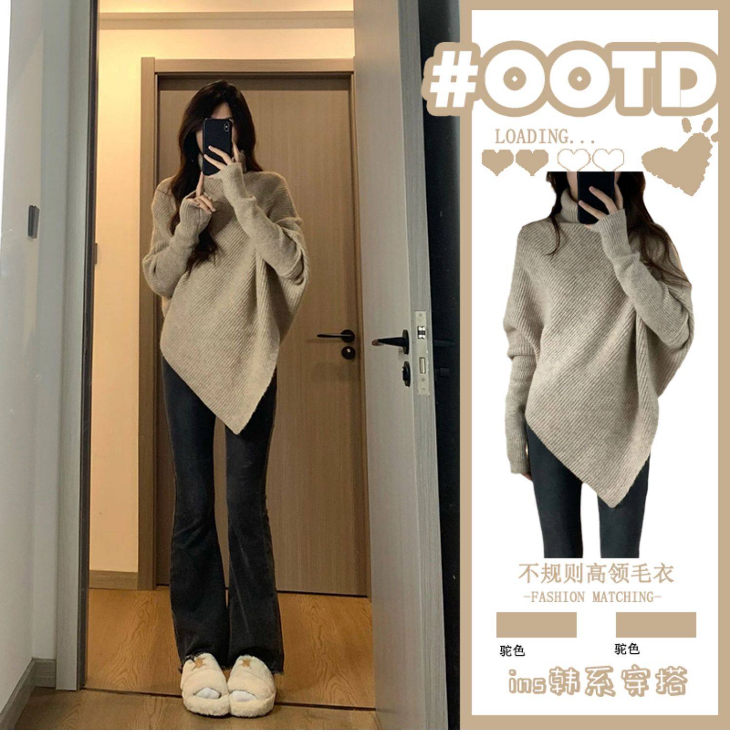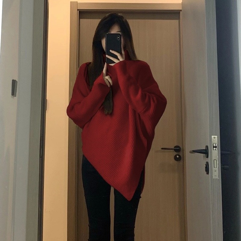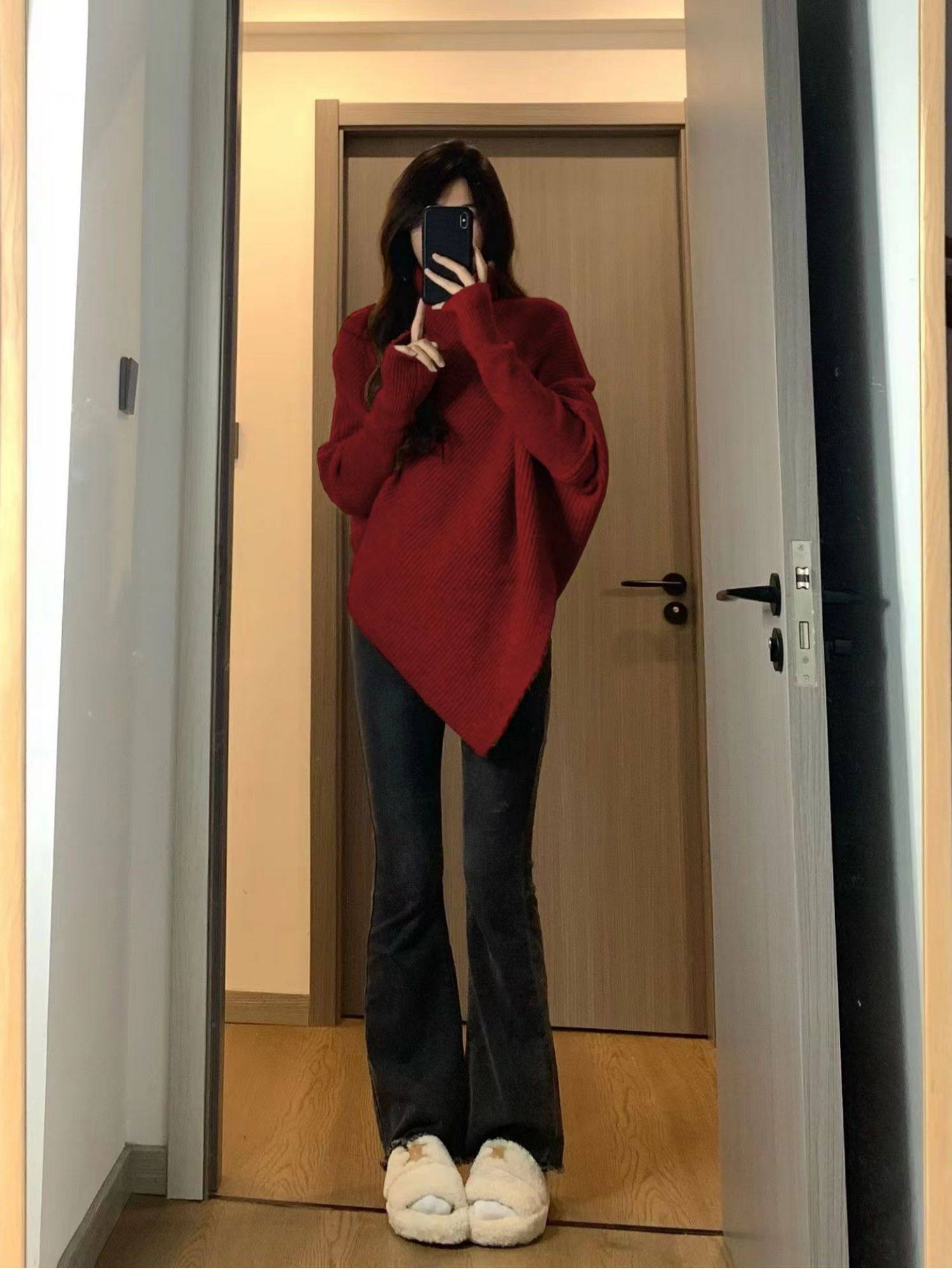 不規則高領毛衣女2025秋冬季韓系過年紅色高級感慵懶加厚針織上衣