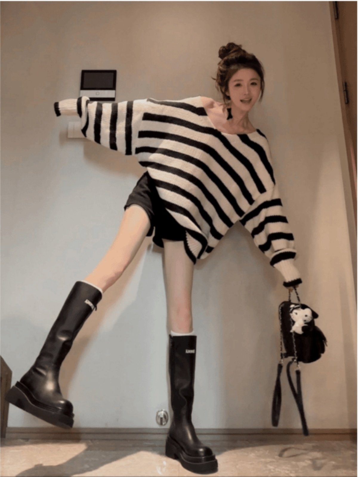 設計感小衆v領針織毛衣女款秋季新款寬松顯瘦慵懶風休閒條紋上衣