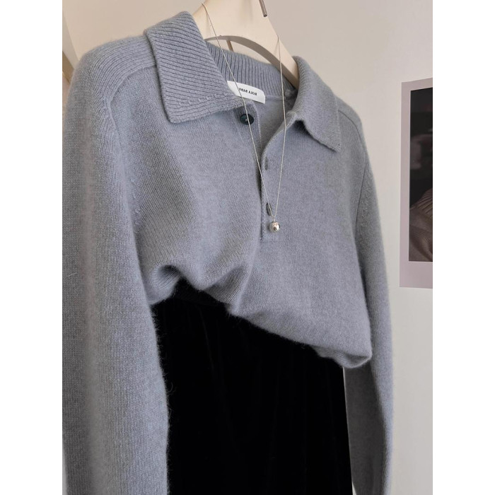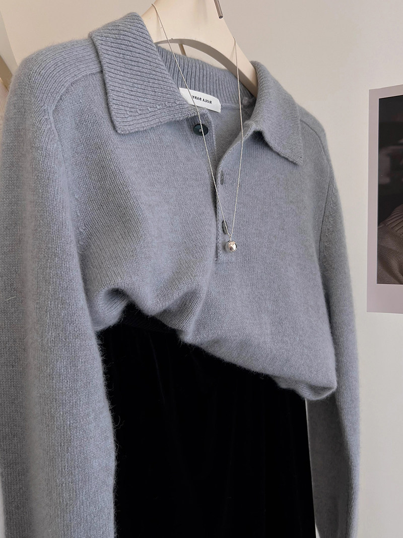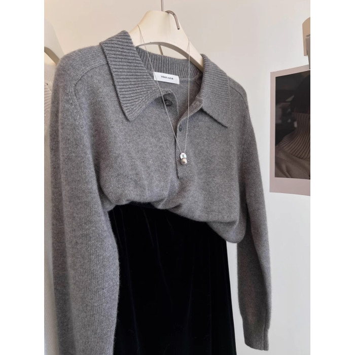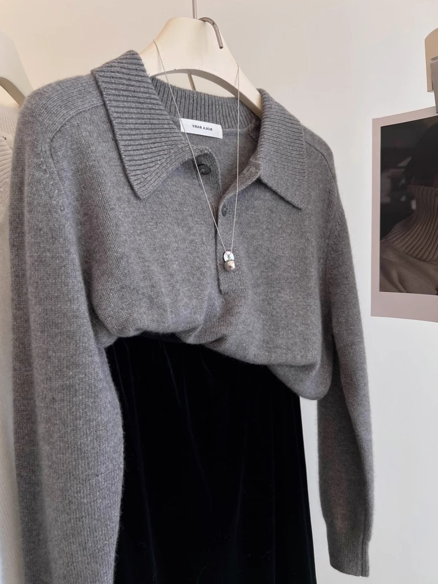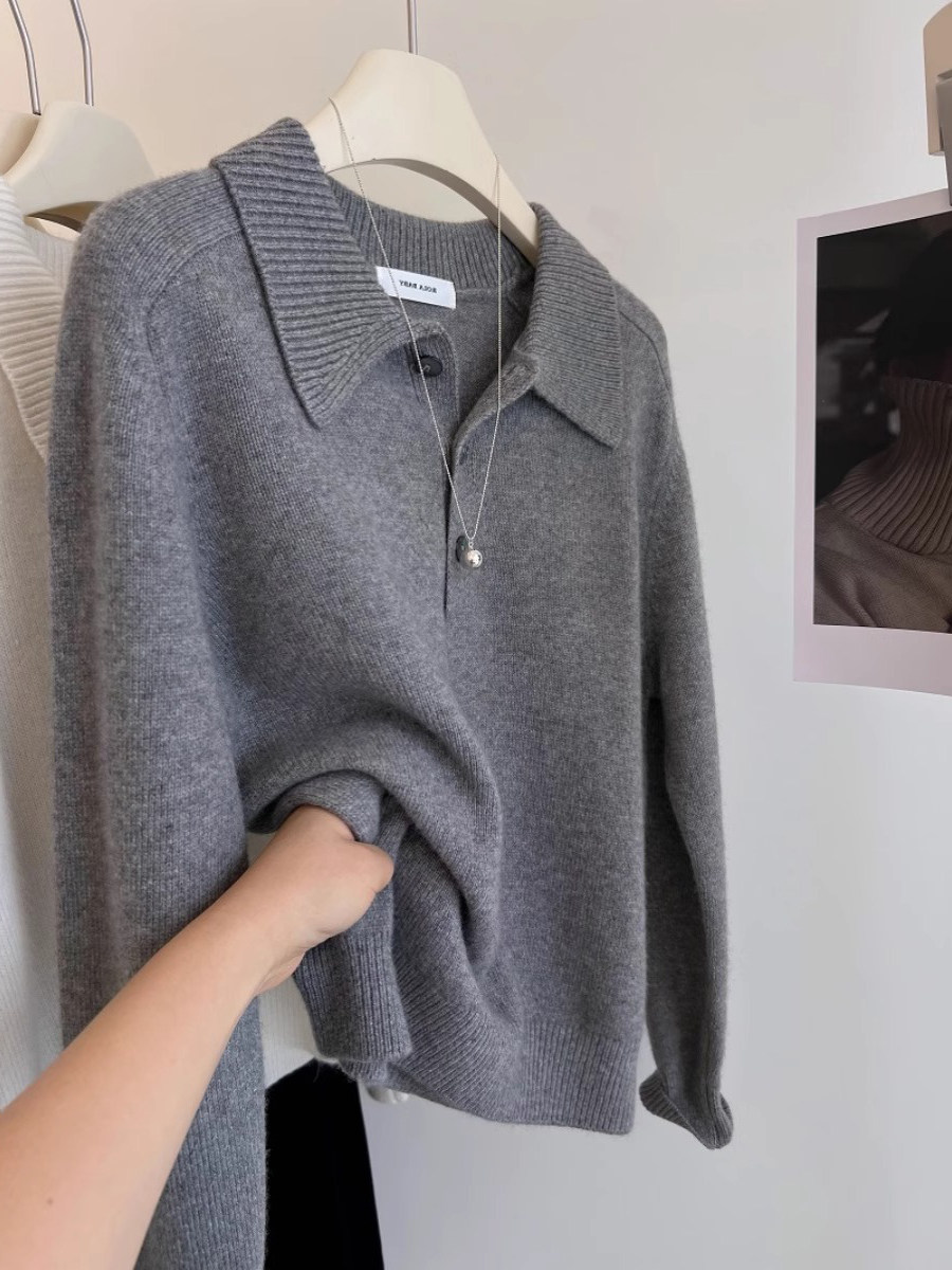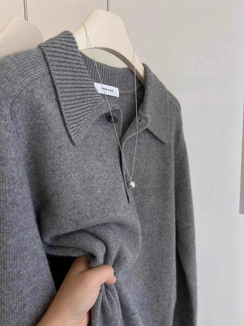 秋冬polo翻領三粒釦毛衣針織打底衫女內搭復古灰色山羊絨上衣厚