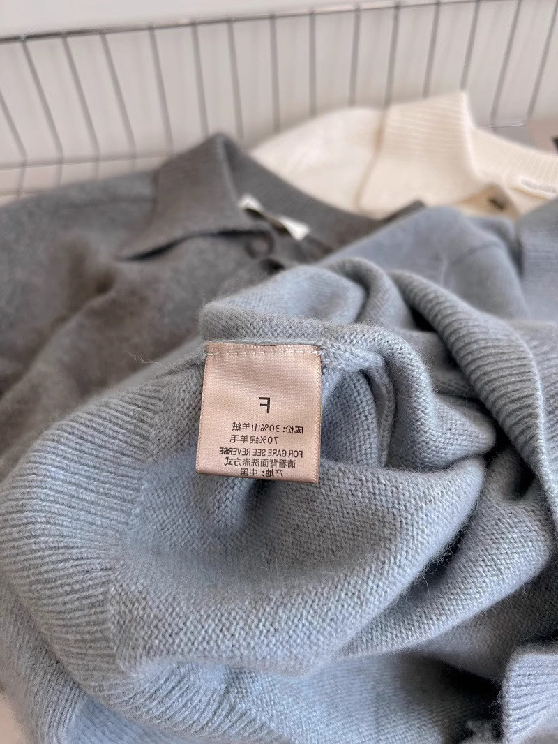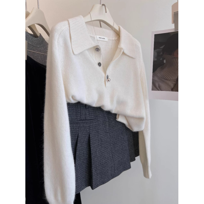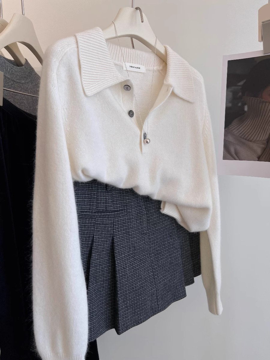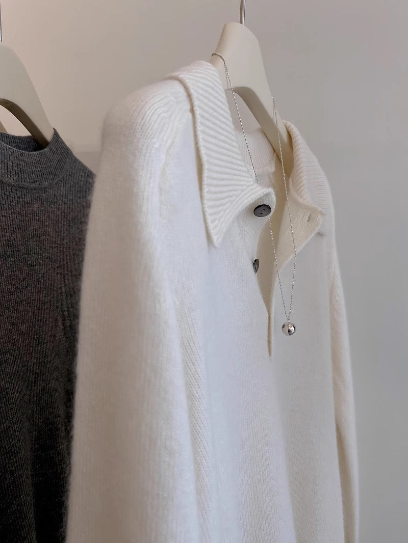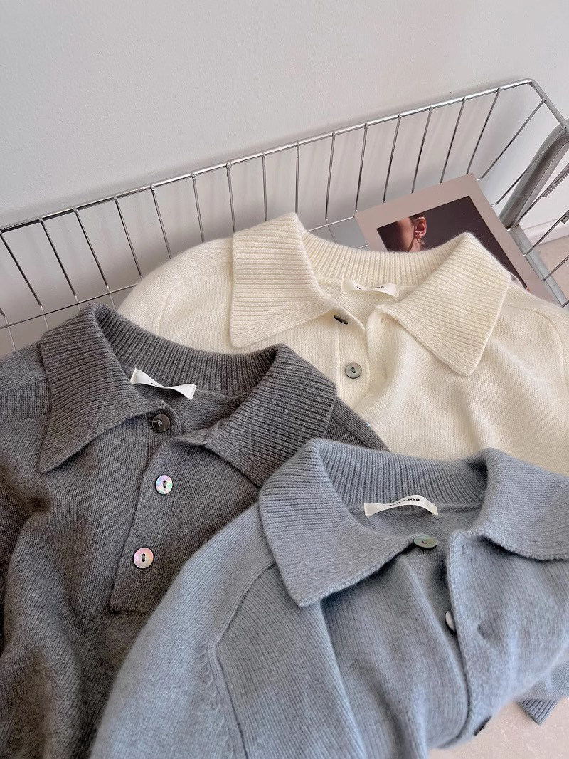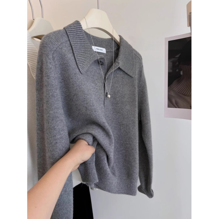 秋冬polo翻領三粒釦毛衣針織打底衫女內搭復古灰色山羊絨上衣厚