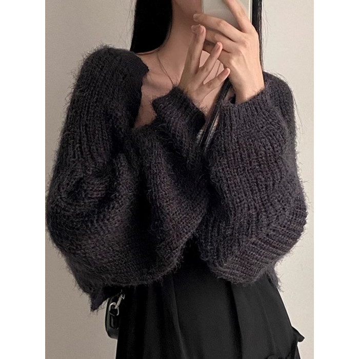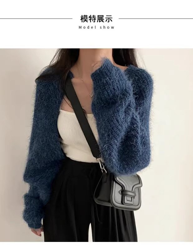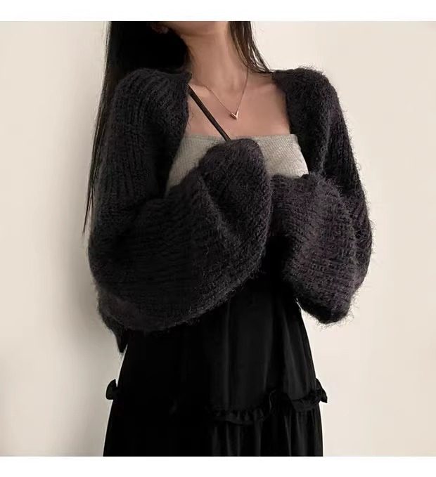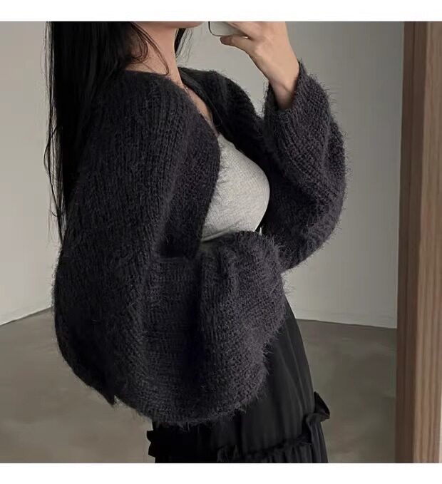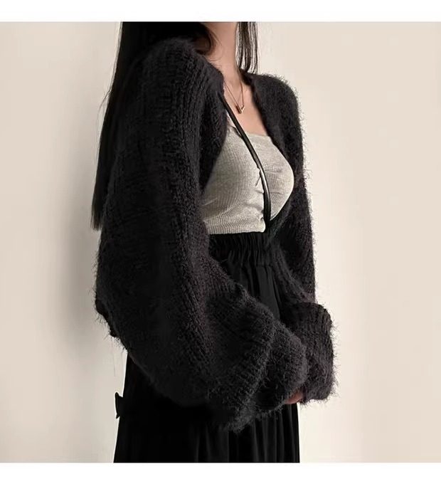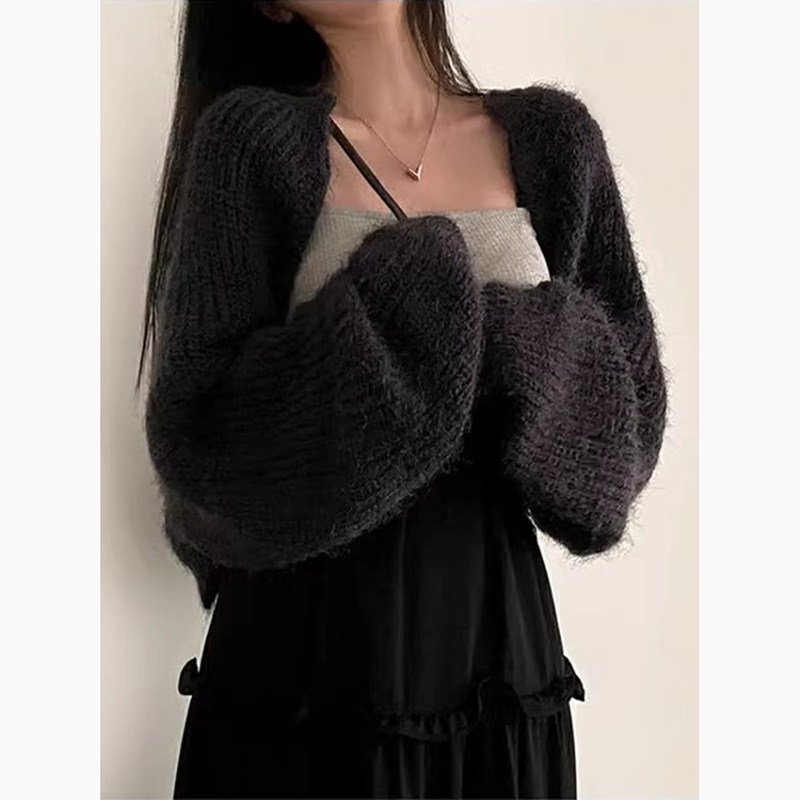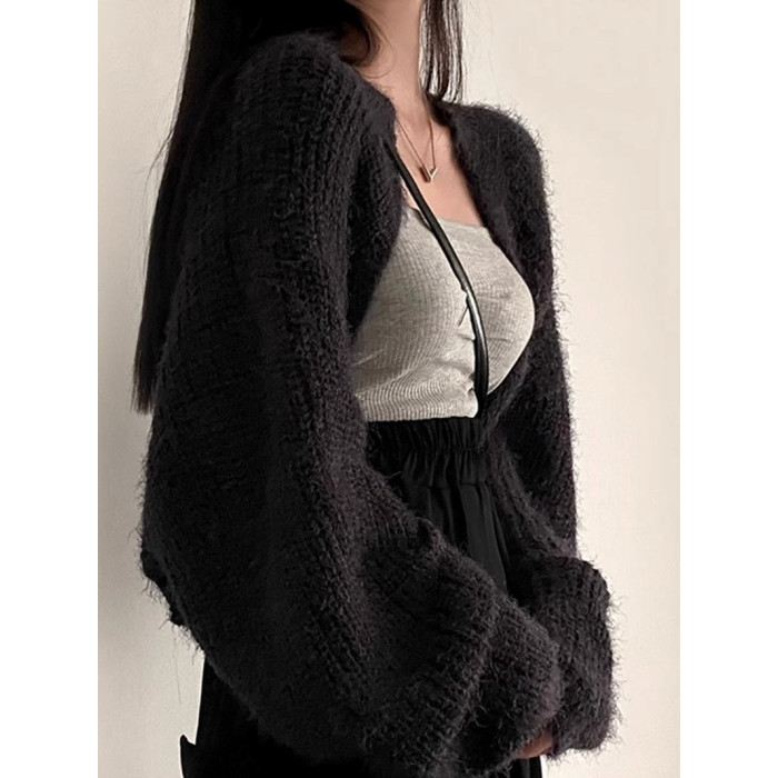 法式小香風黑色水貂絨毛衣披肩外套女春秋寬松針織開衫外搭小坎肩