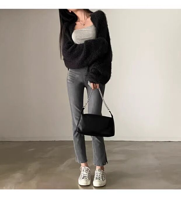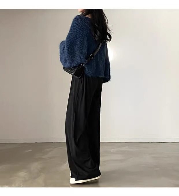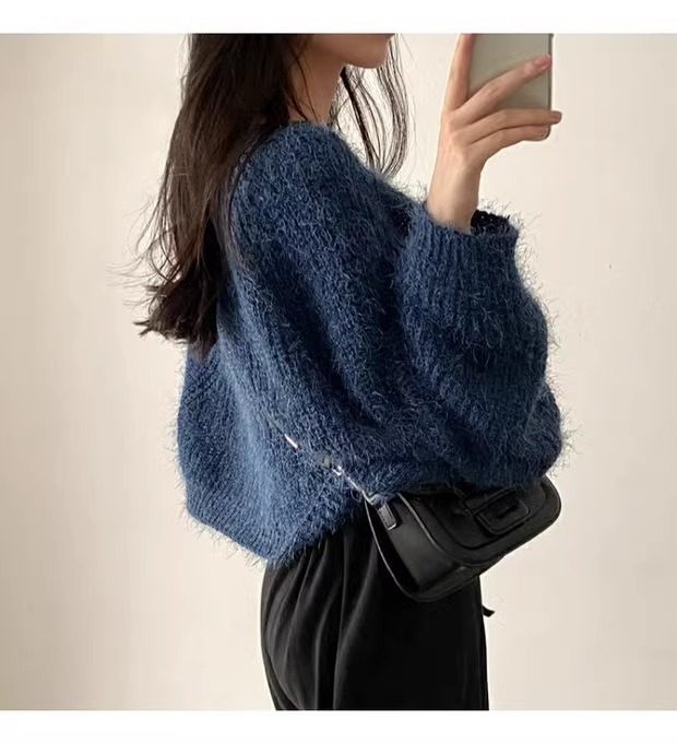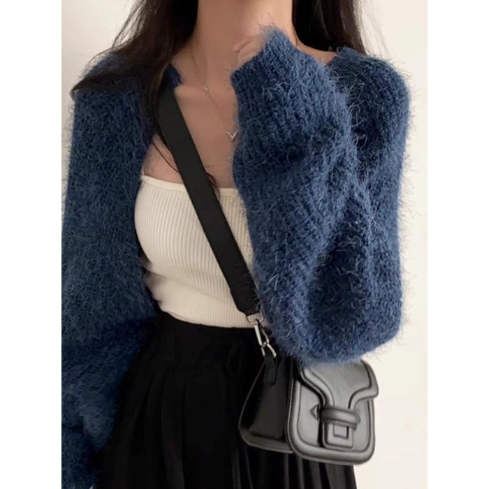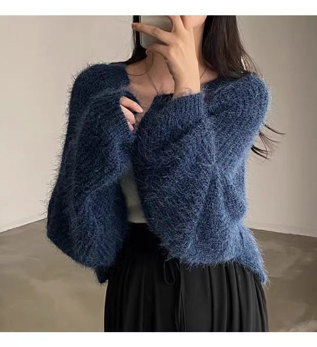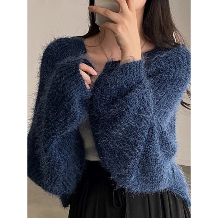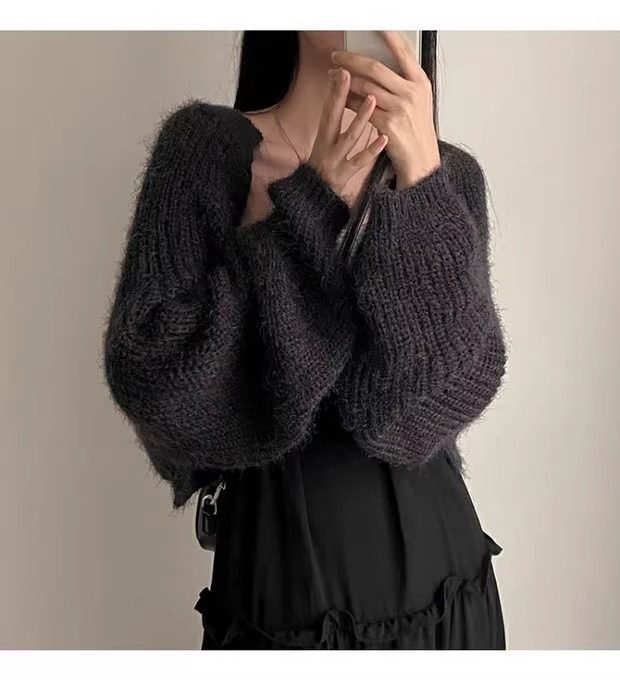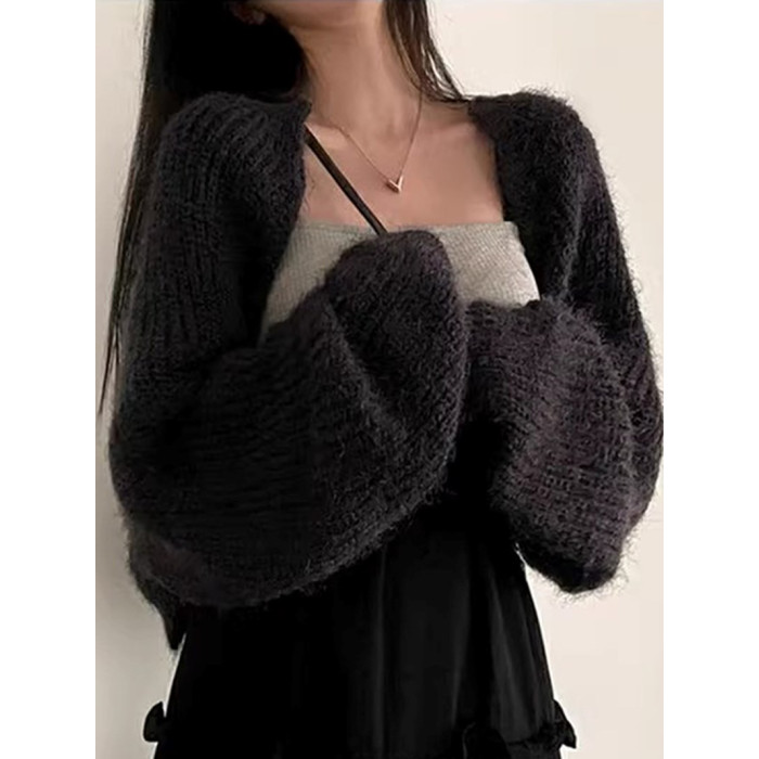 法式小香風黑色水貂絨毛衣披肩外套女春秋寬松針織開衫外搭小坎肩