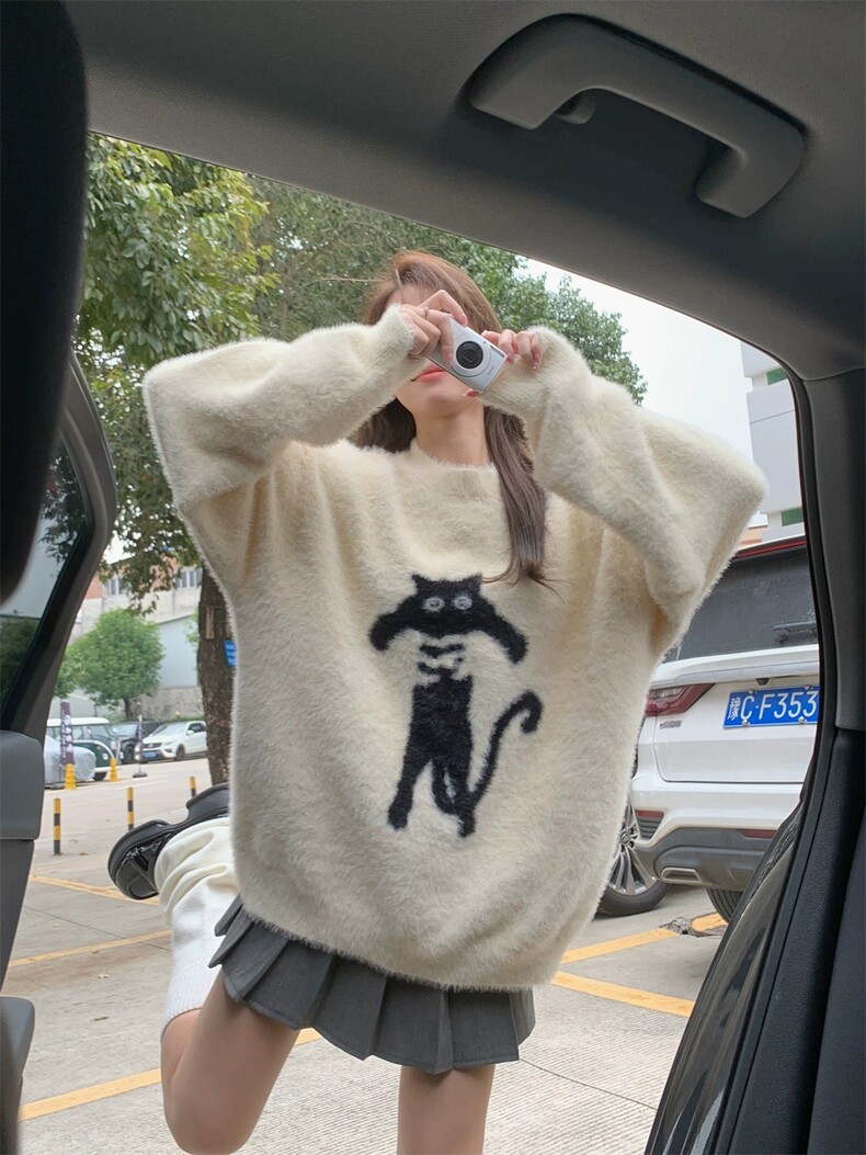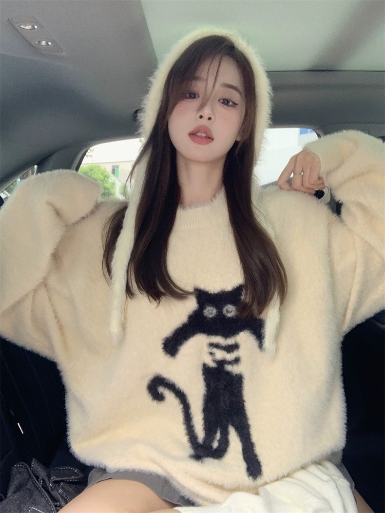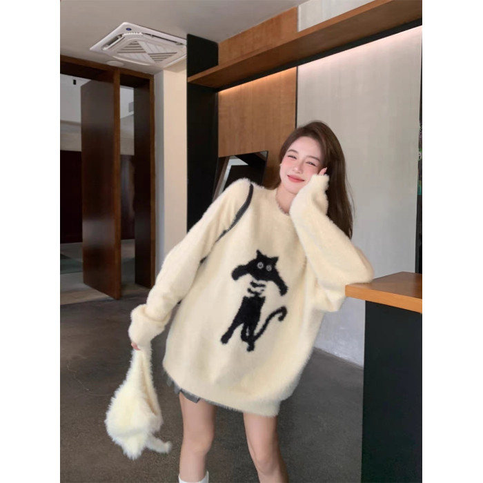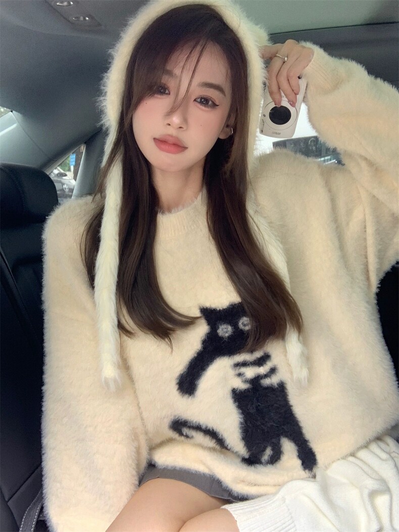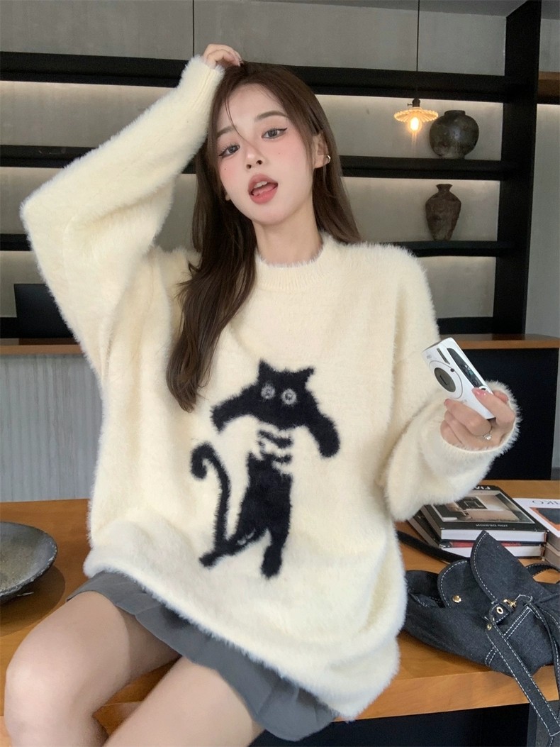 可愛貓咪提花毛絨長袖毛衣女秋冬季軟糯寬鬆水貂絨學生上衣慵嬾風