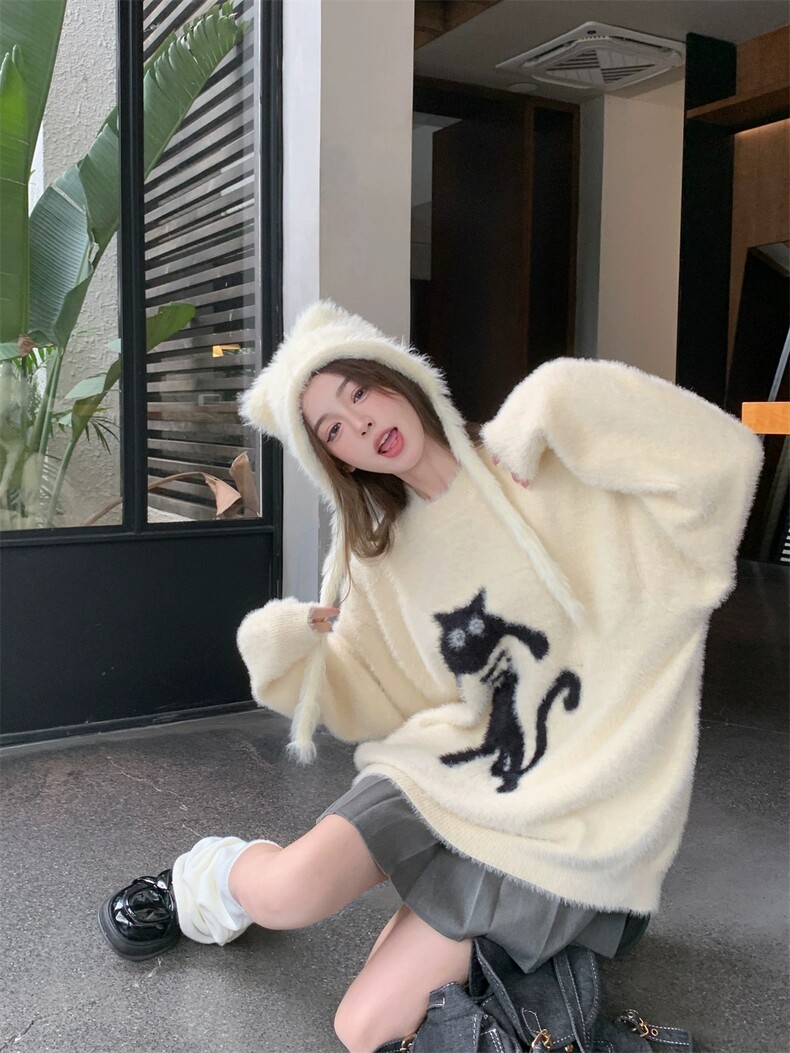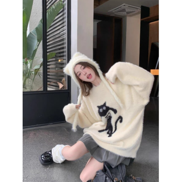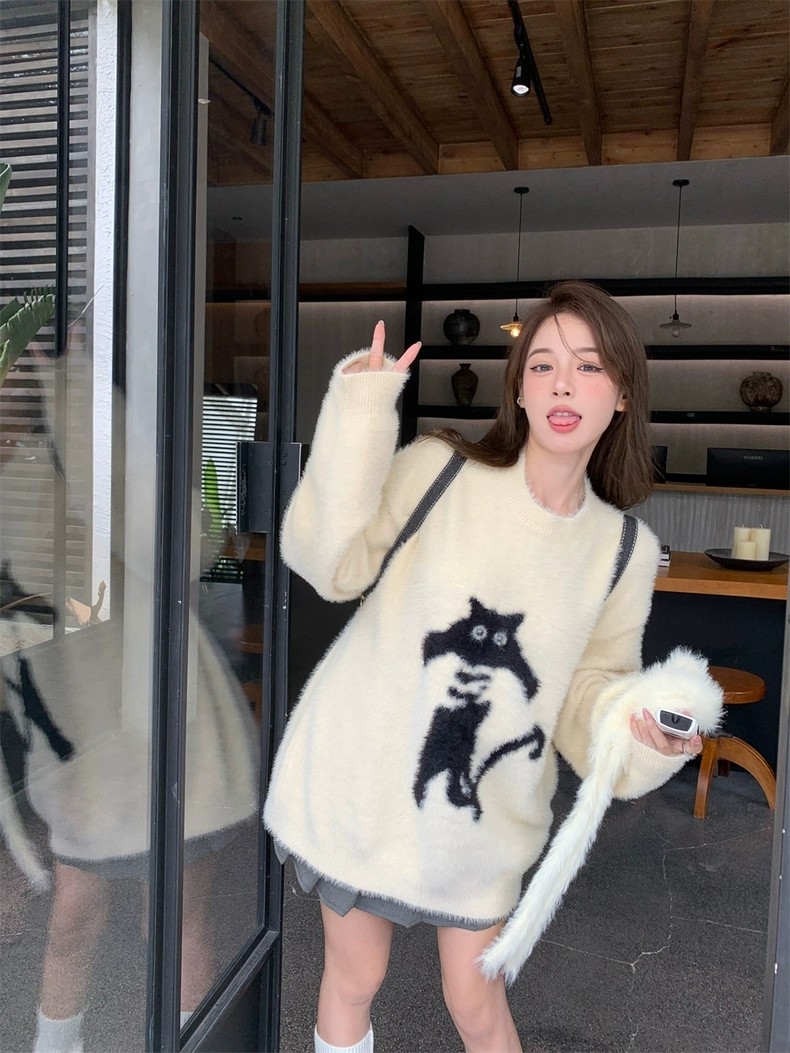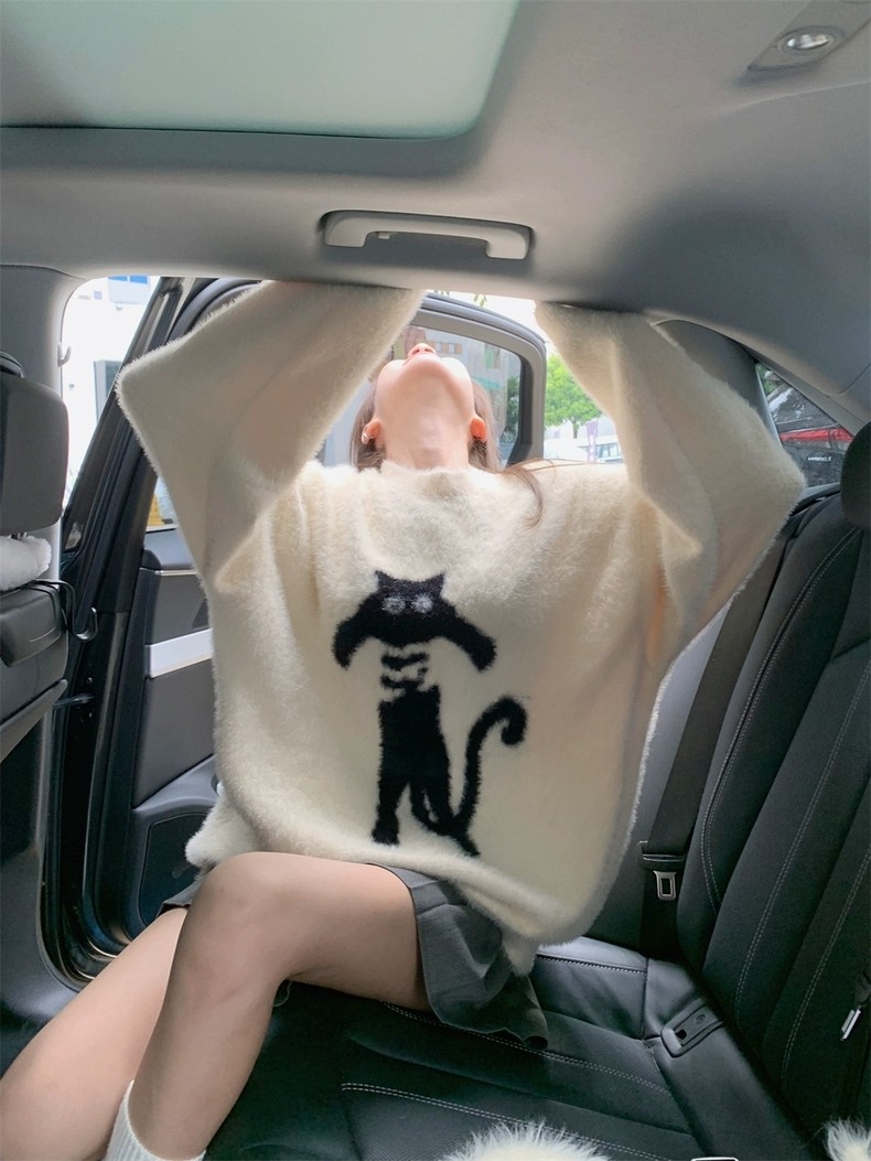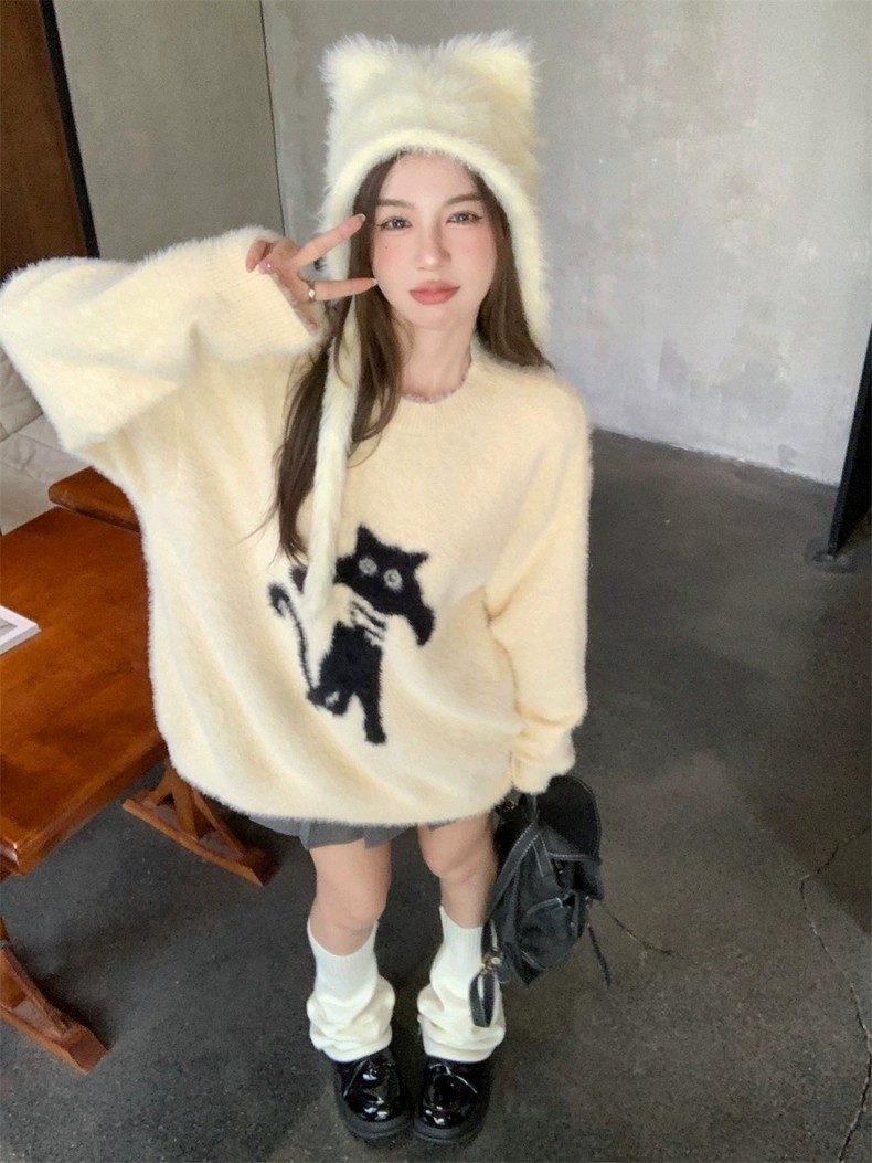 可愛貓咪提花毛絨長袖毛衣女秋冬季軟糯寬鬆水貂絨學生上衣慵嬾風